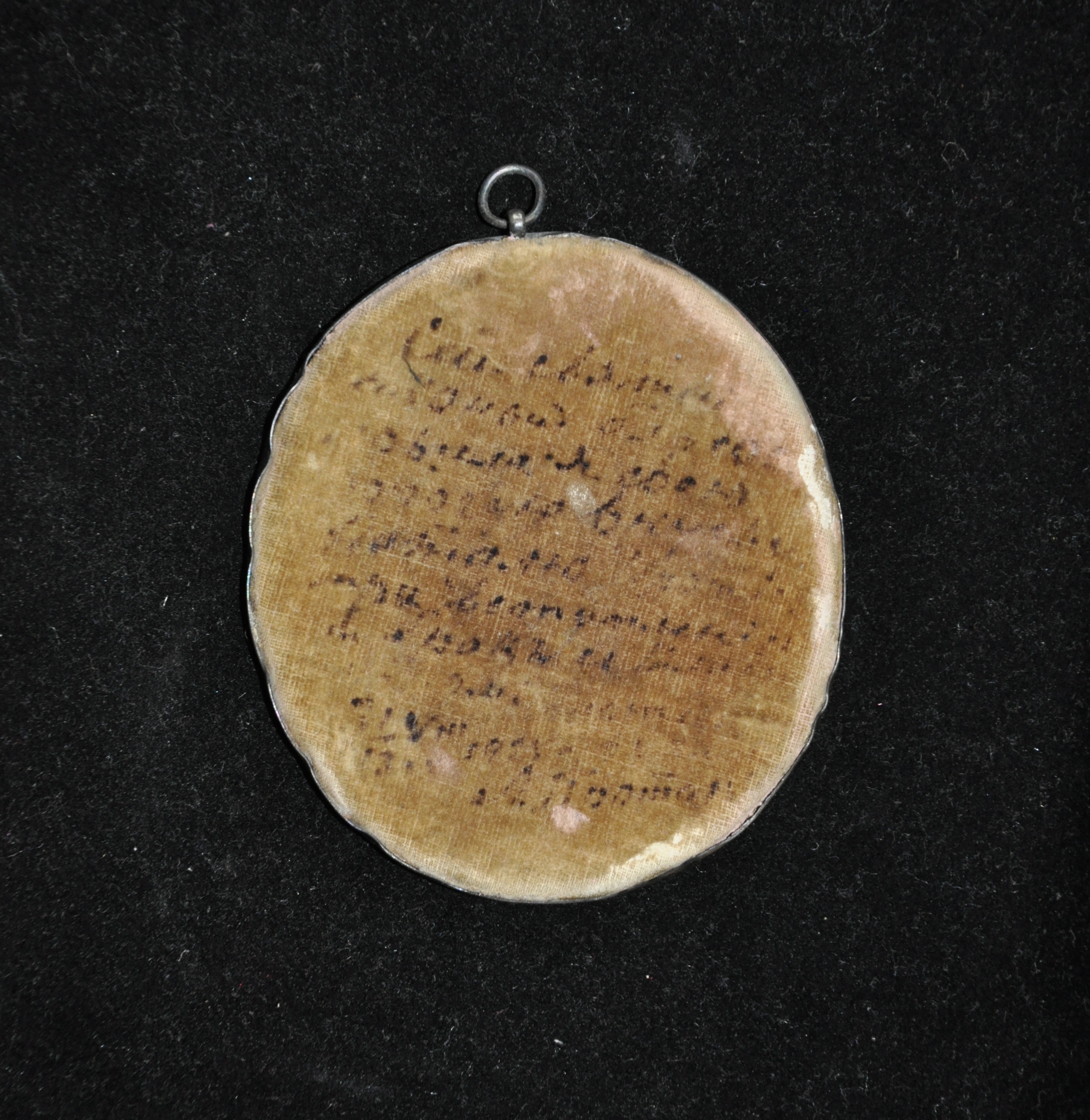 Au dos, sur un velours marron usé, inscription manuscrite en cyrillique indiquant le destinataire du cadeau en 1925.