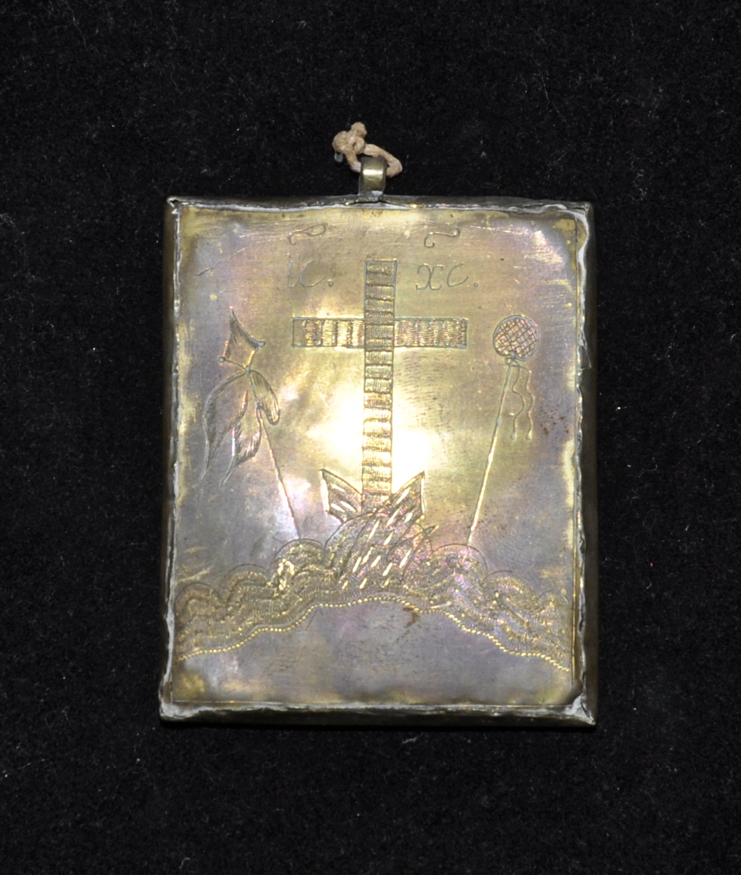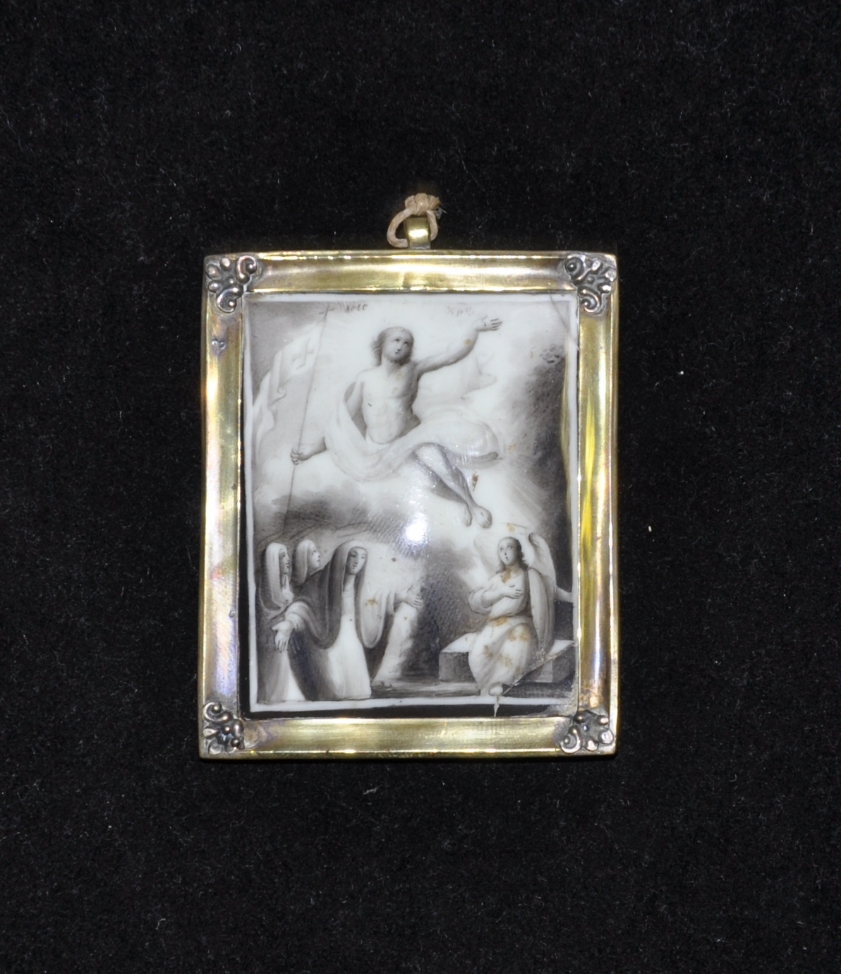 PLAQUE émaillée en grisaille représentant la RÉSURRECTION du CHRIST, sortant du Tombeau. Cadre en laiton à palmettes aux écoinçons. Le dos finement gravé de la Croix du Christ et des instruments de la Passion.