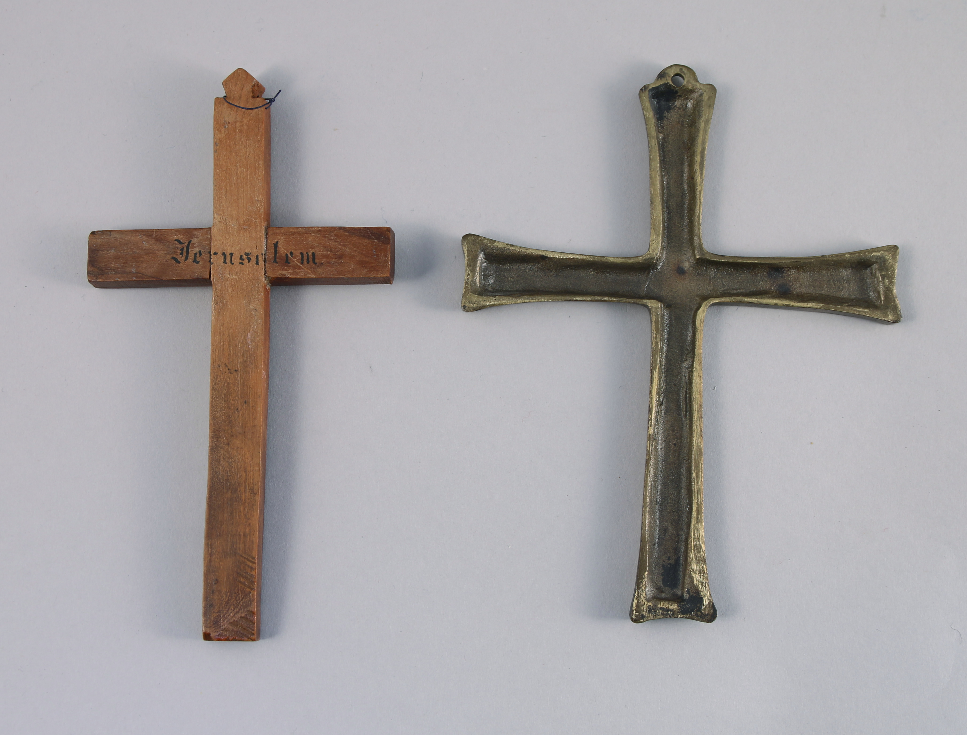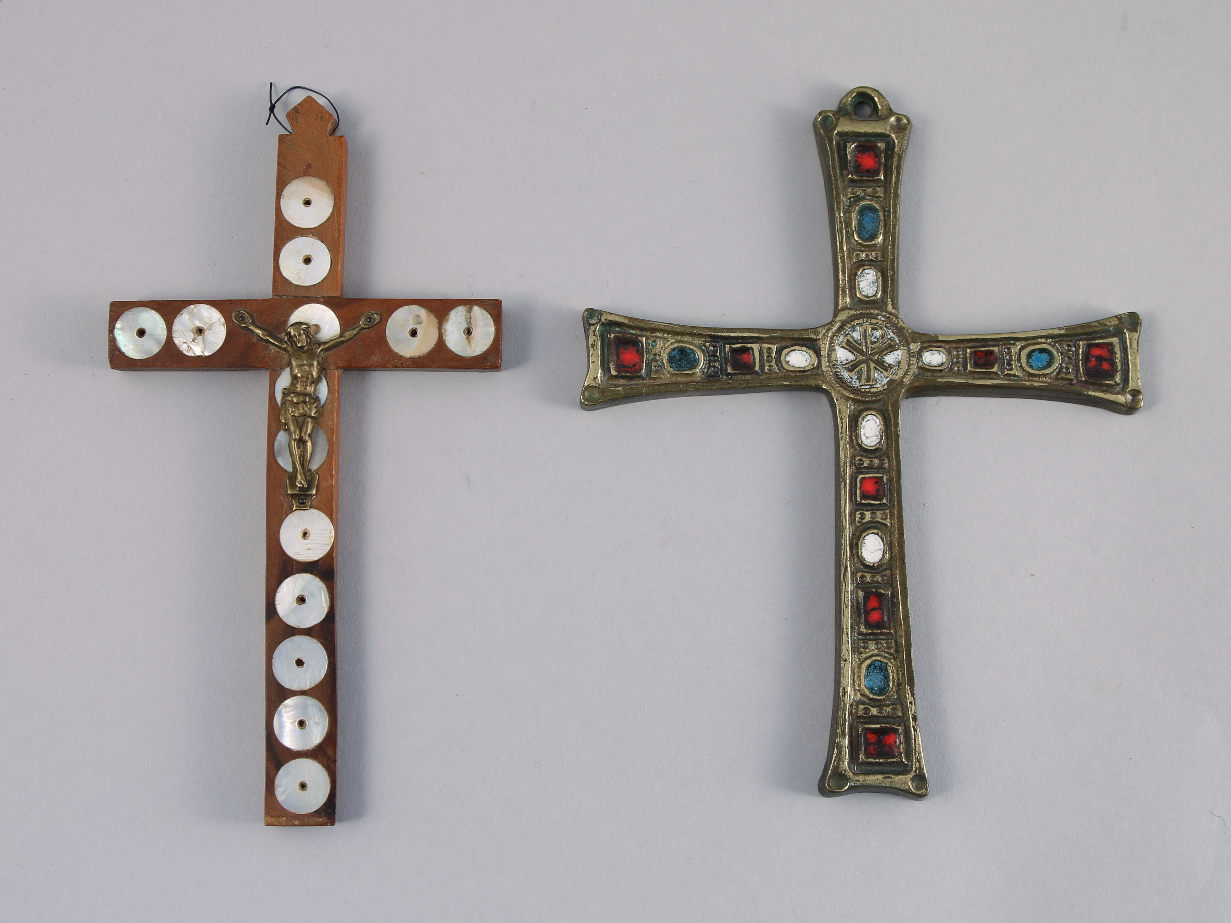 JOINT : CRUCIFIX en bois incrusté de disques de nacre marqué "Jérusalem" et CROIX en laiton émaillé. Haut. 16,5 cm.