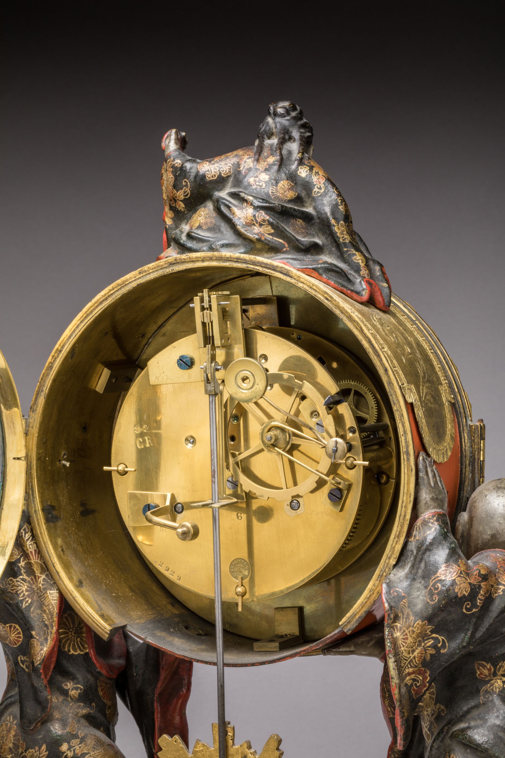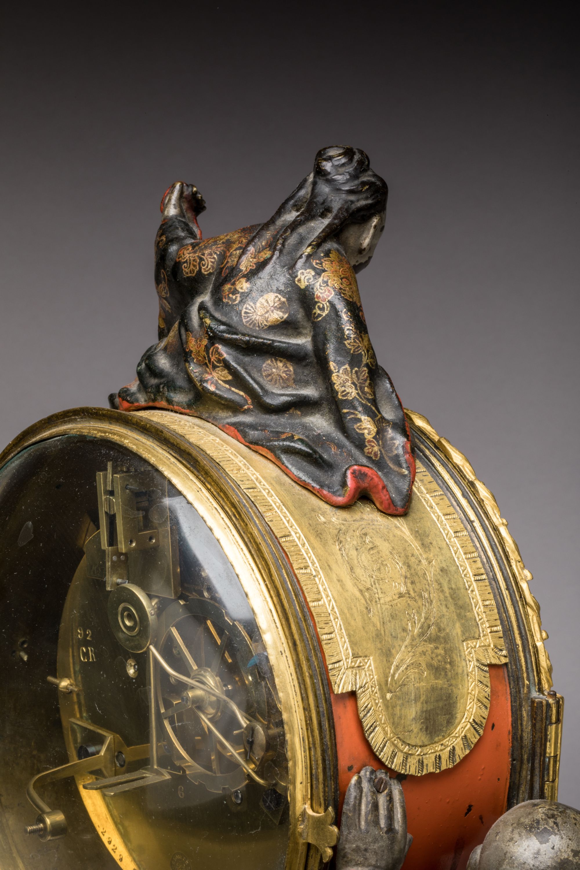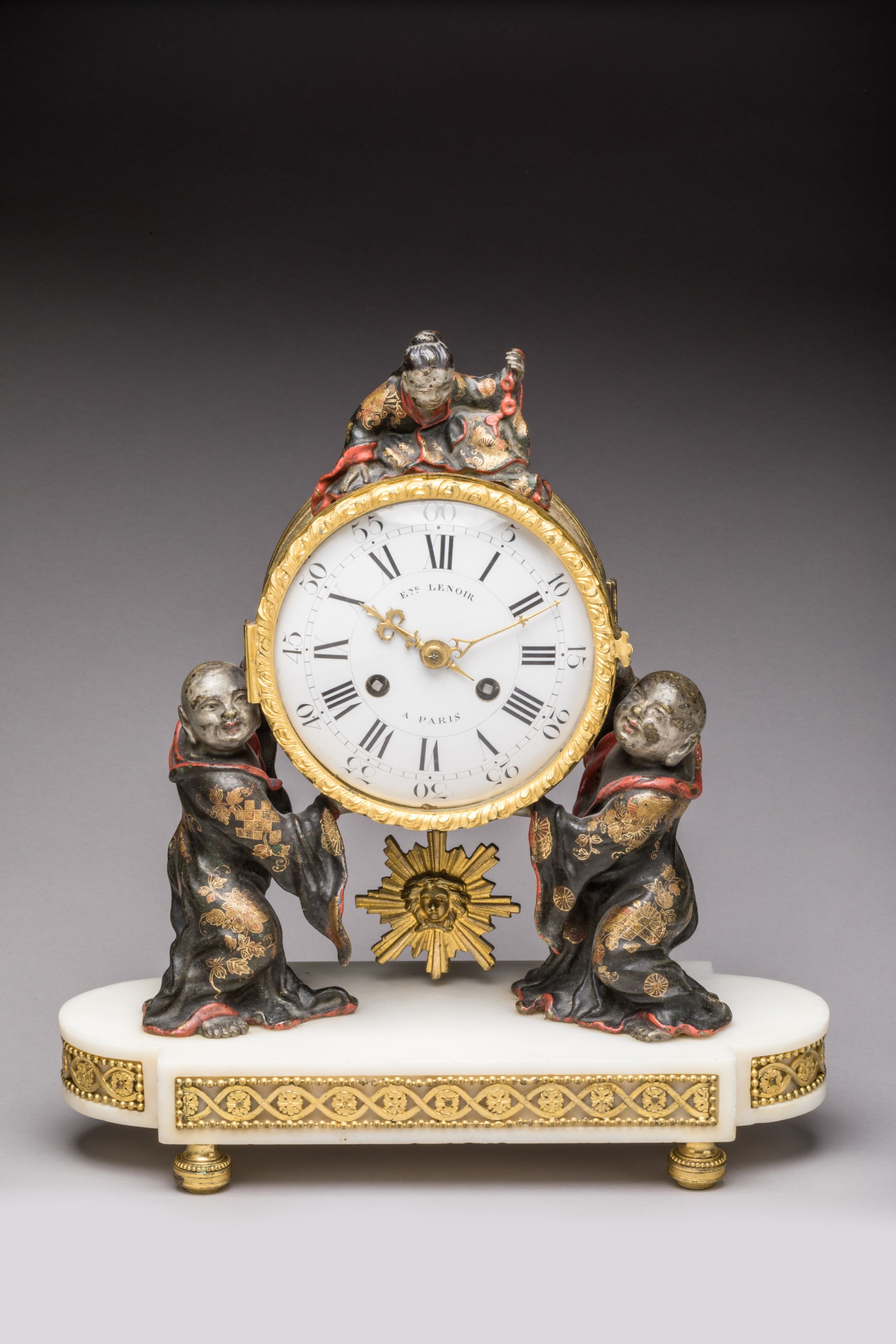 en bronze laqué et doré. Deux des magots soutiennent le cadran circulaire, entourant le dernier qui est juché à califourchon sur le mouvement. Leurs vêtements sont décorés de motifs de fleurs en laque or et rouge à fond noir à la façon de la Chine, dit vernis Martin. Le cadran émaillé blanc de forme circulaire signé "Ene Lenoir à Paris", pour Étienne Lenoir ? Les heures en chiffres romains et les minutes en chiffres arabes. Le boîtier en métal laqué rouge surmonté d'une plaque finement gravée de rinceaux et de franges.
