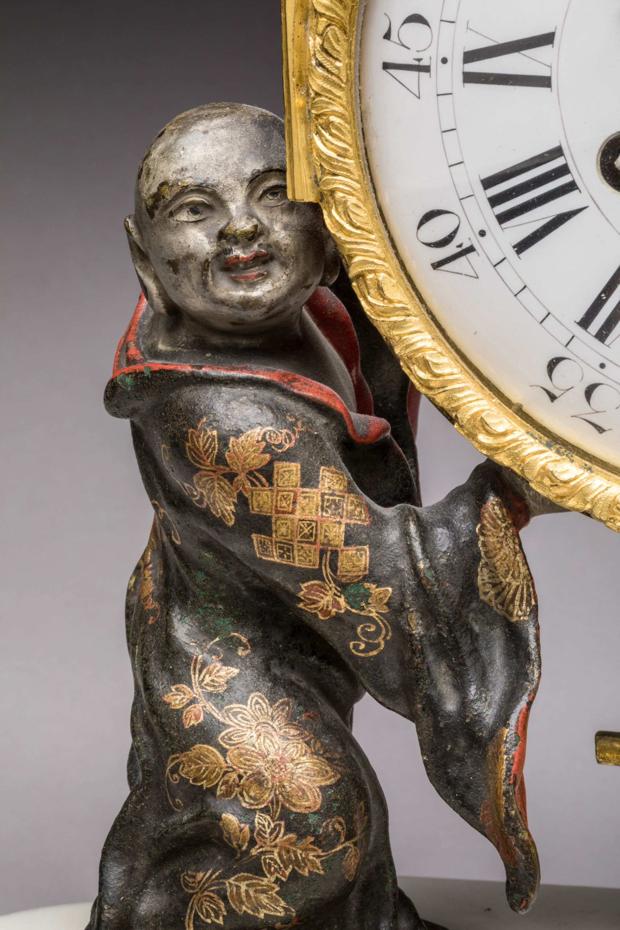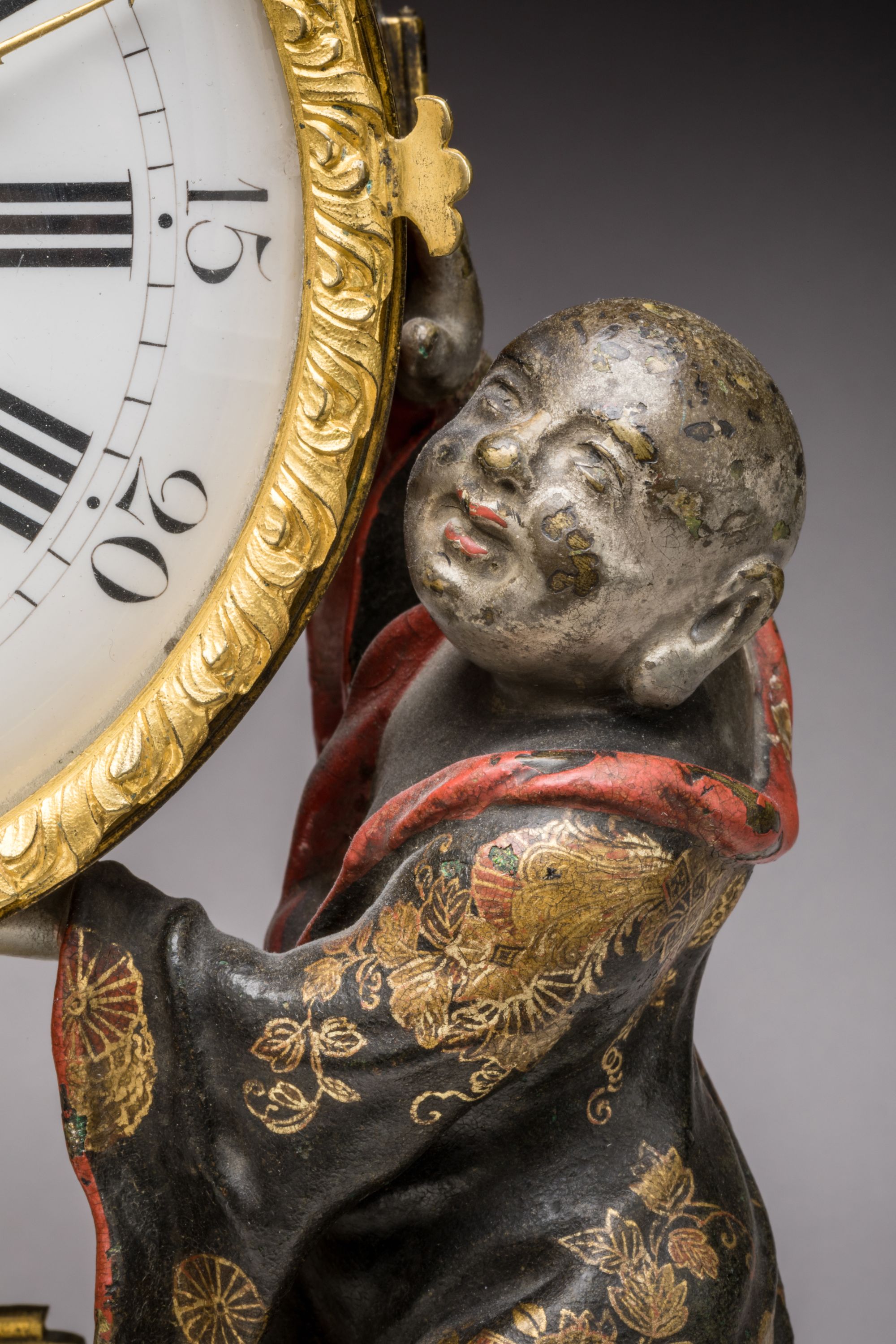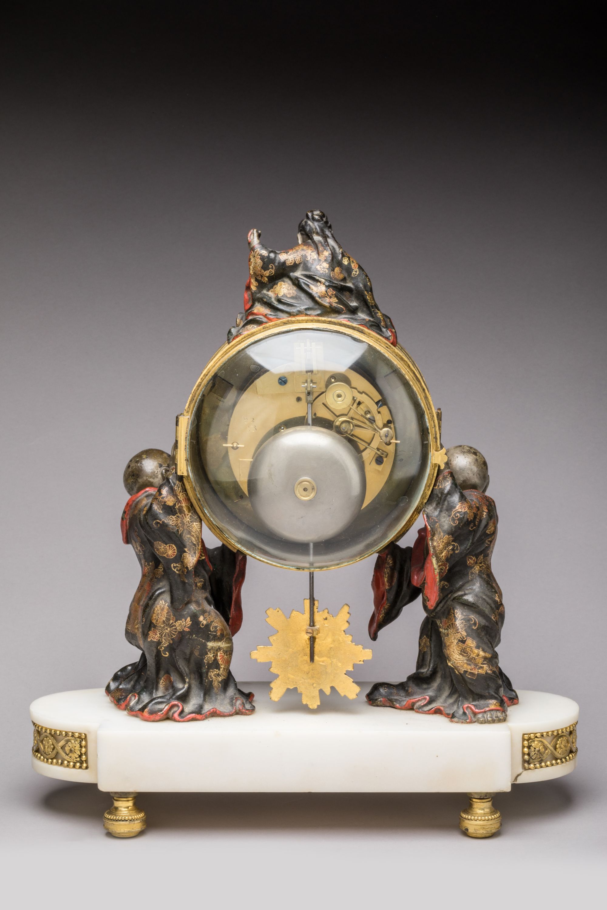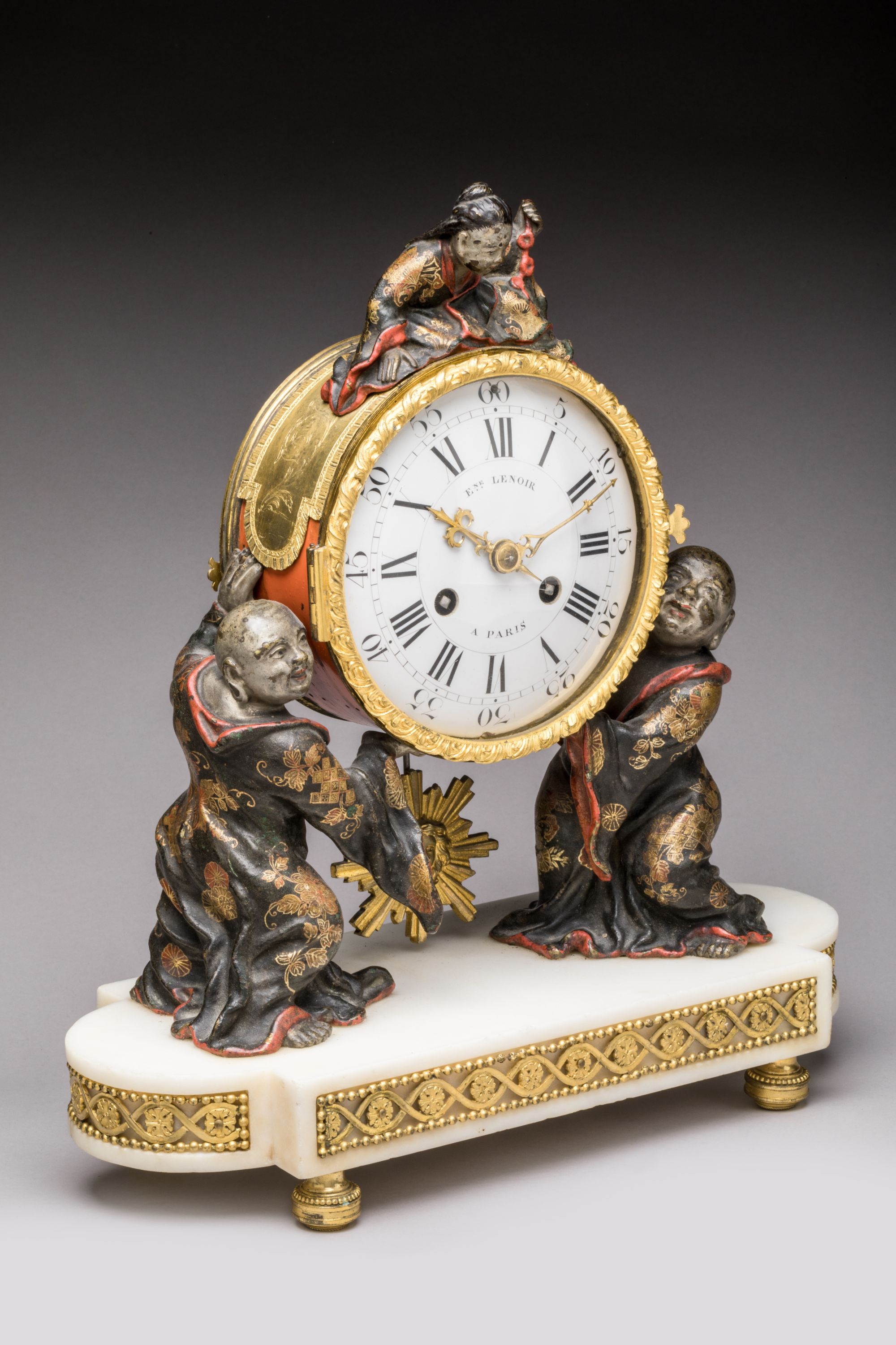en bronze laqué et doré. Deux des magots soutiennent le cadran circulaire, entourant le dernier qui est juché à califourchon sur le mouvement. Leurs vêtements sont décorés de motifs de fleurs en laque or et rouge à fond noir à la façon de la Chine, dit vernis Martin. Le cadran émaillé blanc de forme circulaire signé "Ene Lenoir à Paris", pour Étienne Lenoir ? Les heures en chiffres romains et les minutes en chiffres arabes. Le boîtier en métal laqué rouge surmonté d'une plaque finement gravée de rinceaux et de franges.