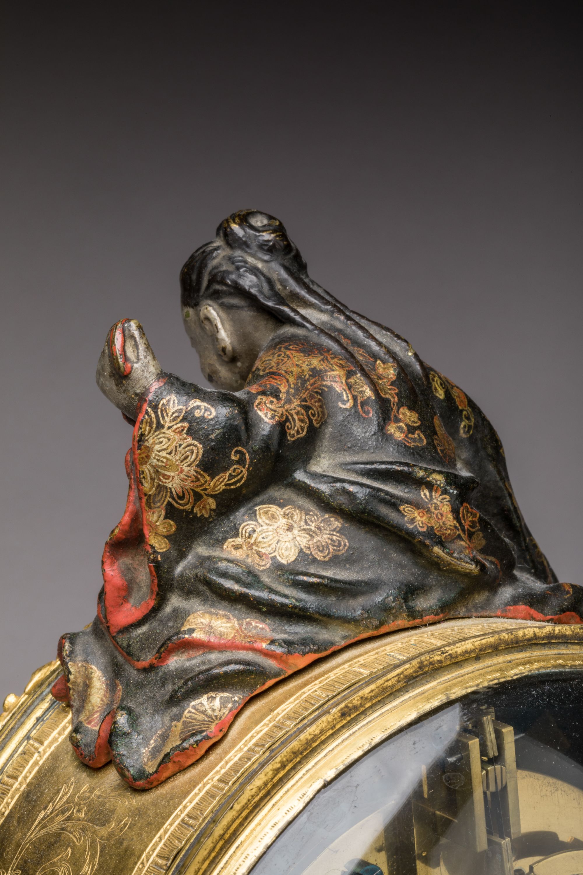 A Louis XV style gilt and lacquered bronze MANTEL CLOCK 'AUX MAGOTS'. Movement dated 1827. First third of 19th century.