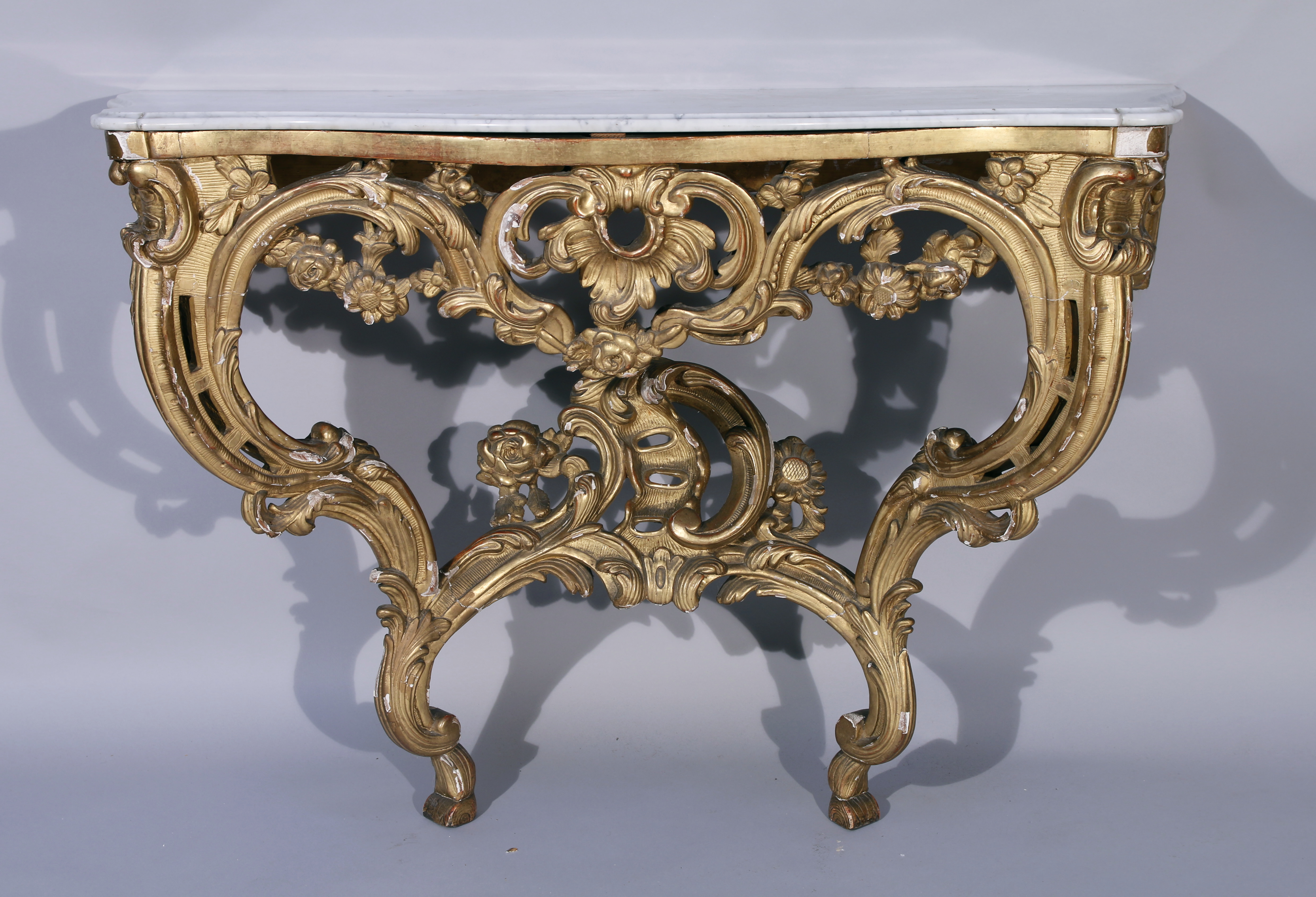 en bois sculpté, stuqué et doré. La ceinture centrée dun tablier à large fleuron d'acanthe présente une riche ornementation ajourée de feuillages stylisés, agrafes et guirlandes de fleurs. Elle repose sur deux pieds cambrés ajourés réunis par une entretoise à décor rocaille.