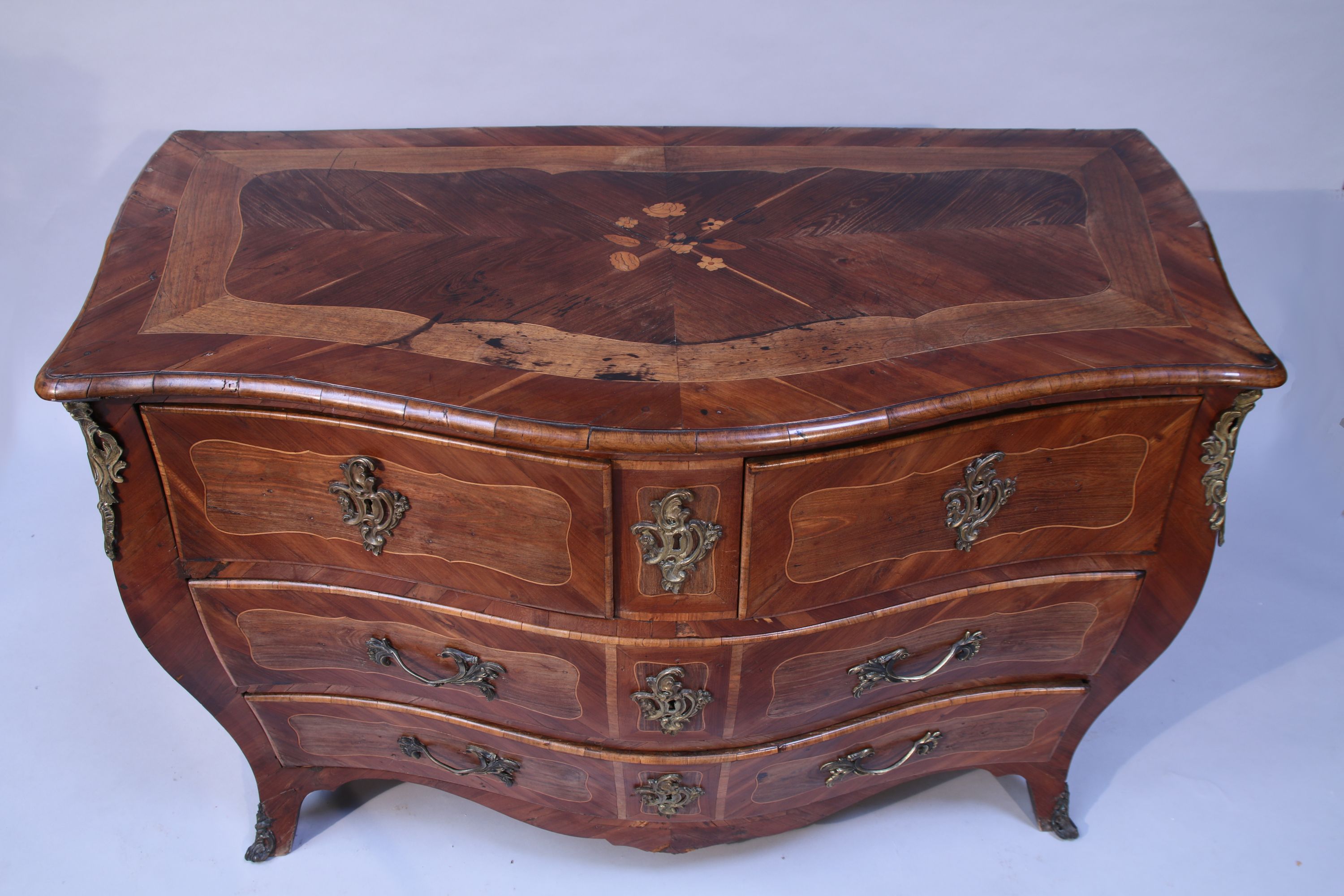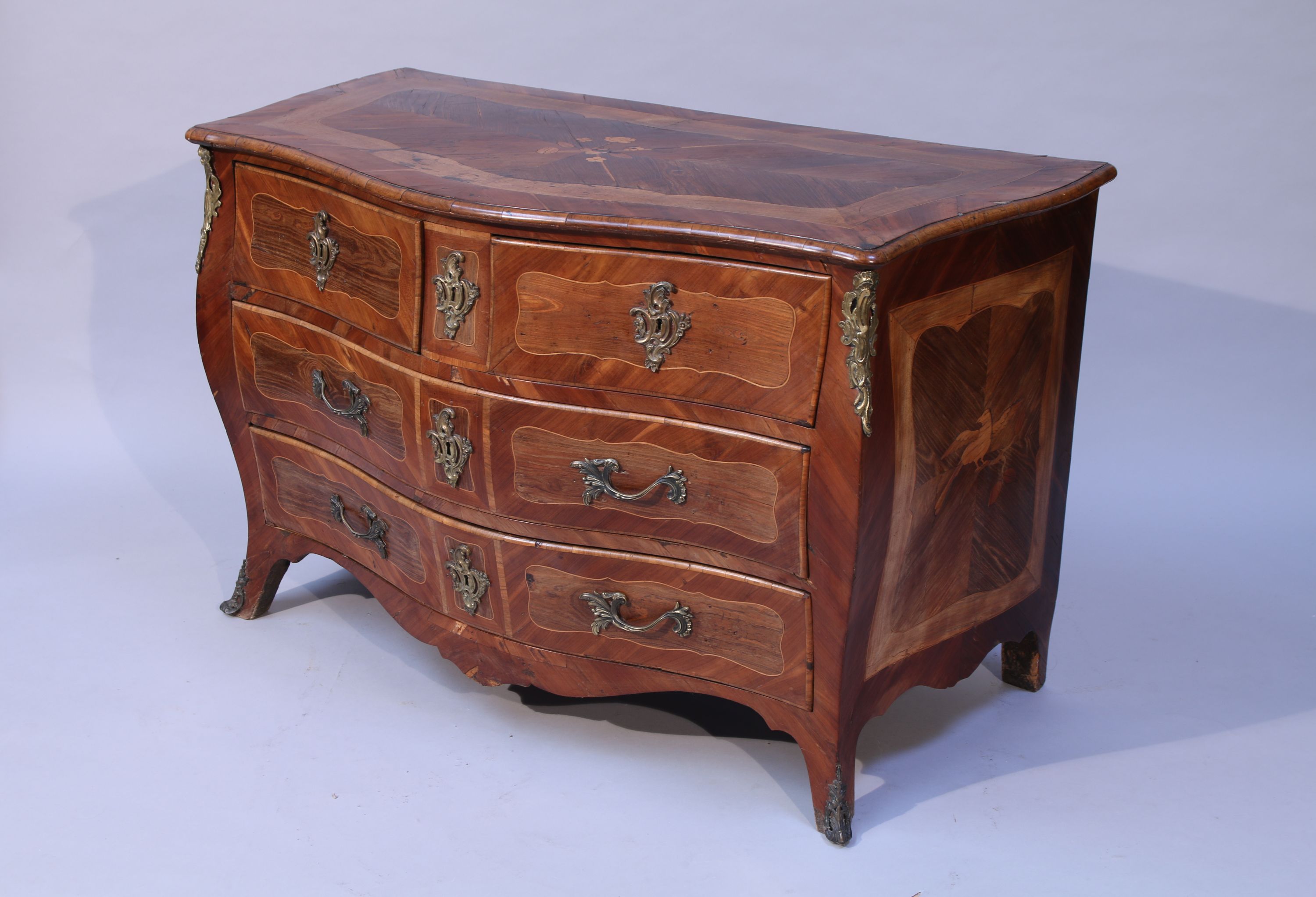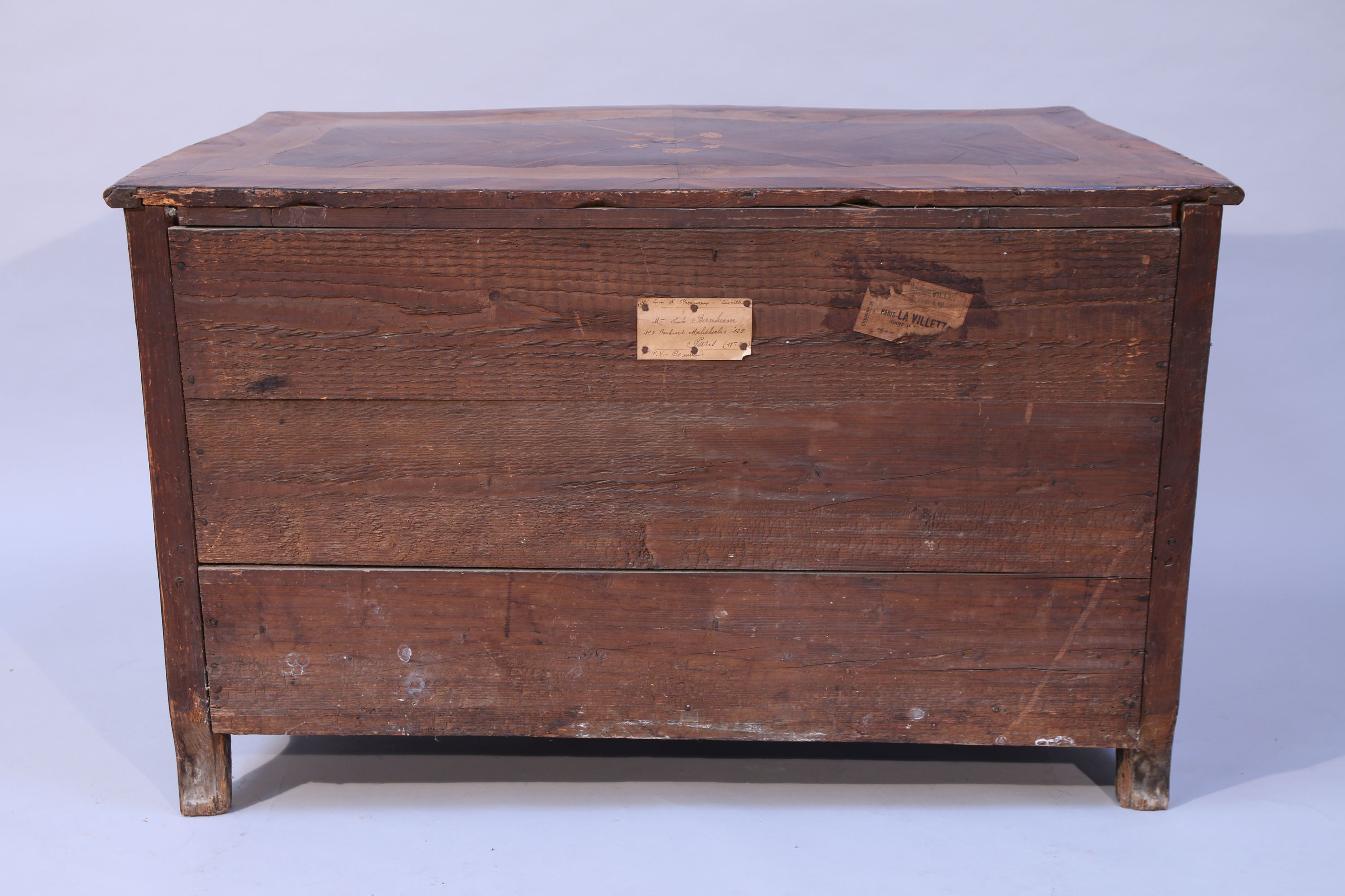 en placage de bois indigènes ouvrant en façade par quatre tiroirs sur trois rangs. Elle reçoit un décor de réserves encadrées de filets de bois clair. Le plateau est centré d'un frisage en "X" agrémenté d'une marqueterie de fleurettes. Frisage que l'on retrouve centré d'un oiseau branché sur les côtés évasés. Traverses inférieures chantournées. Elle repose sur quatre pieds, les antérieurs cambrés. Garniture de bronzes rapportés tels que entrées de serrure, poignées de tirage, chutes et sabots.