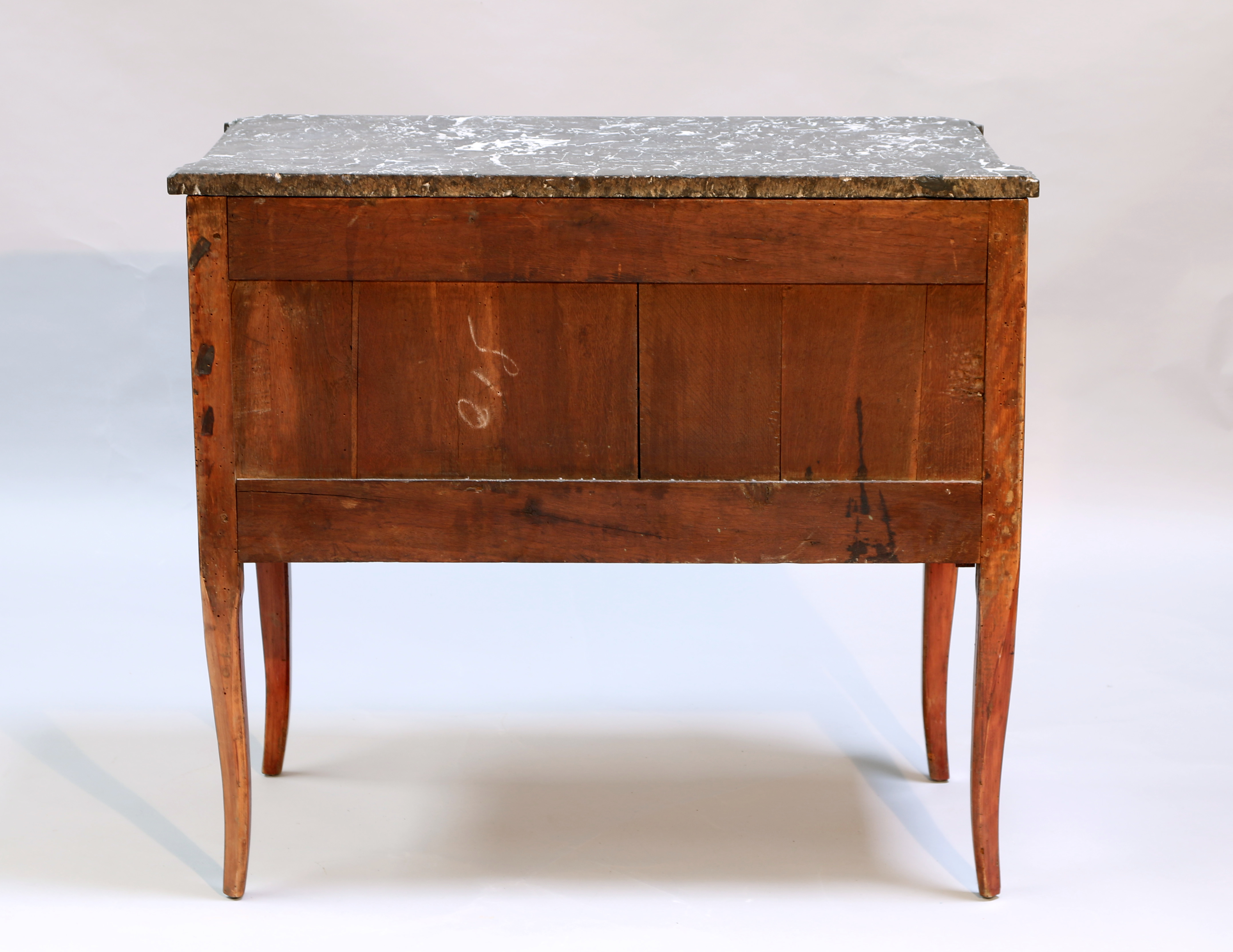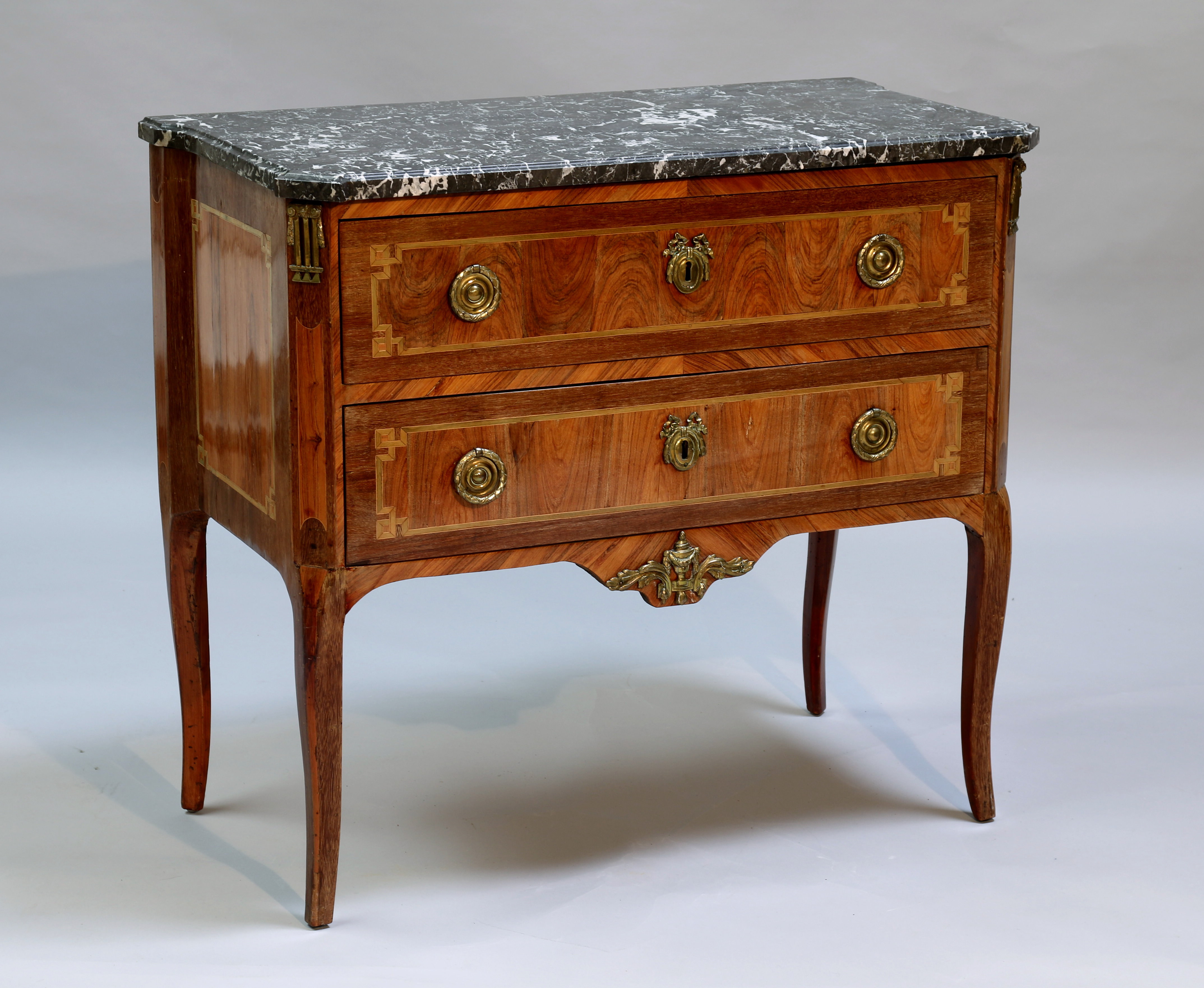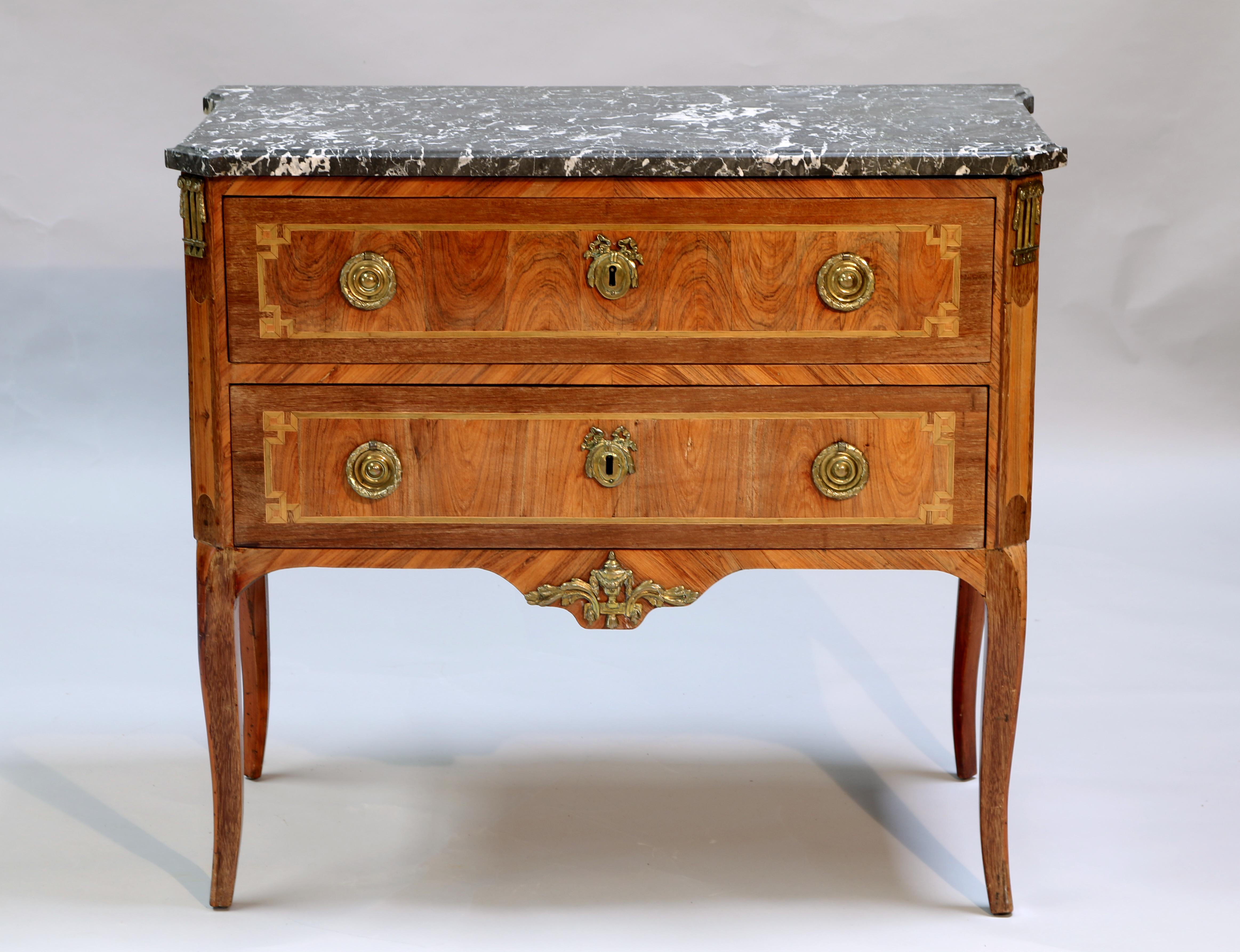 encadré de bois de violette et filets de bois teinté vert. Le tiroir supérieur reçoit un rare frisage ondé. Montants antérieurs à pan coupé, les postérieurs à léger décrochement. Elle repose sur quatre pieds cambrés. Garniture de bronzes ciselés et dorés tels que triglyphes en chute, entrées de serrure, anneaux mobiles et cul-de-lampe.