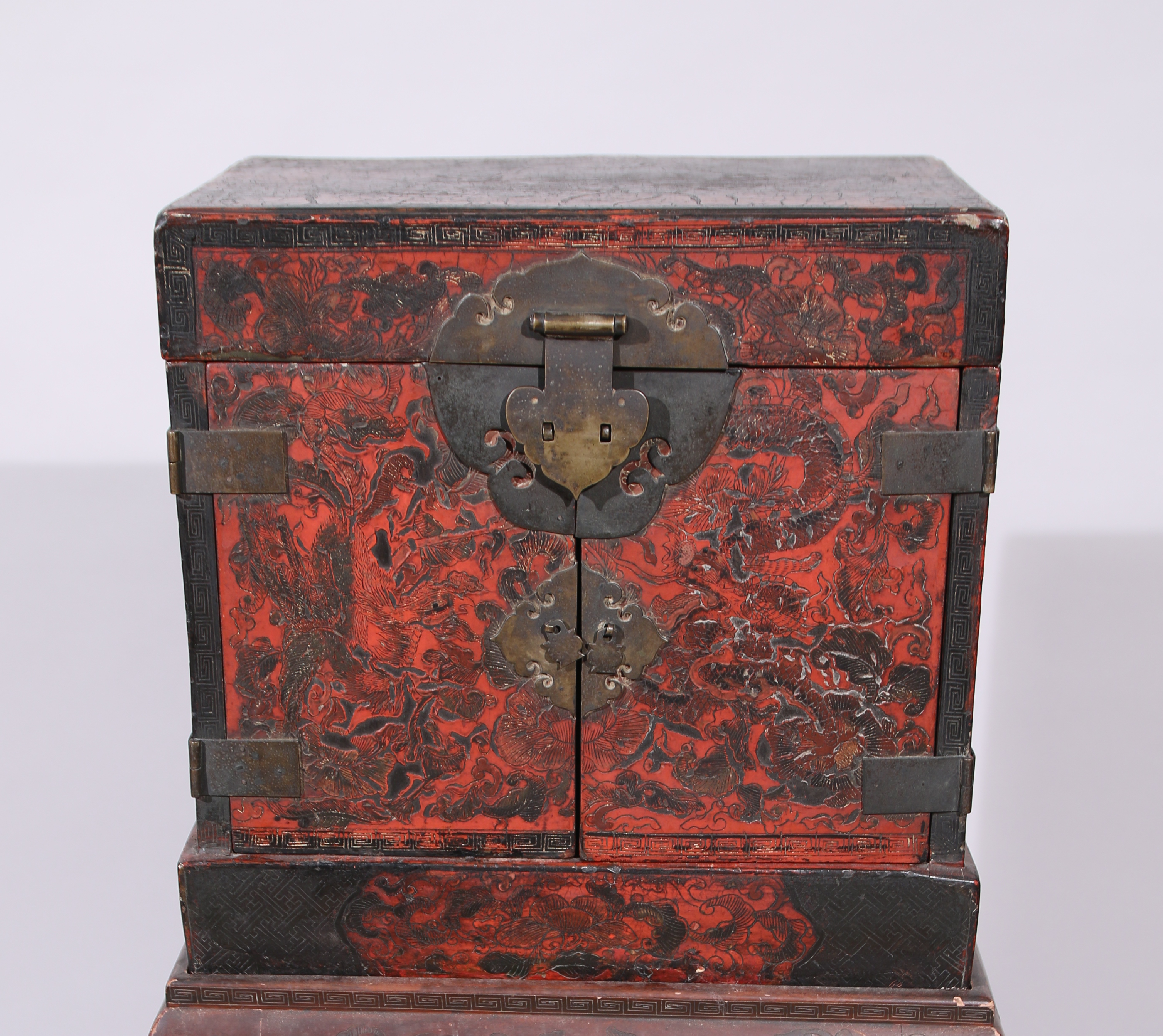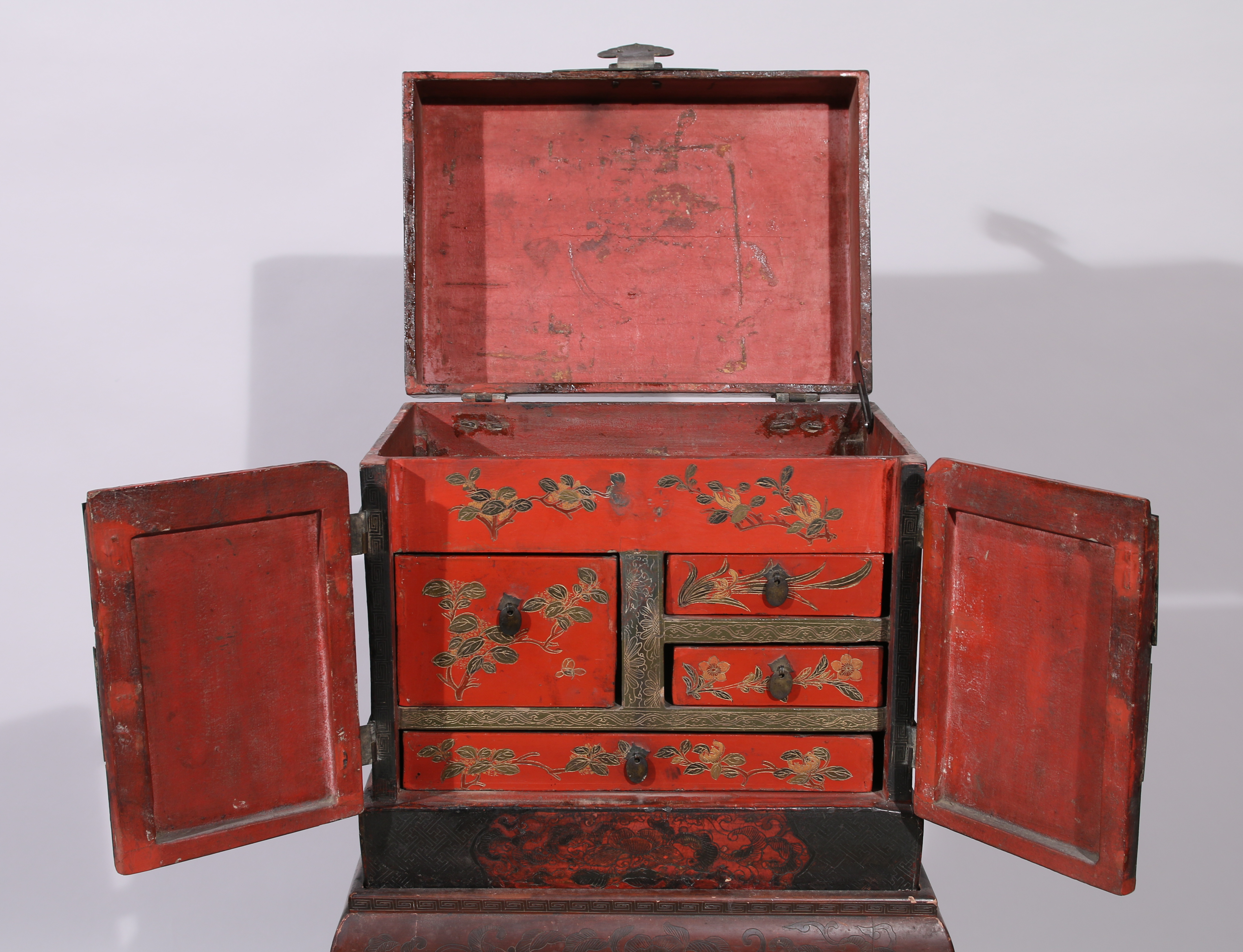 en bois laqué rouge orné d'une serrure, charnières, poignées de transport en laiton. Il ouvre par un couvercle et deux vantaux dissimulant un plateau et quatre tiroirs disposés sur trois rangs. Décor peint et gravé d'un dragon et d'un phénix entourés de leiwen, les côtés figurant des vases fleuris et des chauves-souris.