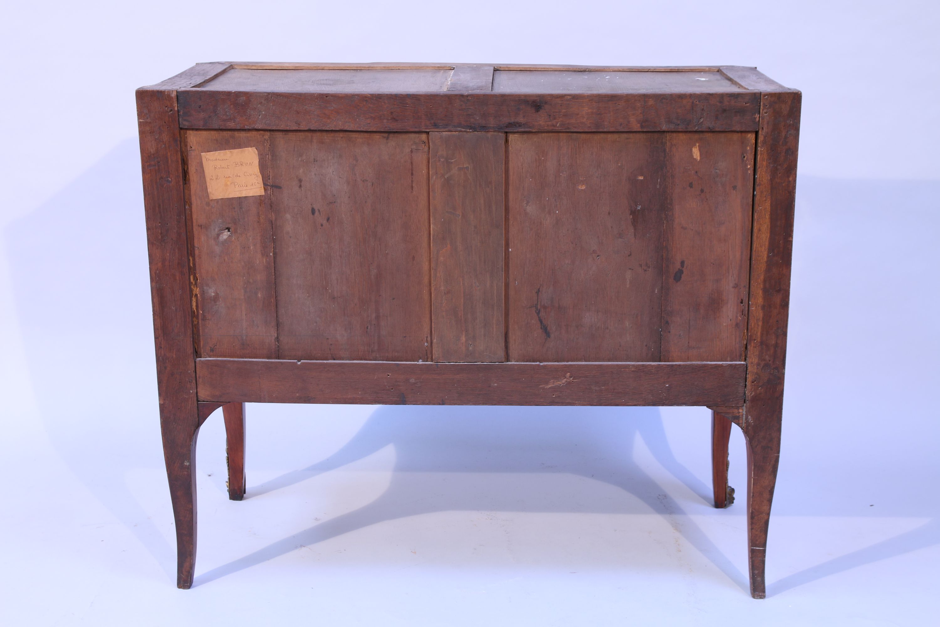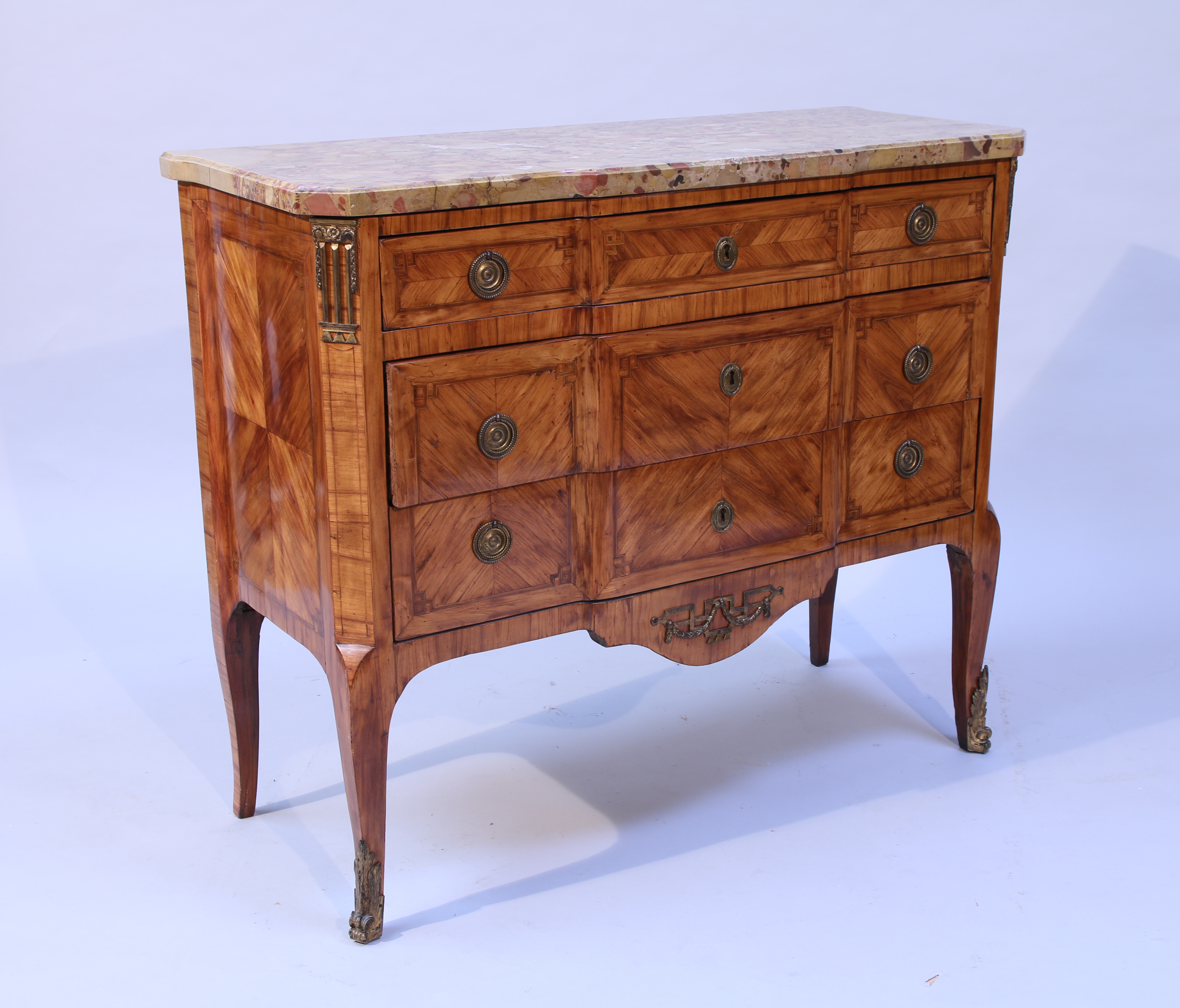 en placage de bois de rose ouvrant en façade par trois tiroirs dont deux sans traverse. Elle reçoit un décor marqueté de frisages en "X" dans des encadrements d'amarante et filets à la grecque. Garniture de bronzes ciselés et dorés tels que entrées de serrure, anneaux mobiles, chutes en triglyphes, tablier et sabots. Elle est coiffée d'un marbre brèche d'Alep.