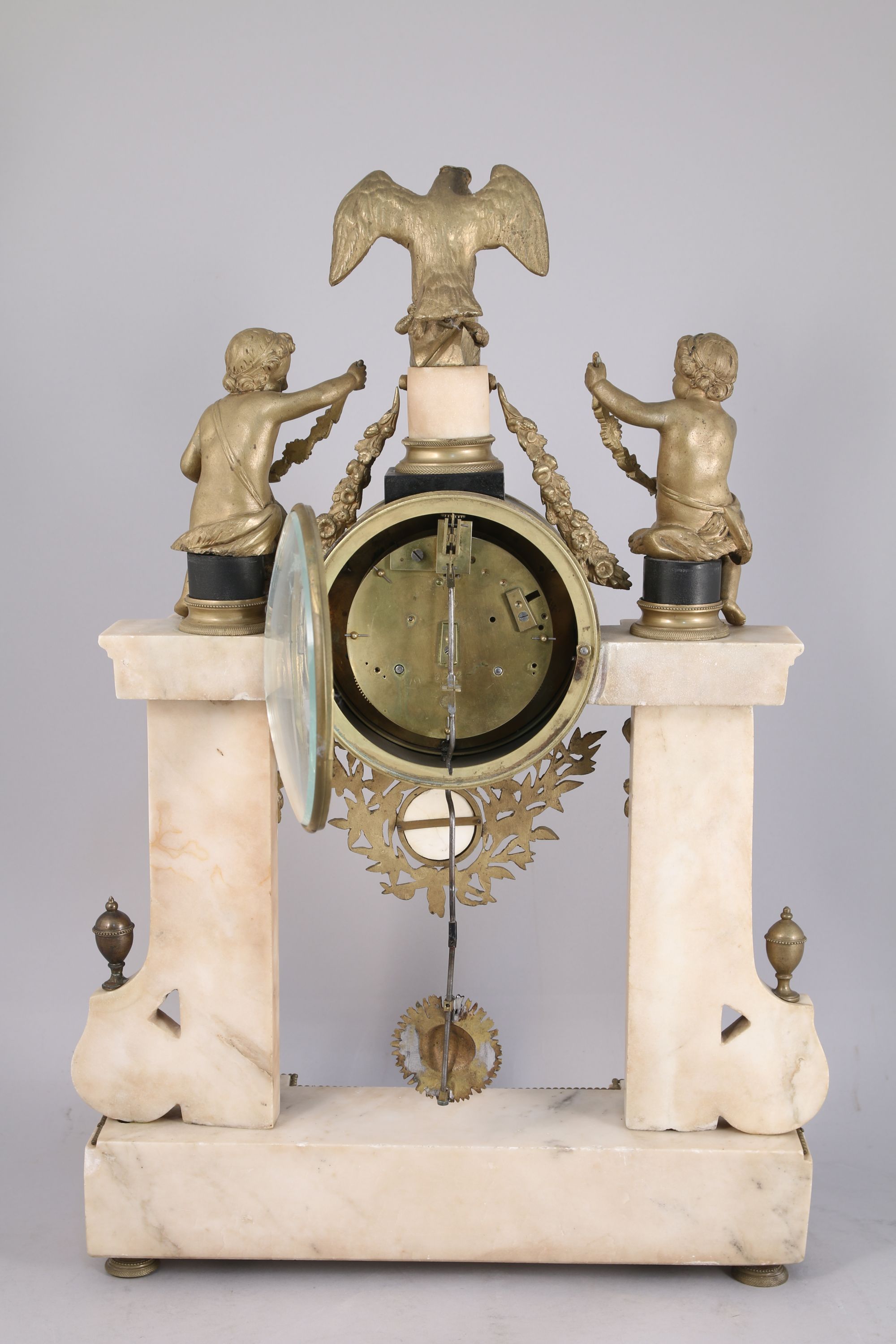 en marbre blanc et bronze doré. Aigle aux ailes déployées tenant un serpent dans ses serres à l'amortissement. L'entablement garni de putti aux guirlandes est supporté par des piliers à volutes, ornés de bustes de femmes sur des gaines aux faisceaux de licteurs. Le cadran circulaire émaillé blanc indique les heures en chiffres romains. Il est orné au-dessous d'un médaillon en biscuit figurant trois femmes vêtues à l'antique. Le balancier prend la forme d'un visage rayonnant. Suspension à plaque.