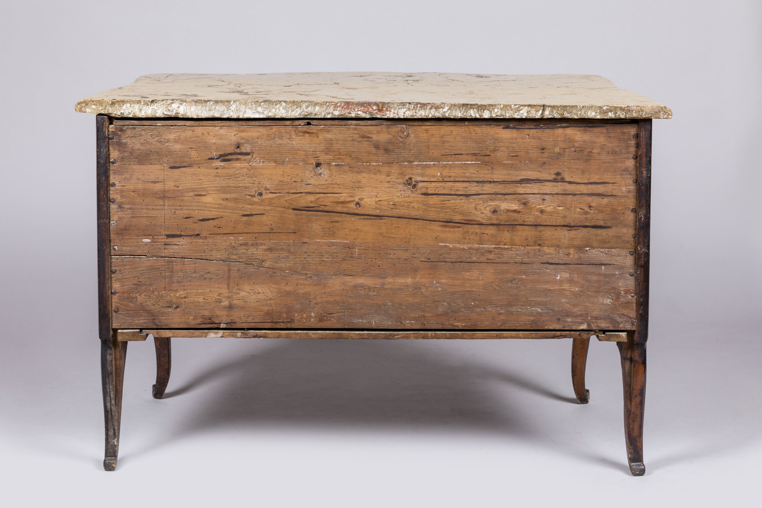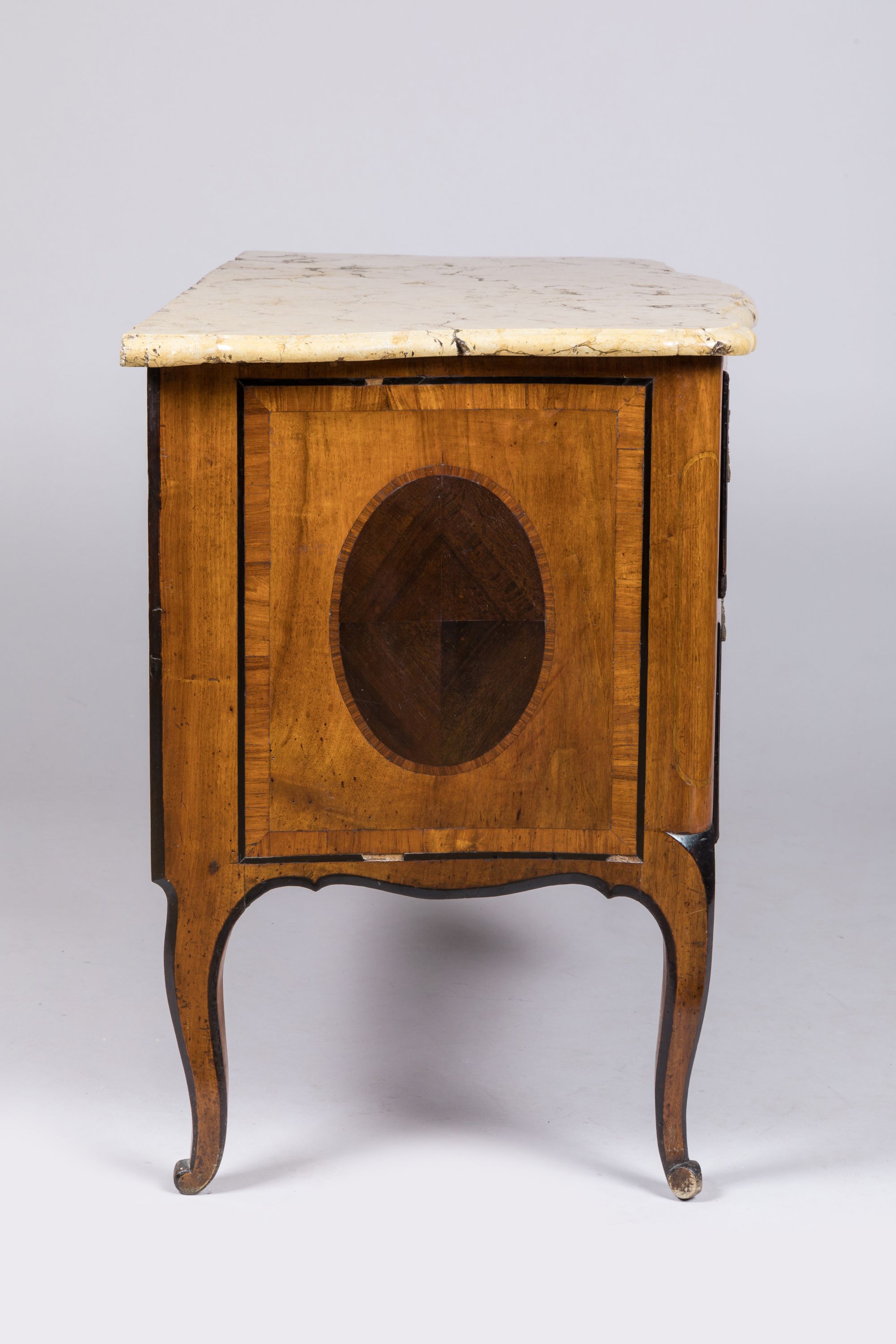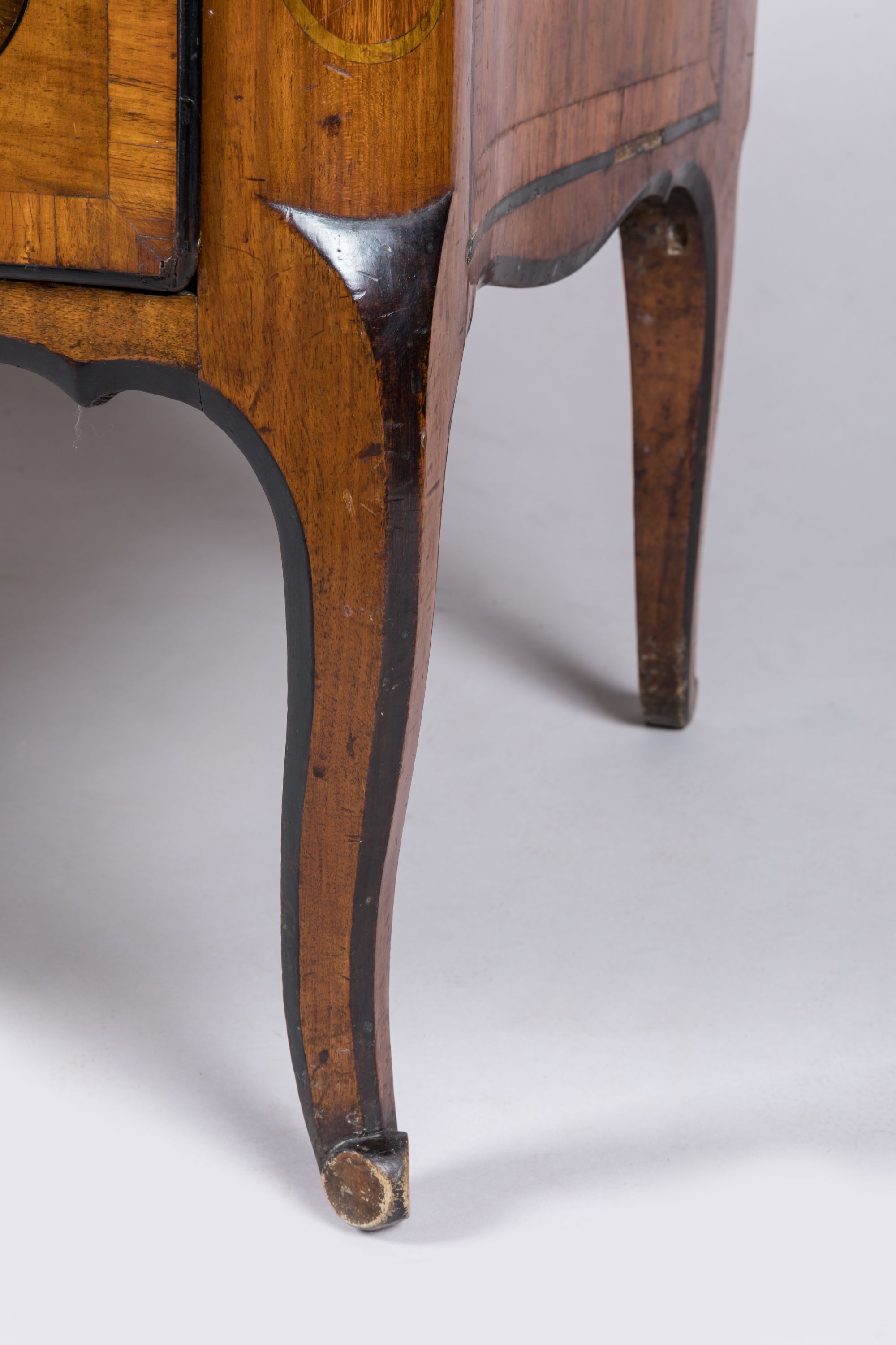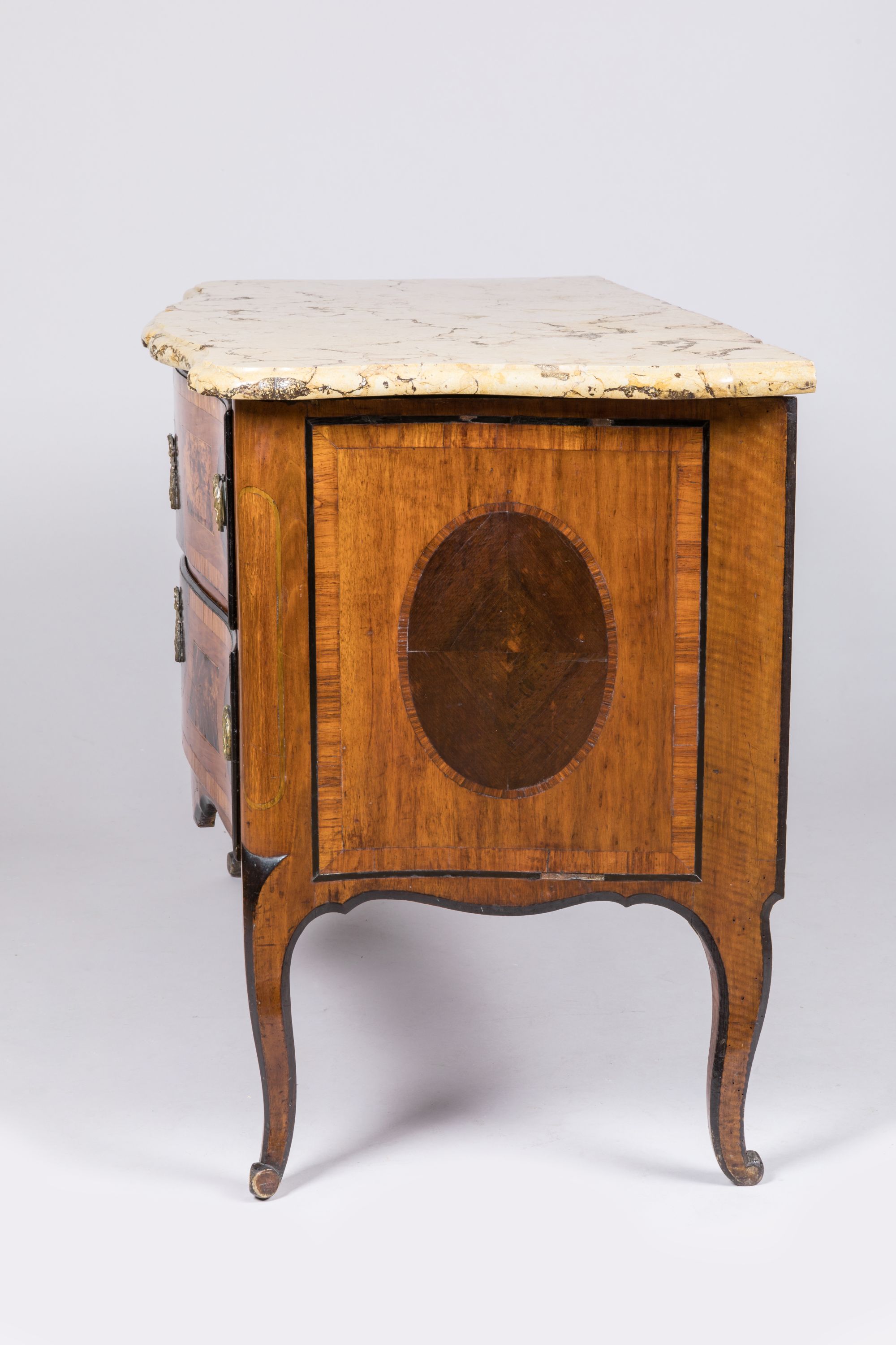 à la forme mouvementée ouvrant par deux tiroirs séparés par une traverse. Reposant sur quatre pieds cambrés " pastille ". Ornée de mains tombantes et serrures en bronze doré.