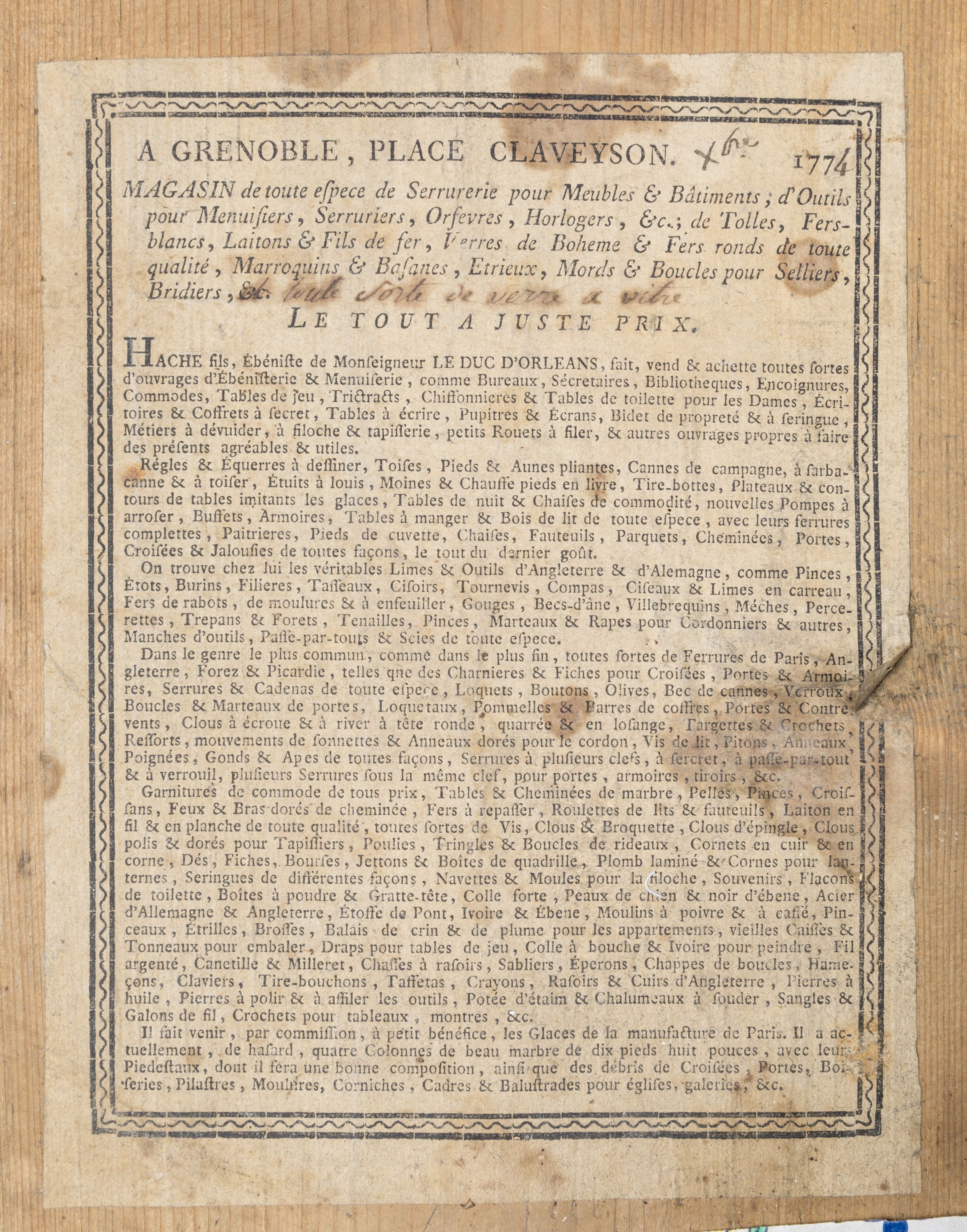 Hache fils, Ébéniste de Monseigneur LE DUC D'ORLÉANS, fait, vend & achette toute sortes d'ouvrages d'Ébénisterie & Menuiserie, comme Bureaux, Secrétaires, Bibliothèques, Encoignures, Commodes, Tables de jeu, Trictracts, Chiffonnieres & Tables de toilette pour les Dames, Écritoires & Coffrets à secret, Tables à écrire, Pupitres & Écrans, Bidet de propreté & à seringue, Métiers à dévuider, à filoche & tapisserie, petits Rouets à filer, & autres ouvrages propres à faire des présents agréables & utiles.
