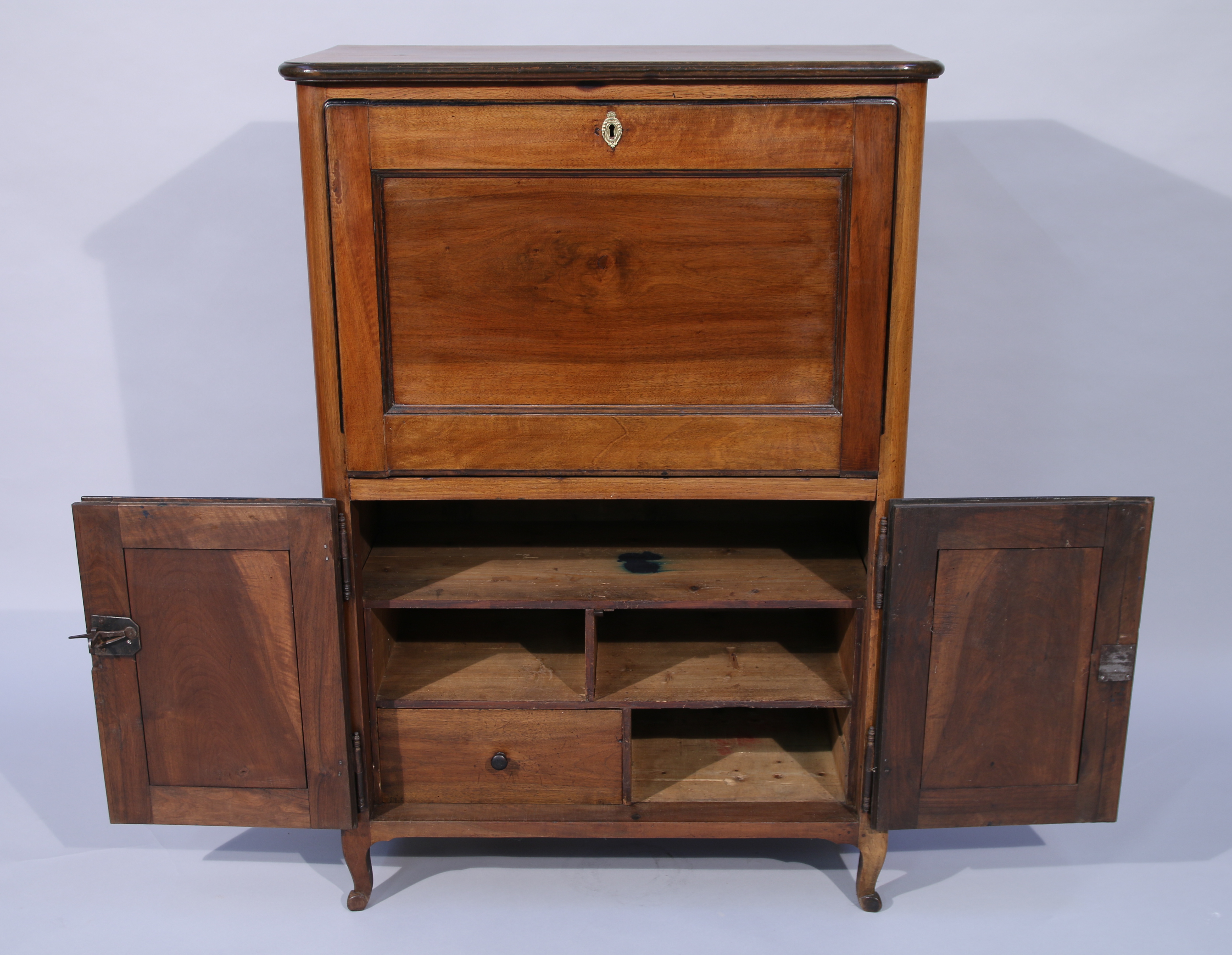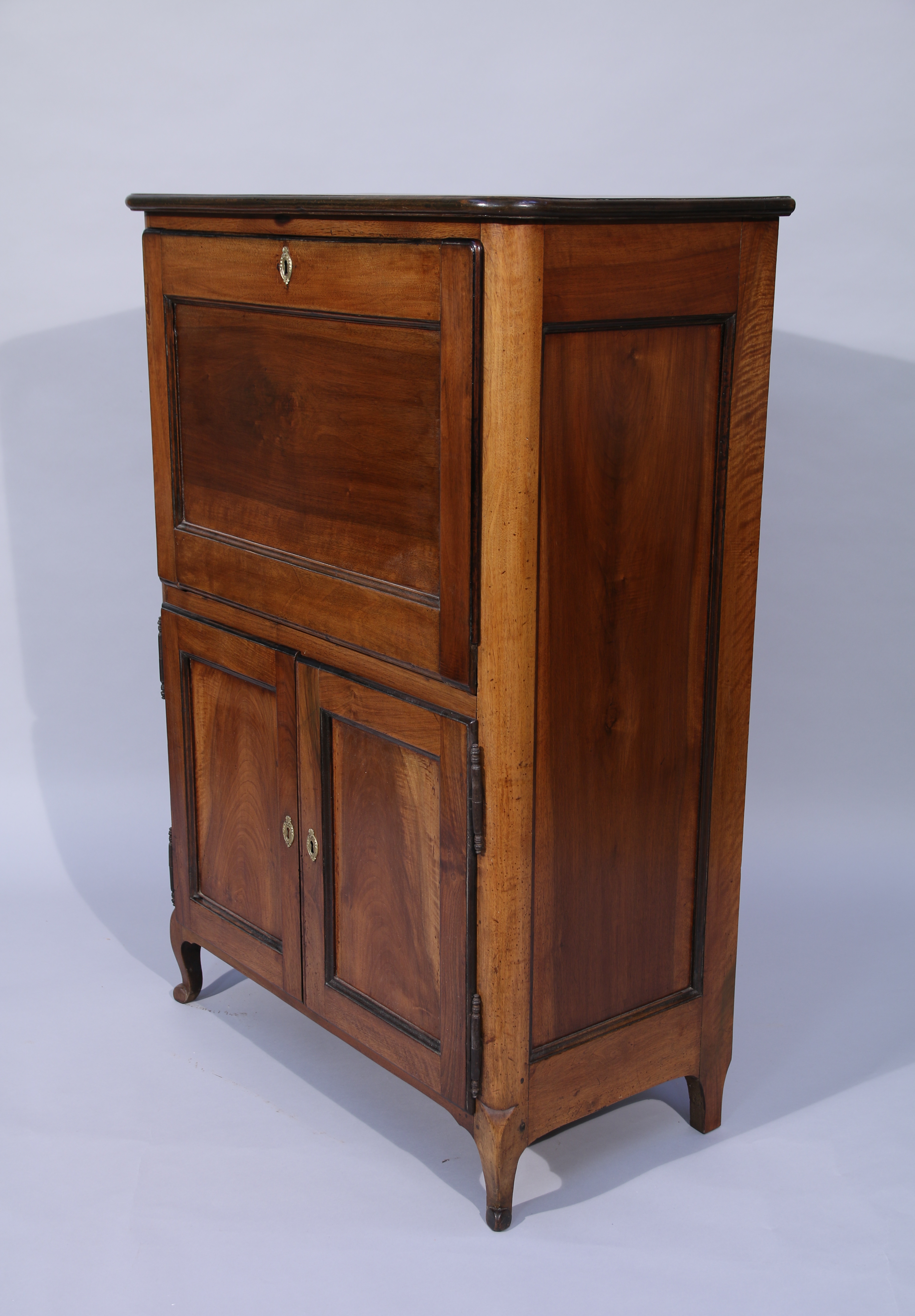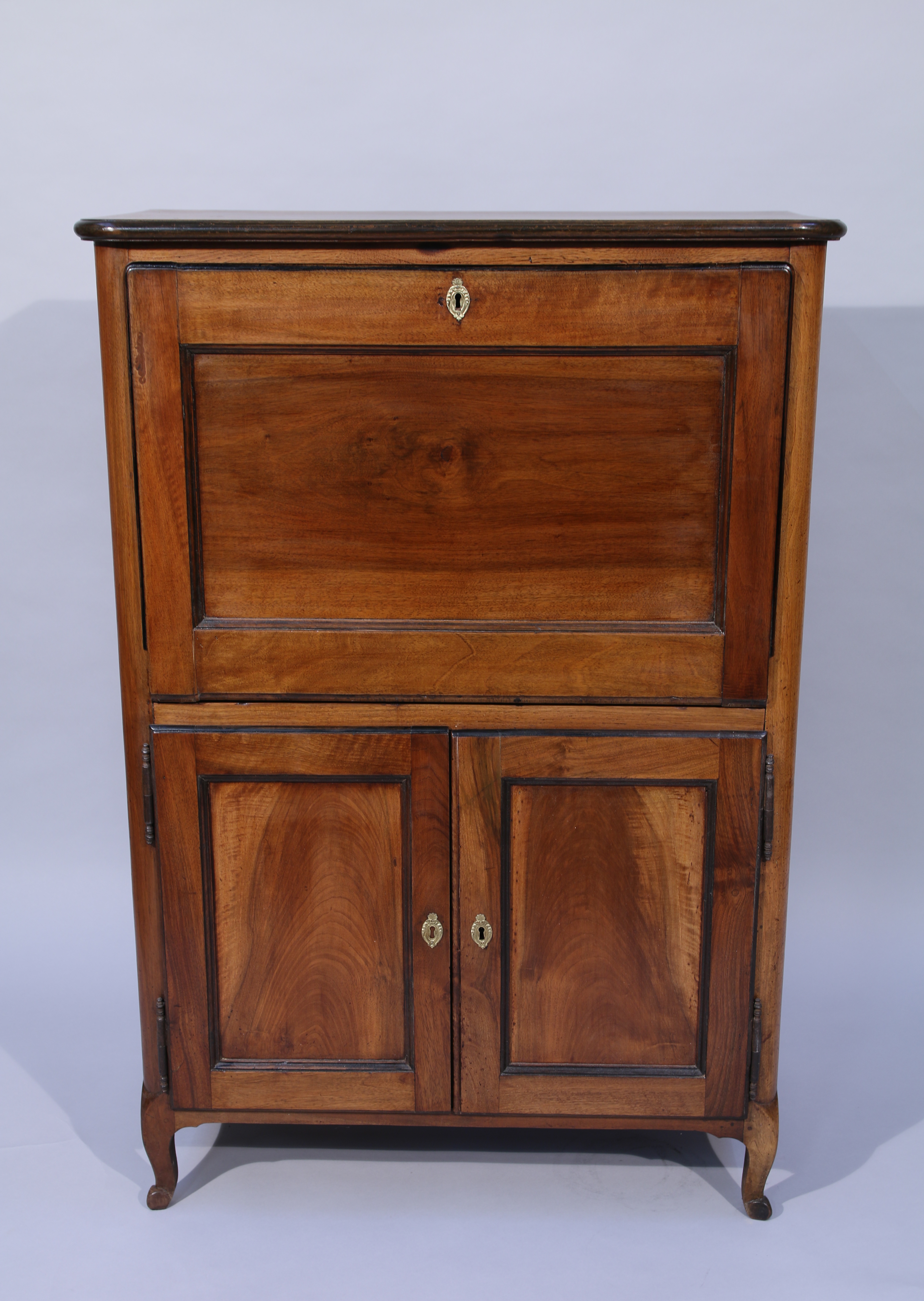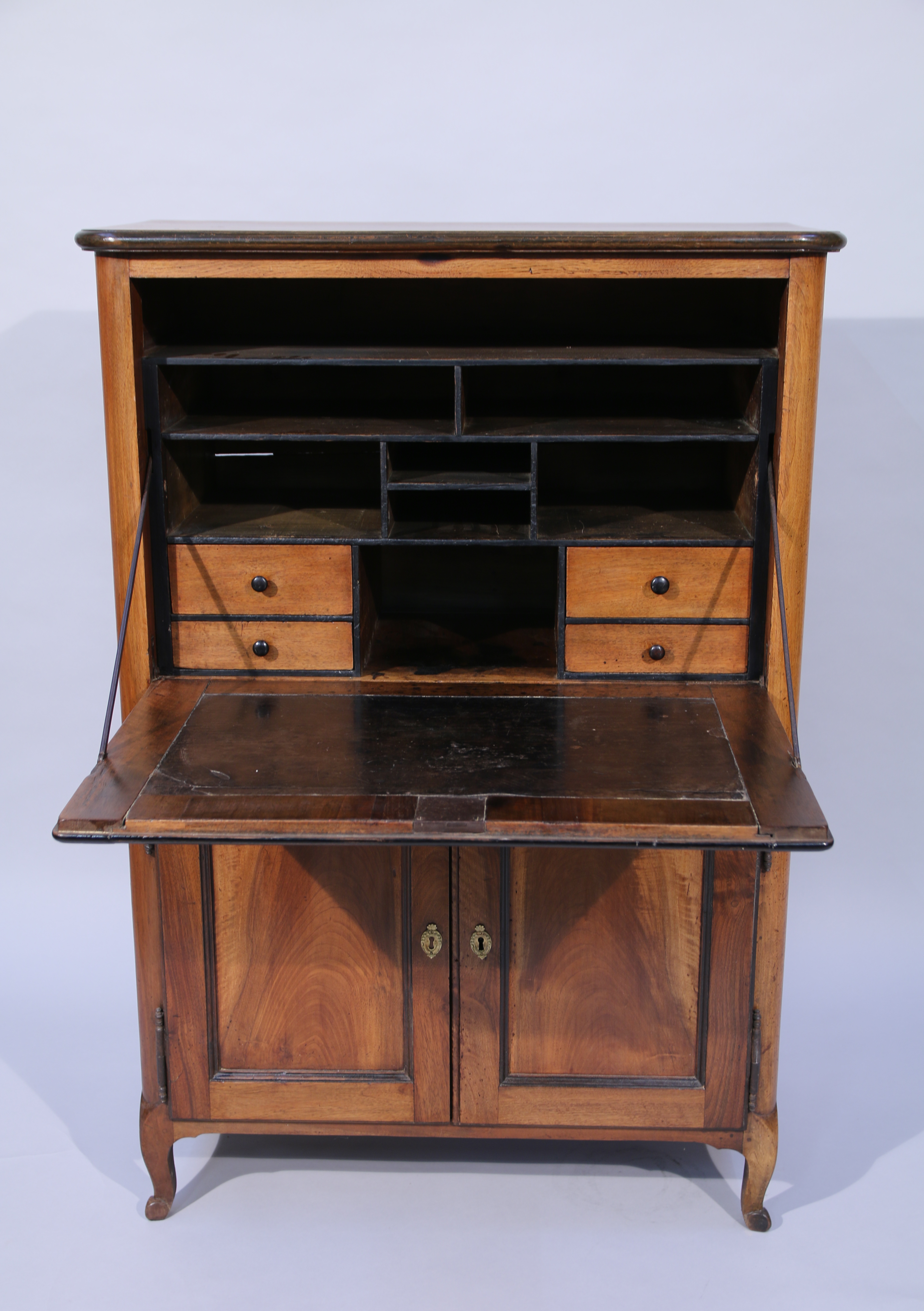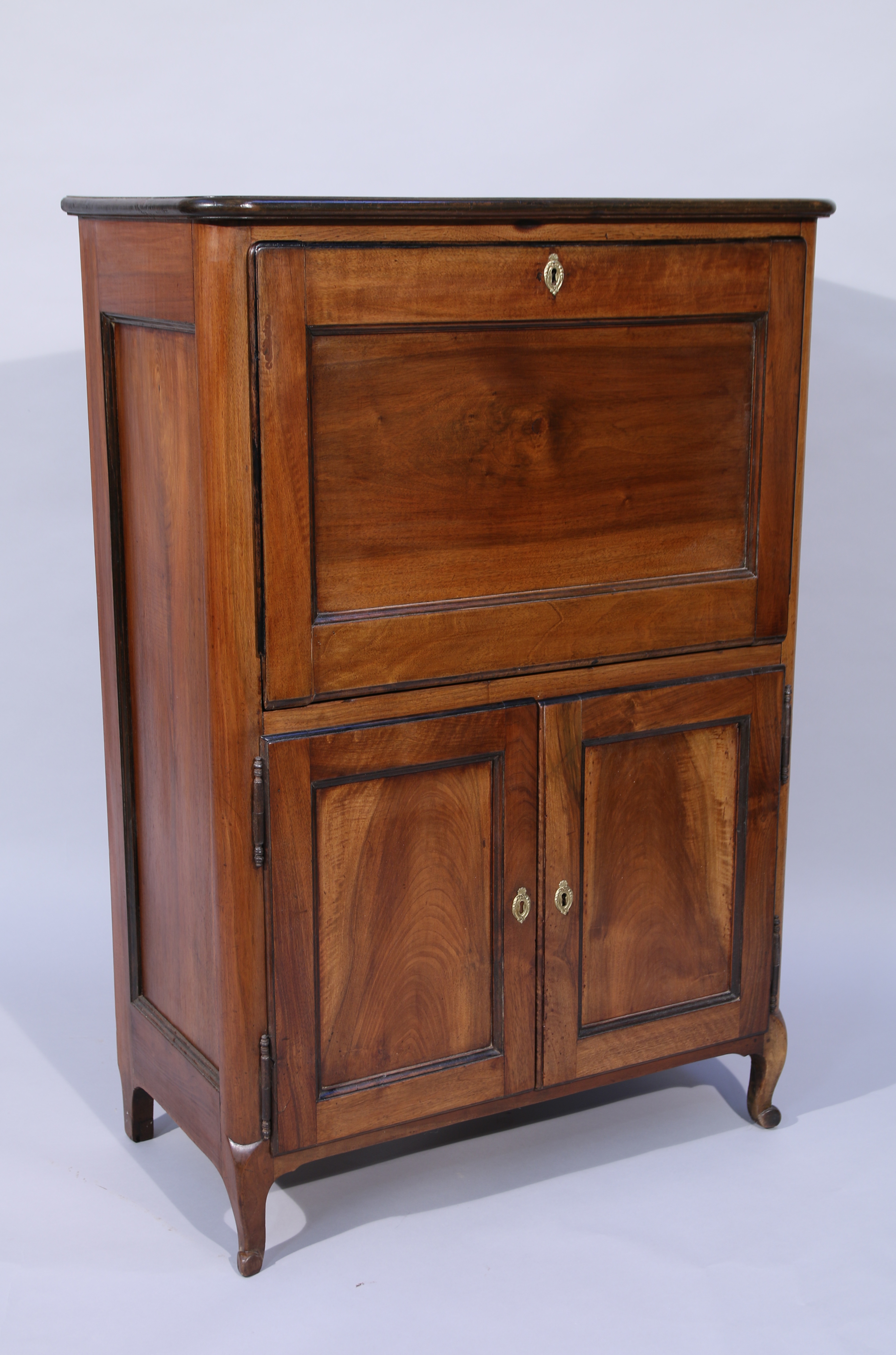 en noyer rehaussé de noir sur les moulures. Il ouvre à un abattant dans sa partie supérieure, révélant un castin en sapin de forme pyramidale à quatre tiroirs, sept niches et un secret à trois compartiments. L'abattant foncé d'un cuir. La partie inférieure ouvre à deux vantaux dévoilant un tiroir. Il repose sur deux pieds pastilles à l'avant et silhouettés à l'arrière.
