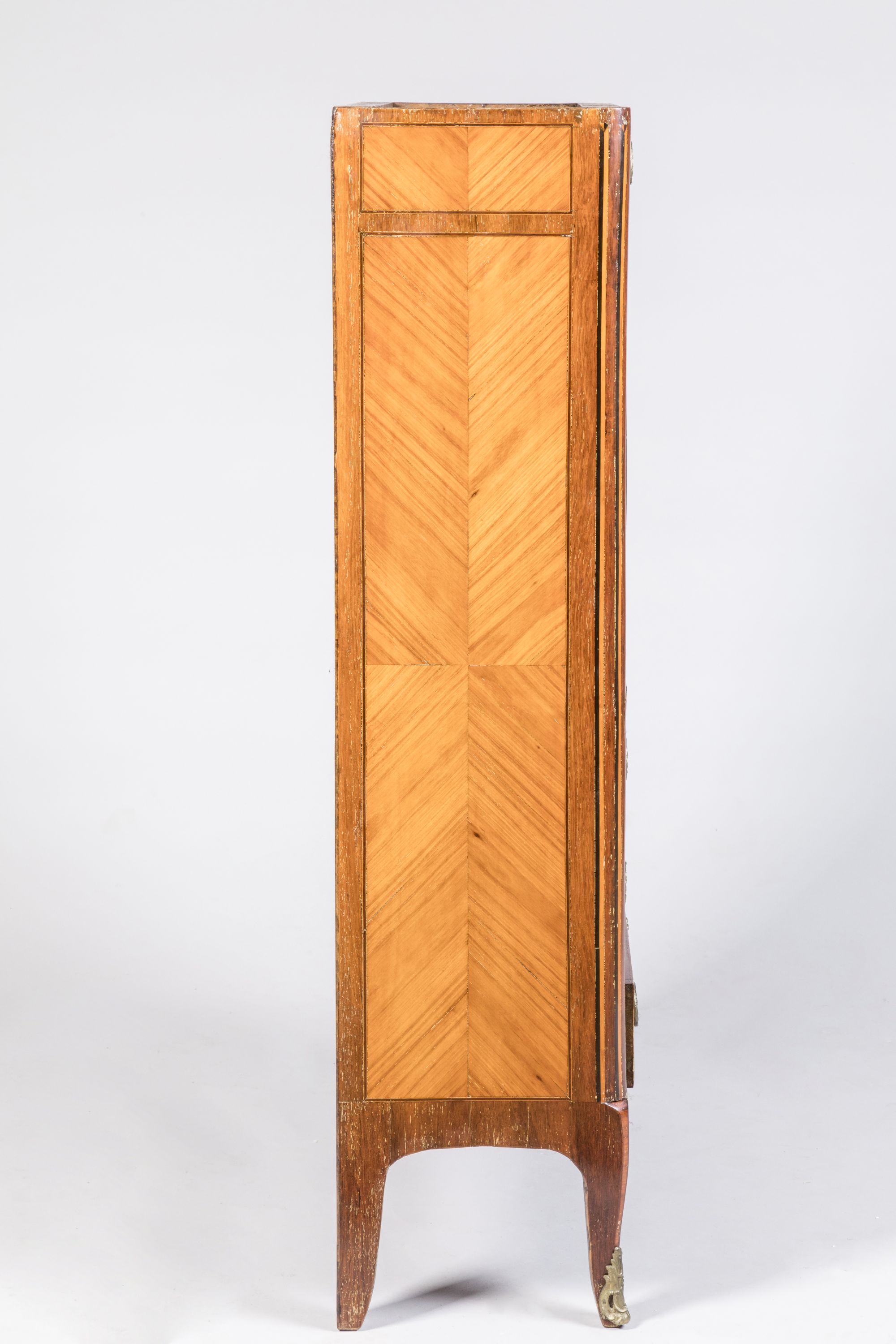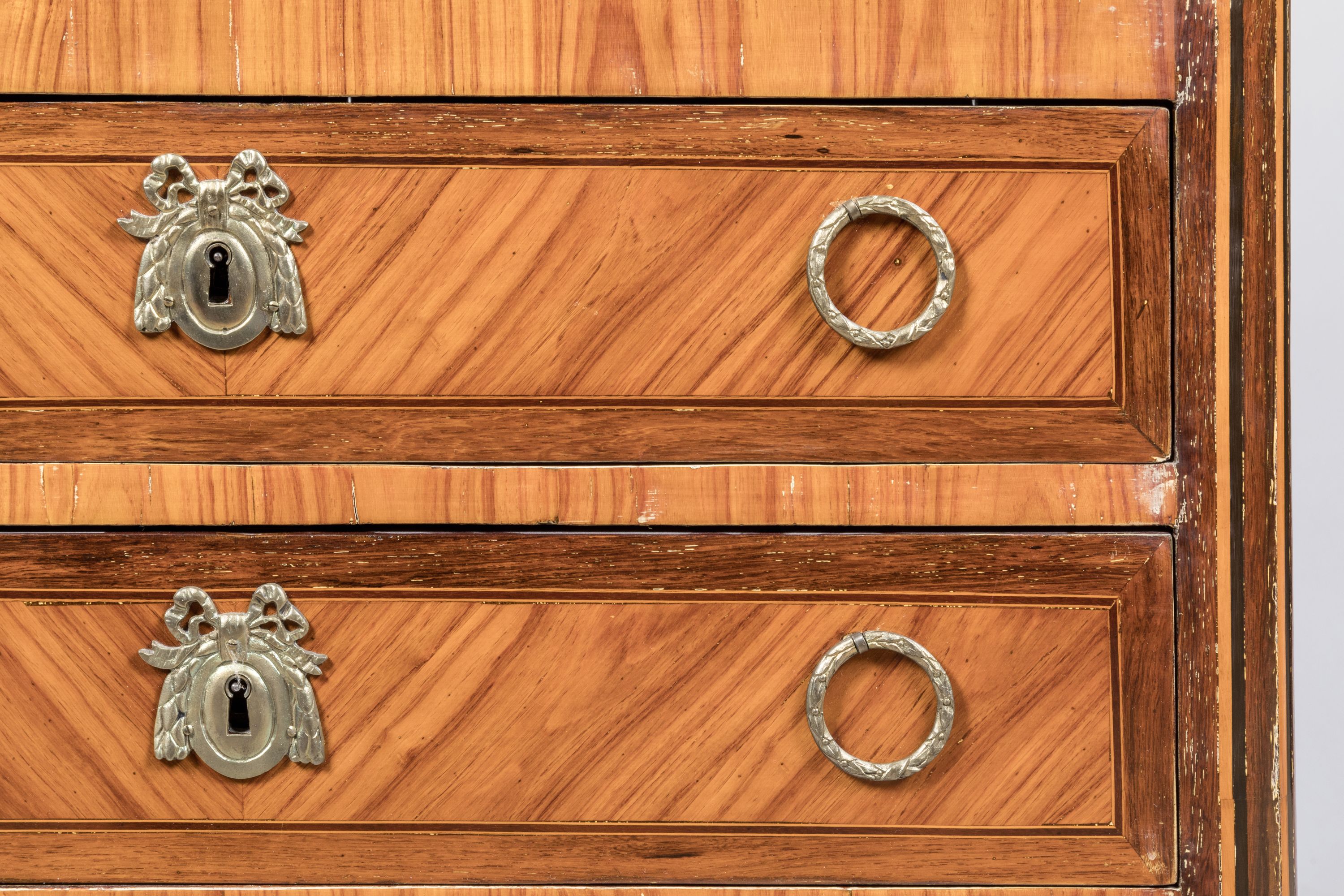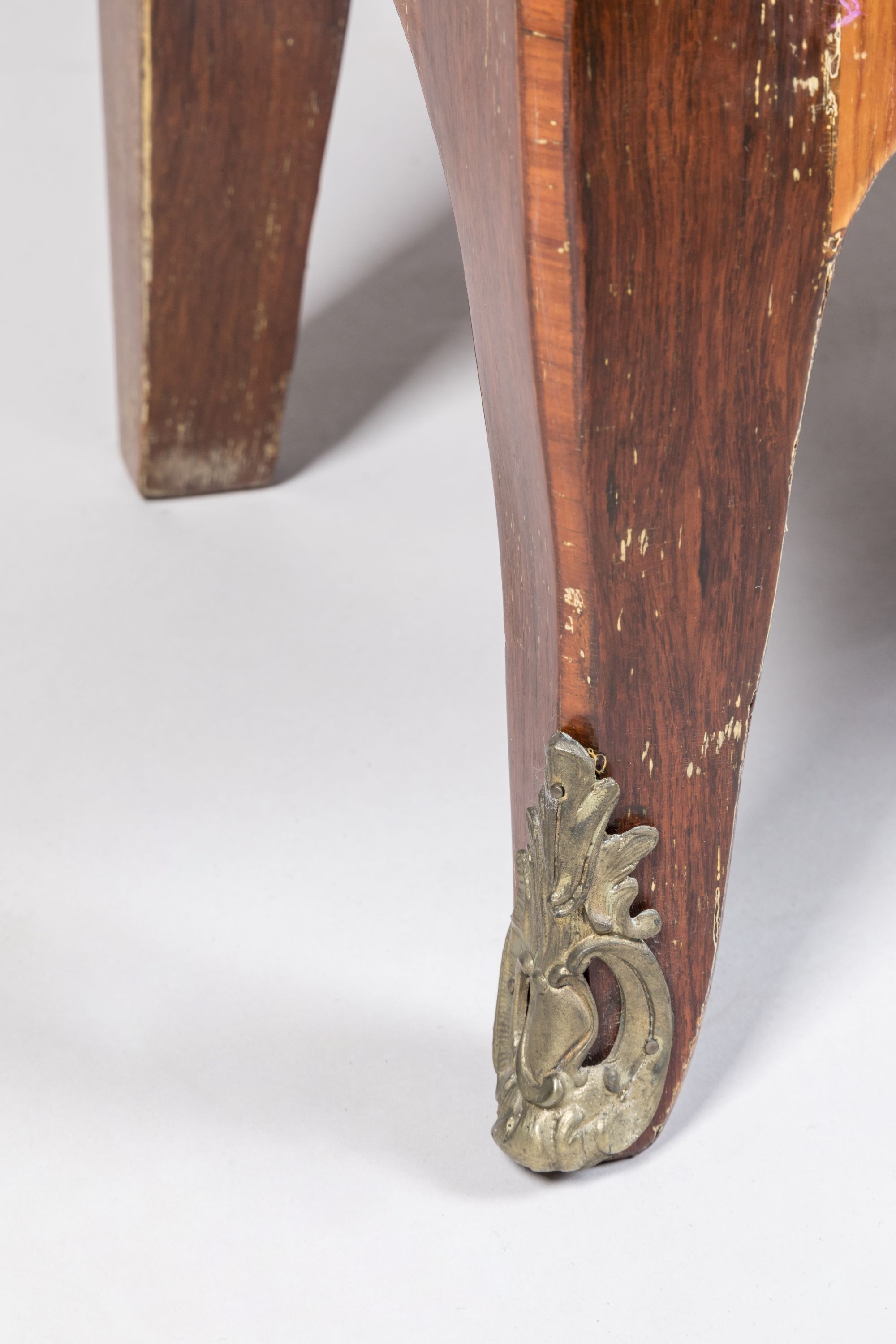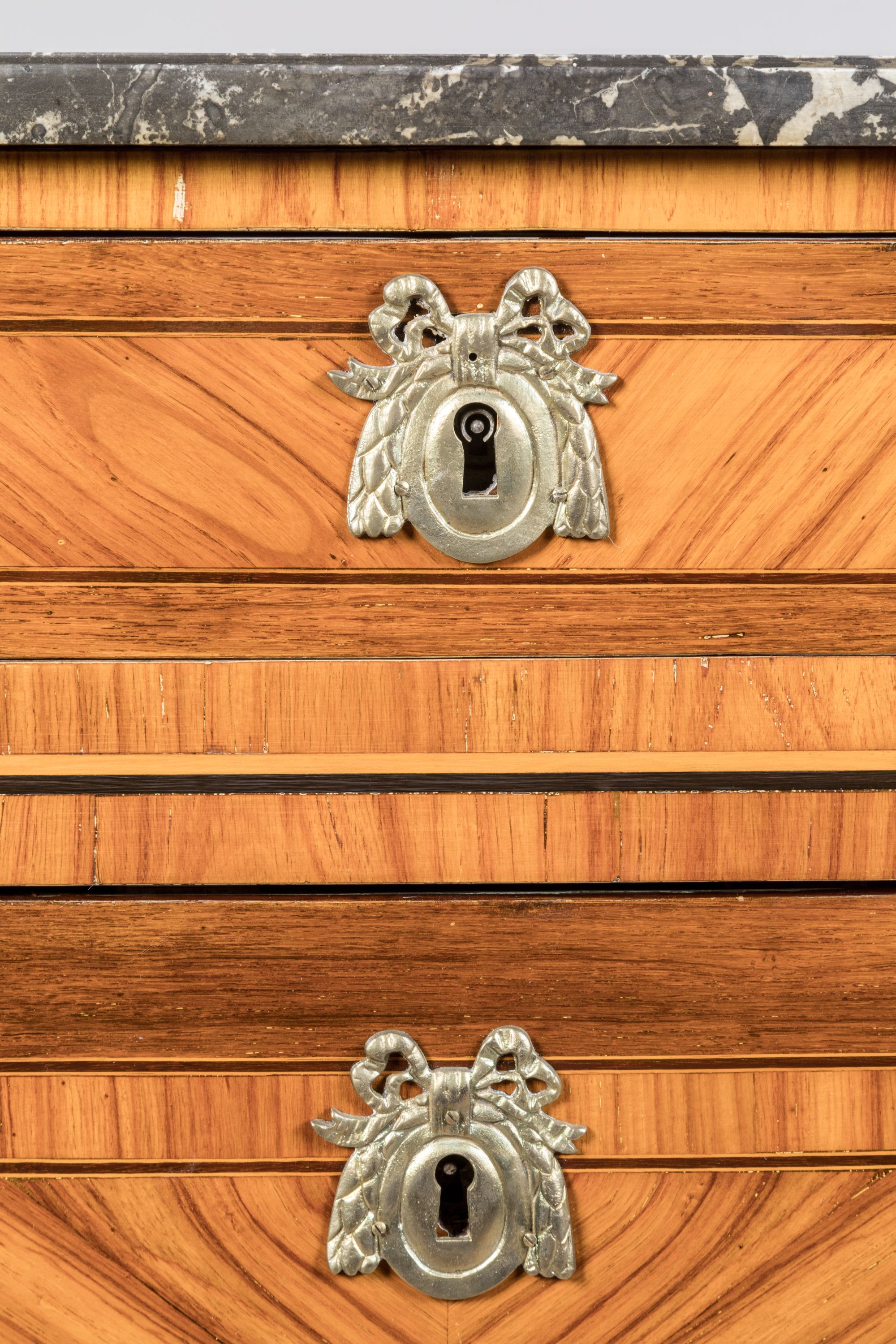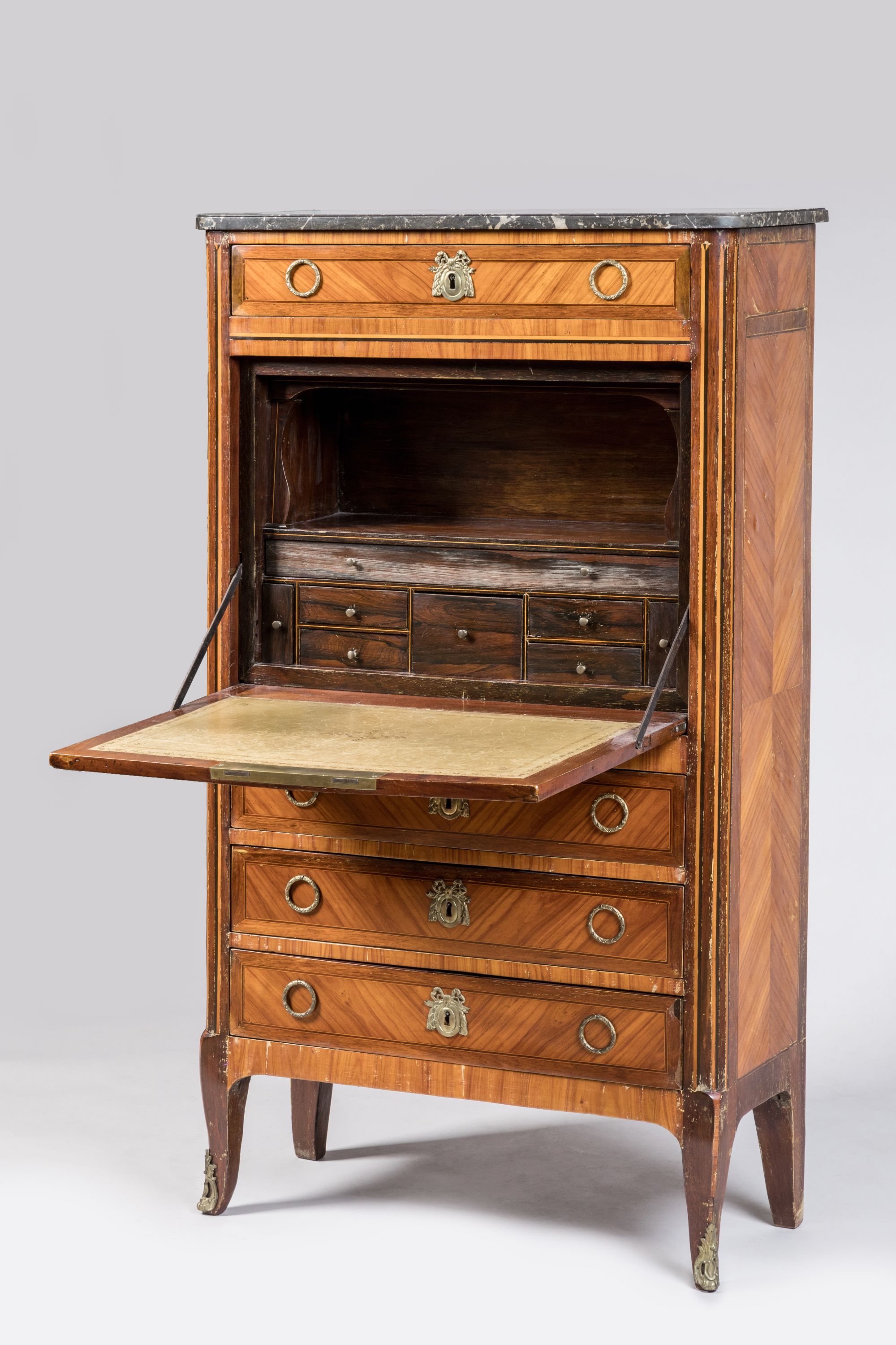 SECRÉTAIRE à ABATTANT en marqueterie d'amarante et frisage en ailes de papillon. Il ouvre en façade par 4 tiroirs et un abattant qui révèle un écritoire gainé de cuir et 8 petits tiroirs. Ses montants sont à pans coupés et le placage imite des cannelures. Il repose sur des pieds postérieurs en sabre et des pieds antérieurs cambrés garnis de sabots de bronze à décor feuillagé. Les entrées de serrures et anneaux de tirage sont également en bronze doré et ciselé.