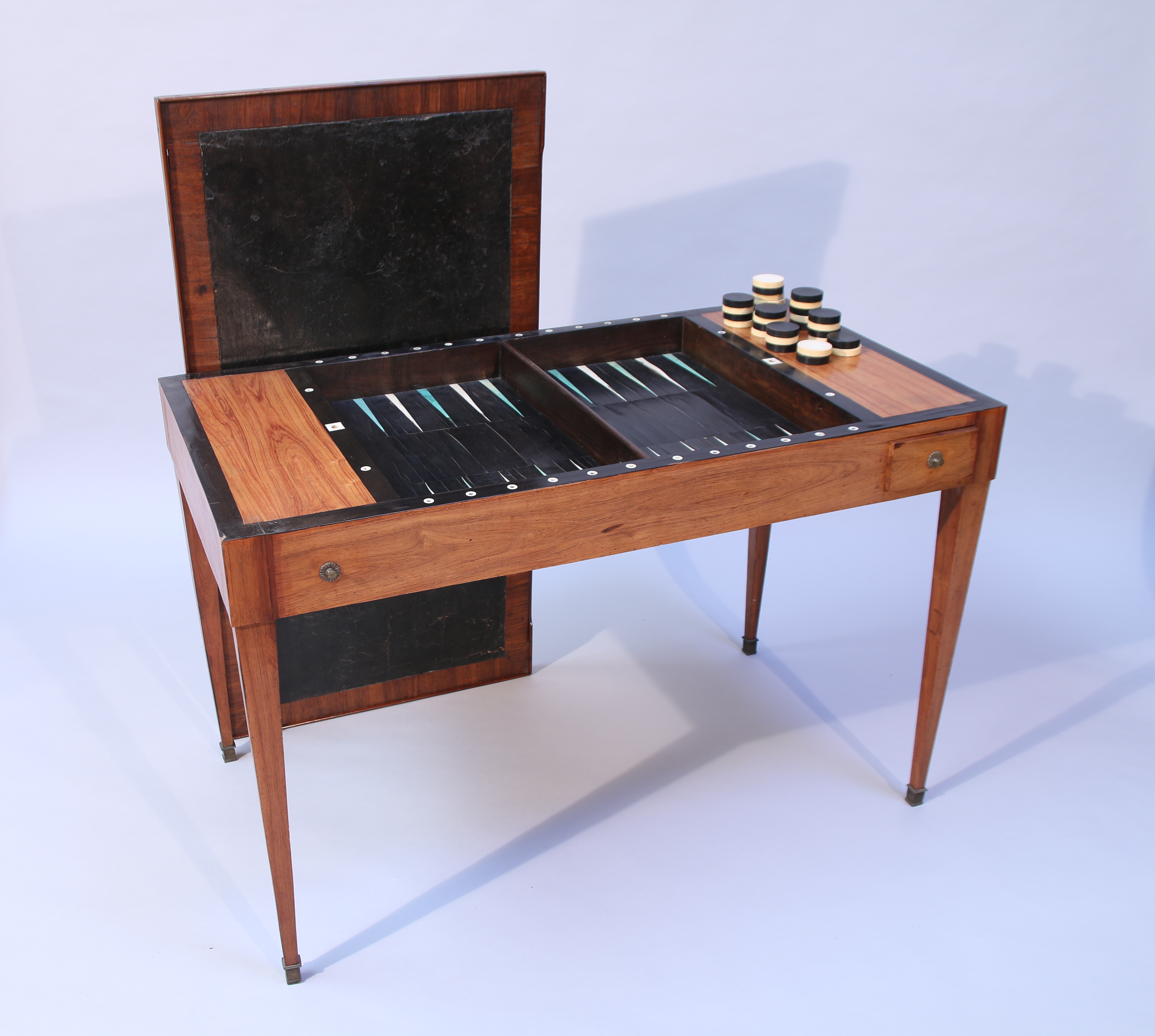 Bibliographie : Pierre KJELLBERG, "Le mobilier français du XVIIIe siècle, éd. de l'amateur, 1989, pp. 669-670 : "La table tric-trac constitue sa spécialité presque exclusive. On en connaît un certain nombre, Louis XV et surtout Louis XVI, en bois de rose, en acajou, en satiné avec ou sans caissons, reposant pour la plupart, sur des pieds gaines."