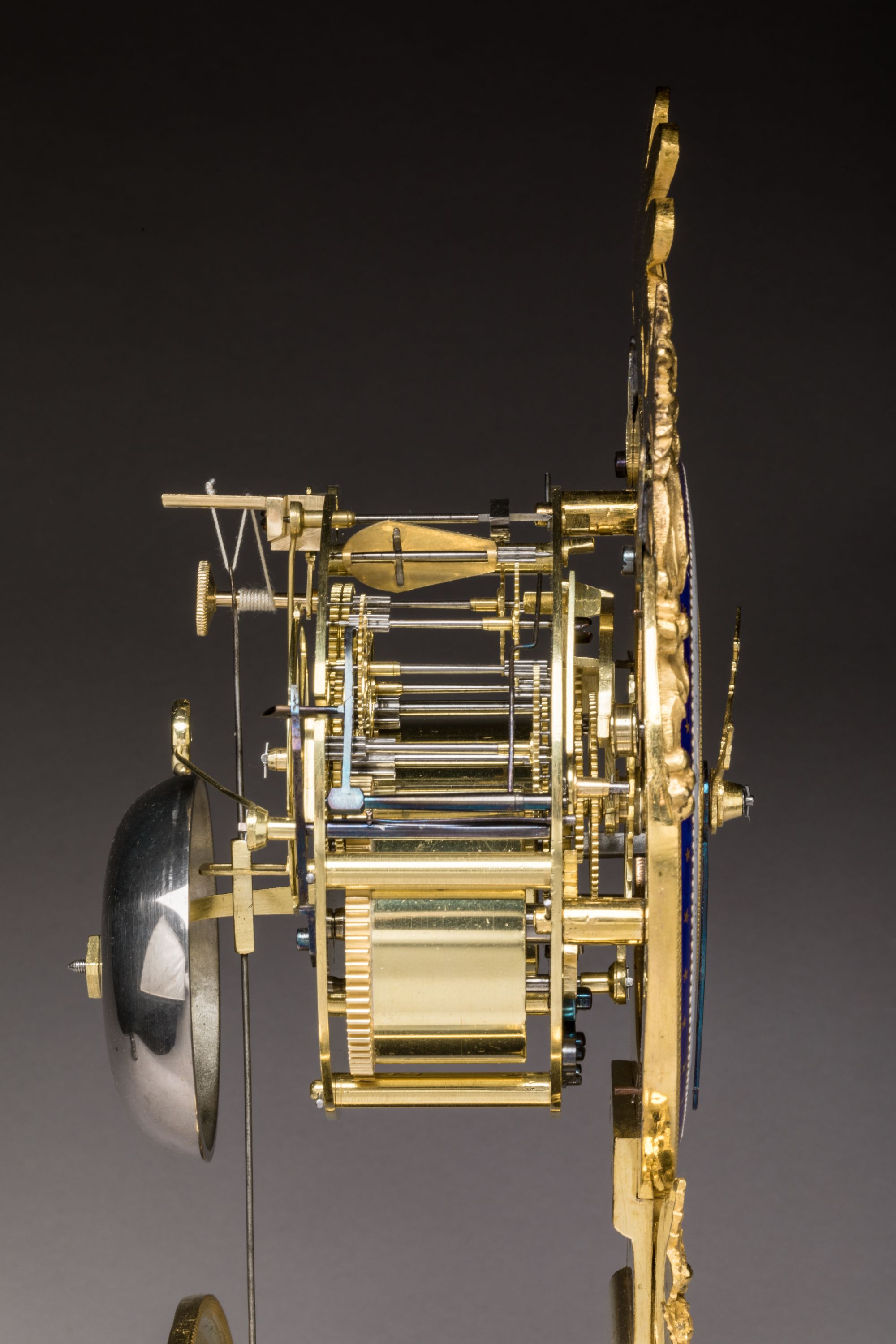 Le cadran annulaire est signé BLAISAU à Paris et émaillé blanc. Il présente des chiffres romains pour les heures, et des chiffres arabes pour les quantièmes. Il est cerclé d'émaux à la façon de COTEAU avec rehauts de blanc fixe et or sur fond bleu. Il est sommé d'une palmette et de guirlandes de feuilles de chêne, ce second motif également repris à sa base. L'arcature supportant le mouvement repose sur un socle en marbre noir sur quatre patins dorés.