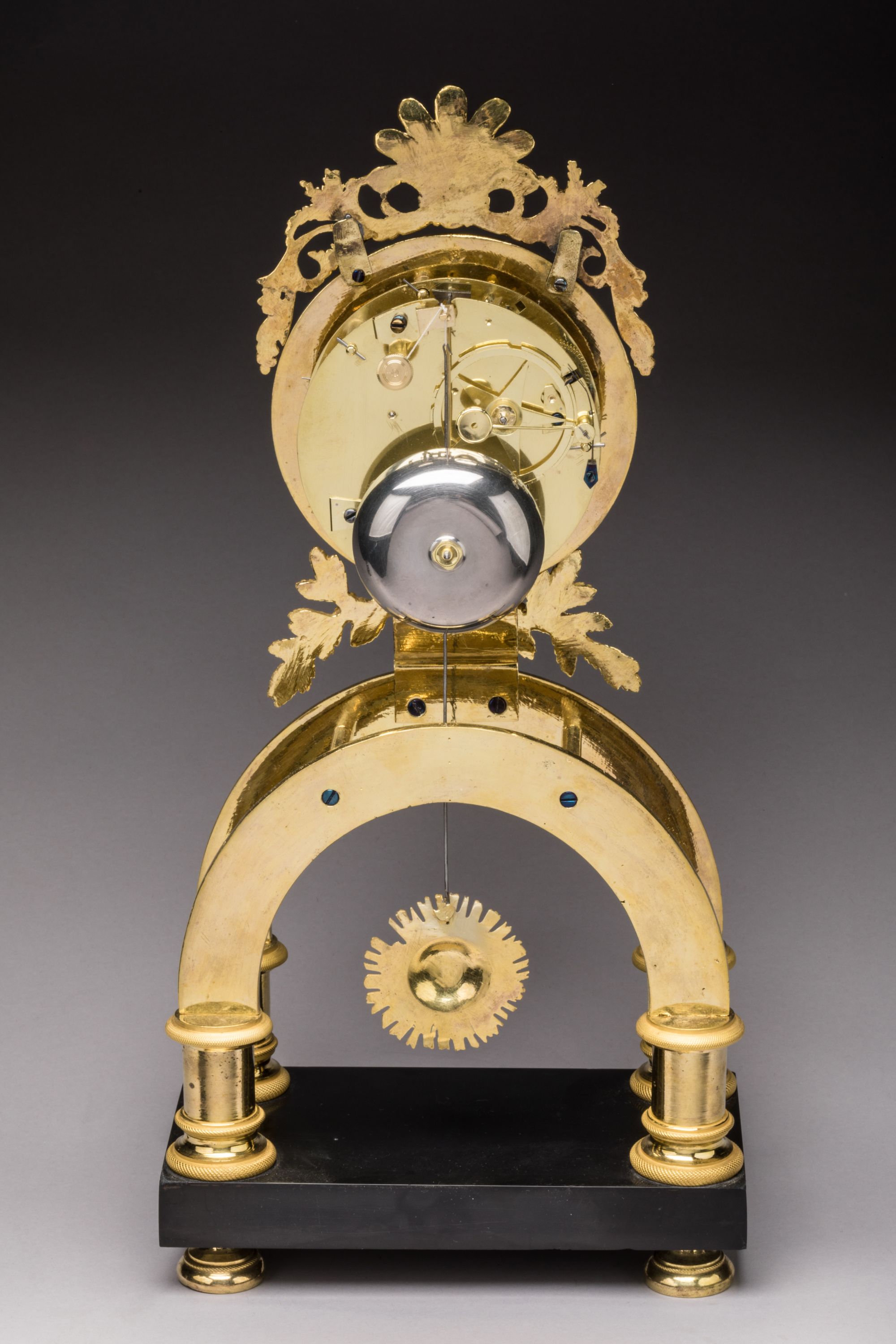 A Directoire gilt bronze ARCH SKELETON MANTEL CLOCK signed by BLAISAU, Paris, on the dial.
