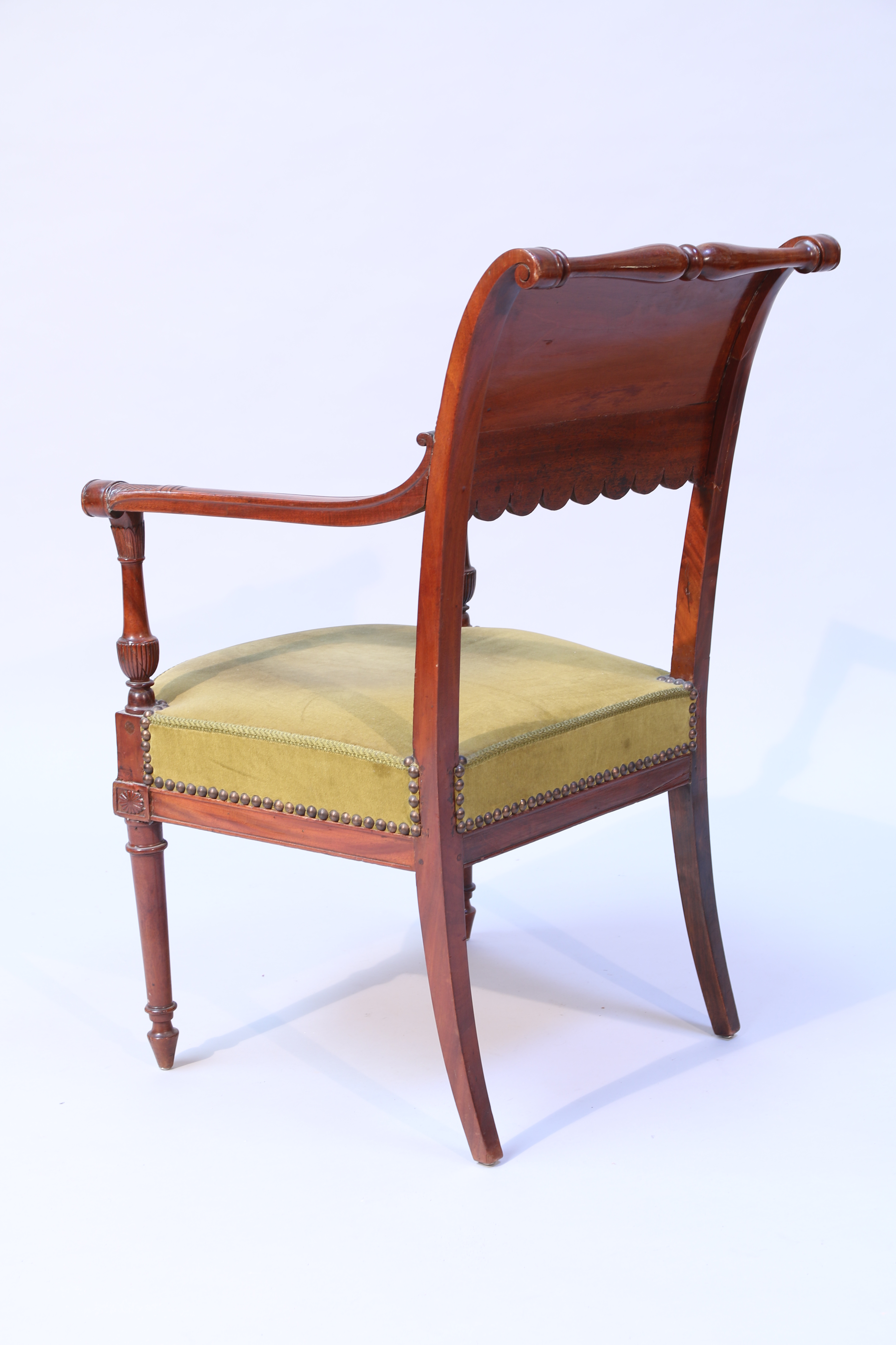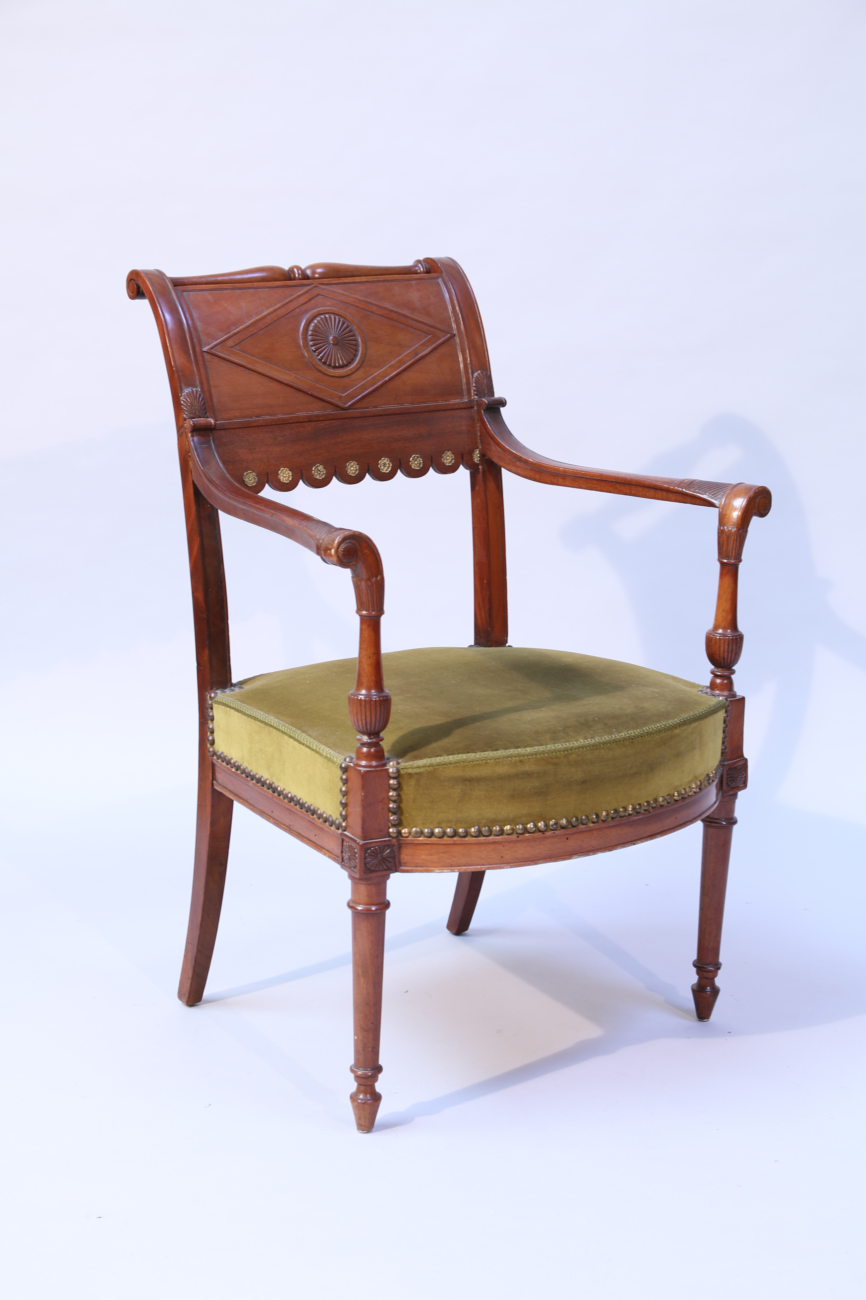 en acajou sculpté et mouluré de losange, rosaces et palmettes, les accotoirs se terminant dans la crosse déviée vers l'extérieur que portent des colonnes en forme de vase à long col feuillagé. Reposant sur deux pieds postérieurs sabres et deux pieds antérieurs fuselés. Orné de petites fleurs en métal doré à l'extrémité inférieure du dossier.