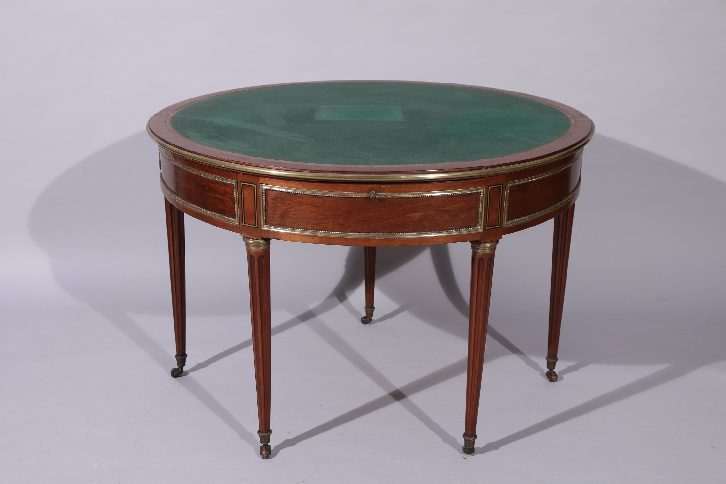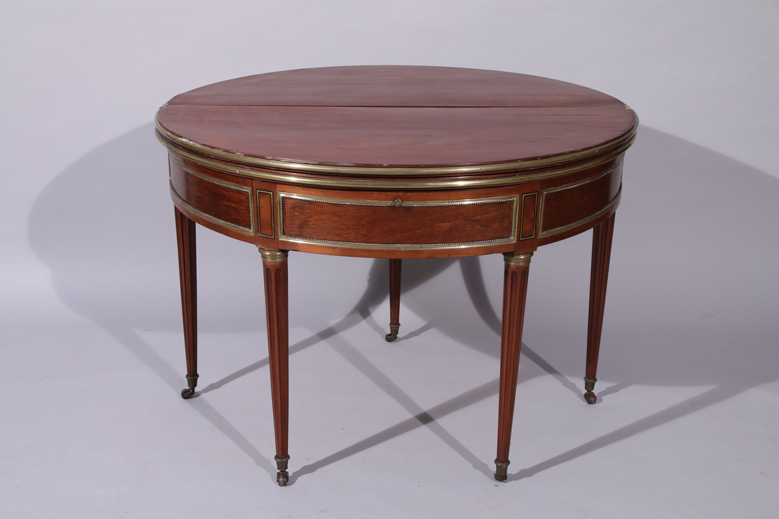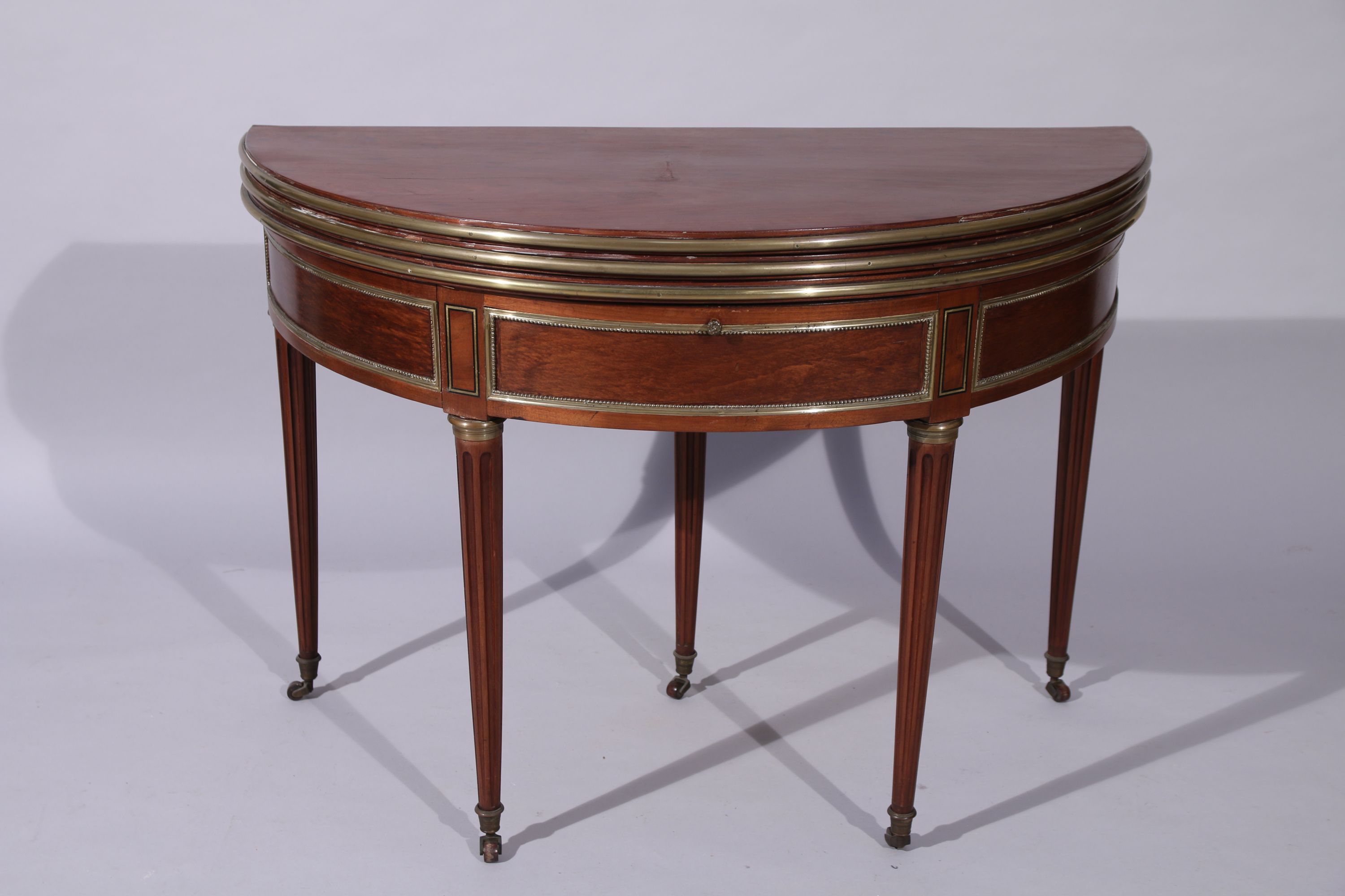 en placage d'acajou, ornée de lingotières de laiton, frises de perles, les pieds fuselés et cannelés terminés par des roulettes.