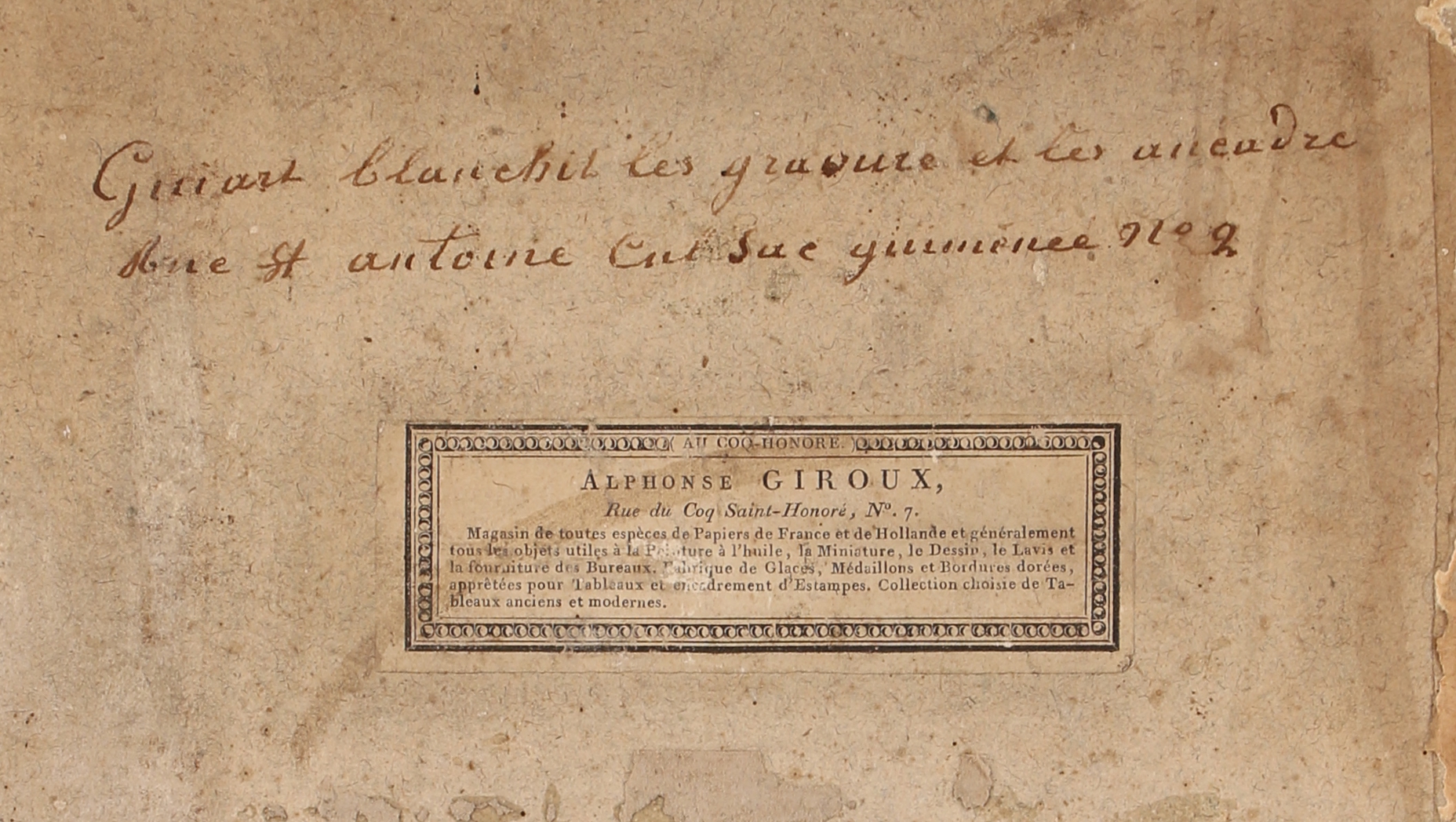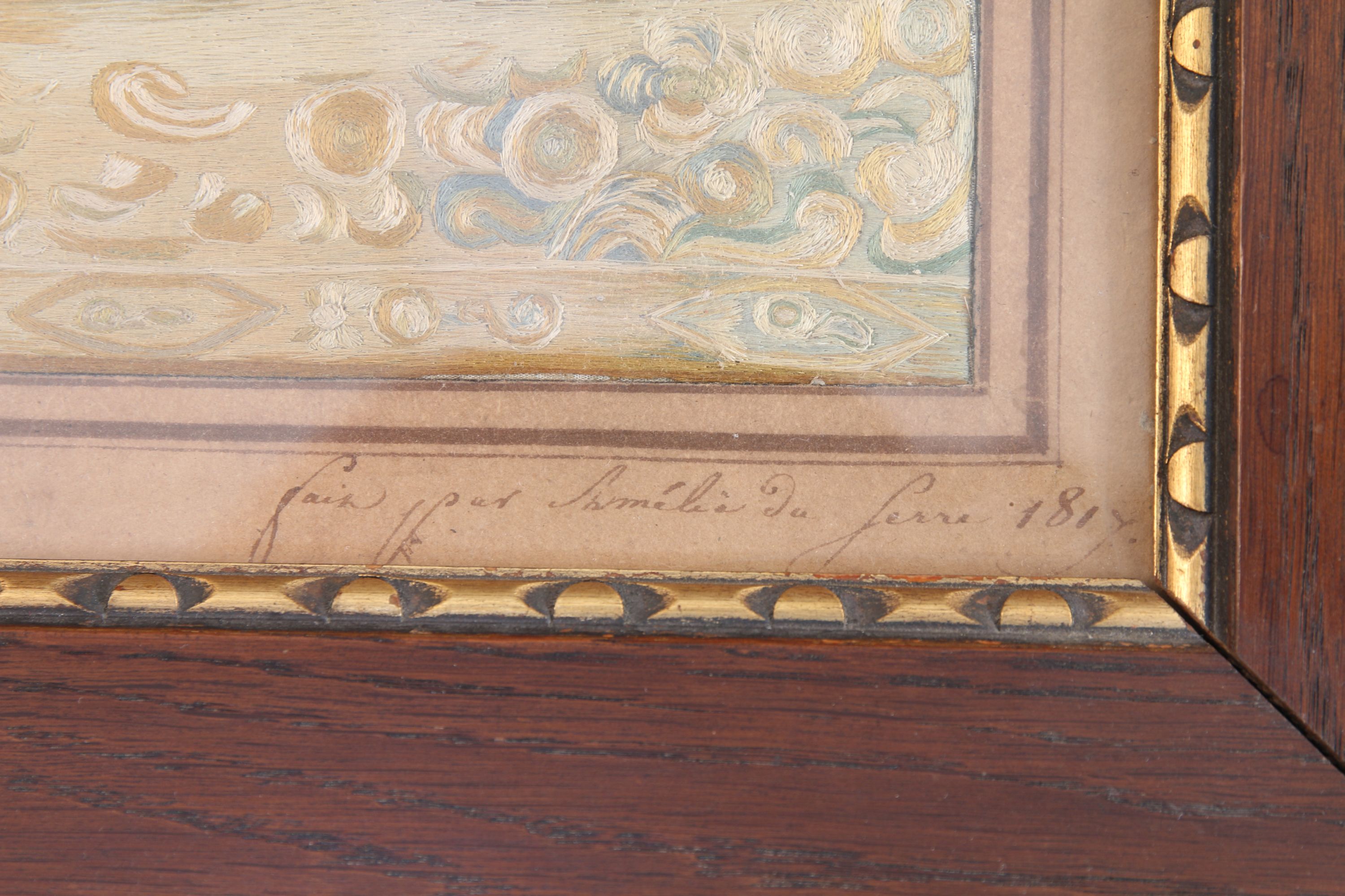 Piqué l'aiguille et rehauts de peinture sur soie. Précieux ouvrage de vertu d'après la composition de Charles Le Brun pour la cathédrale de Versailles réalisé par "Amélie du Serre" et daté "1817", avec de très beaux coloris et teintes.