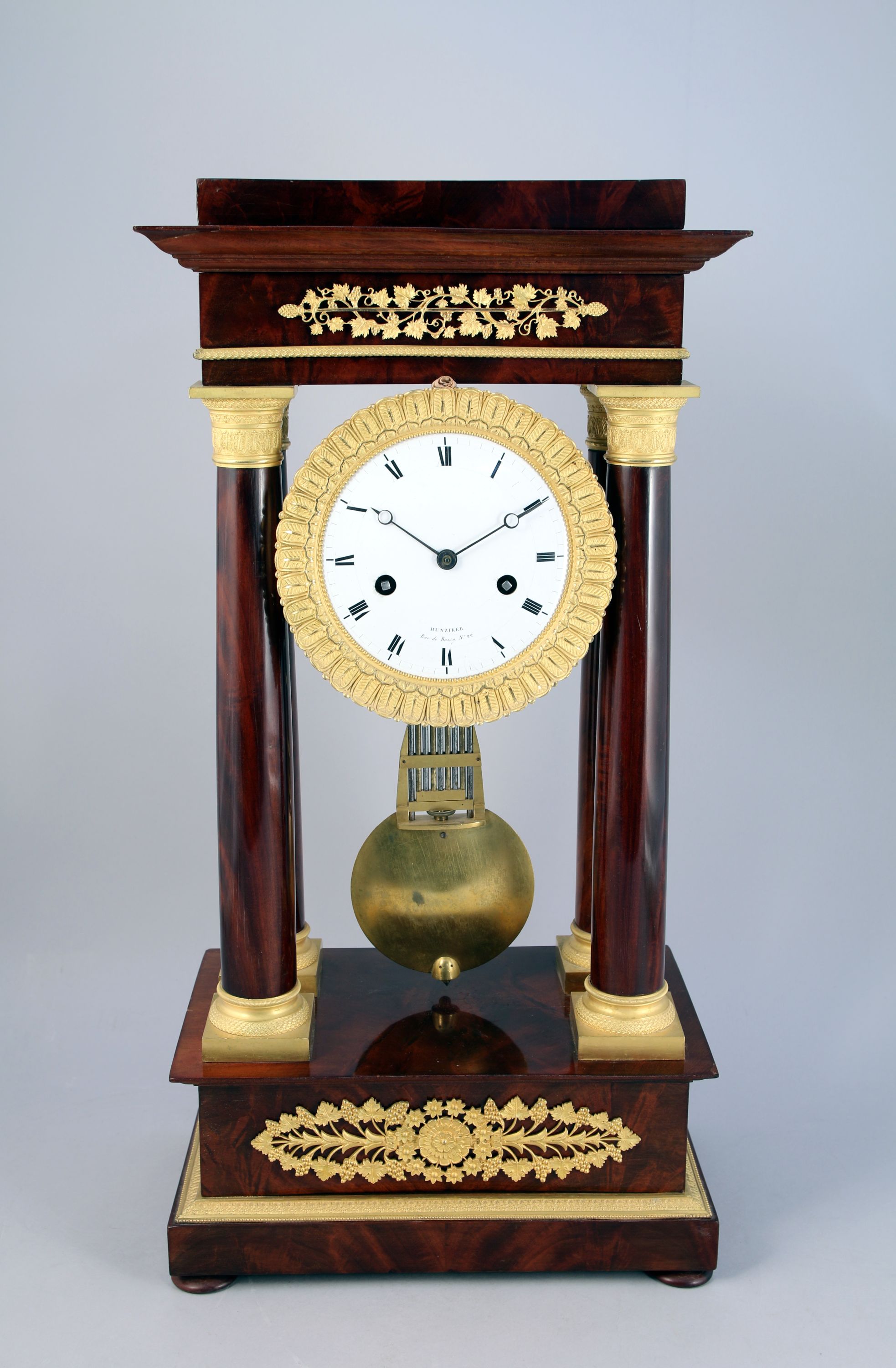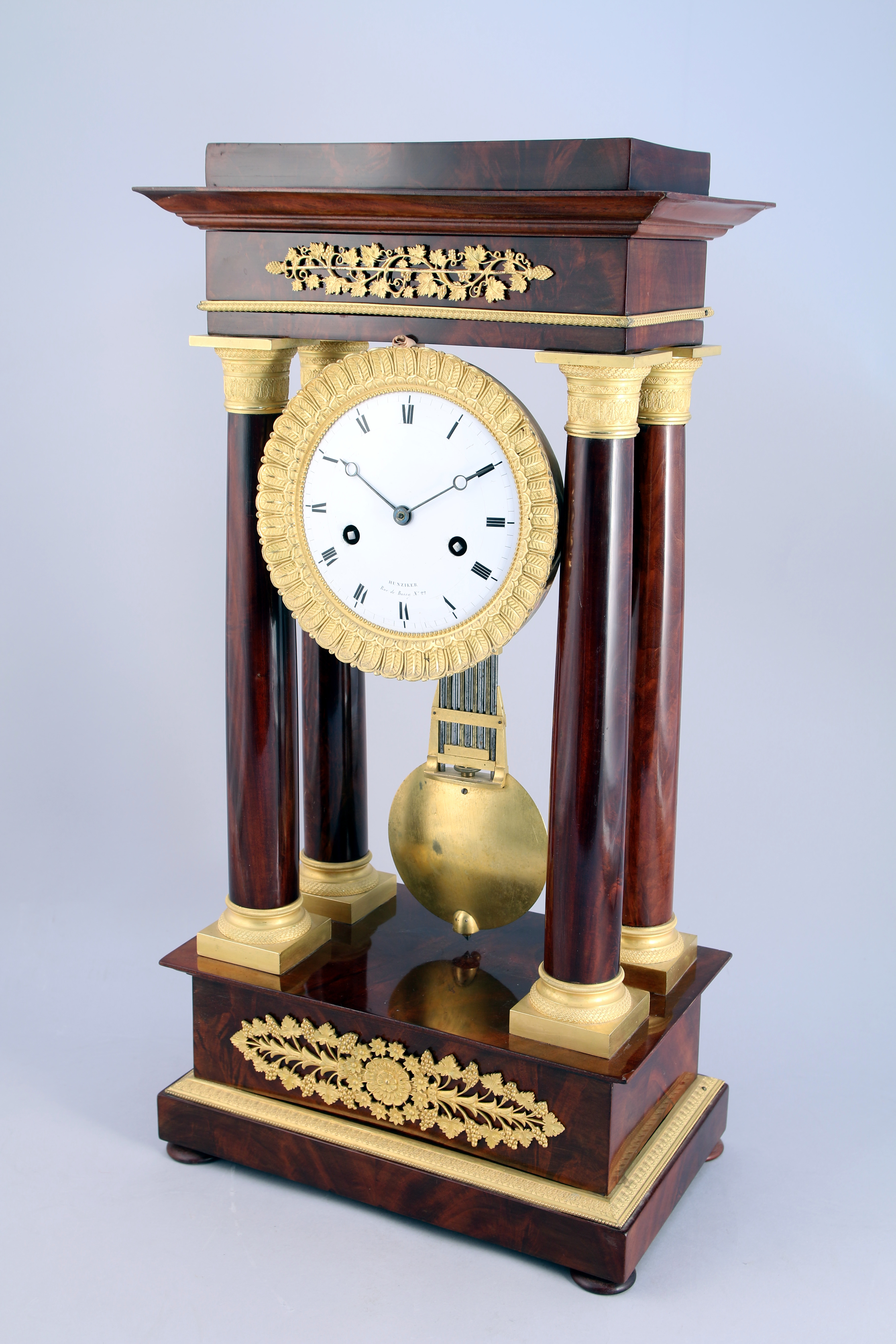 Les pendules portiques apparaissent sous le règne de Louis XVI à la suite du retour à l'antique. Sous l'Empire, ces formes de pendules persistent et se parent d'essences exotiques: ébène, et surtout acajou qui contrastent avec la dorure des bronzes. Le balancier compensé, invention anglaise du XVIIIe, leur confère une grande précision malgré les écarts de température. On leur donne ainsi le nom de régulateurs de cheminée ou de bureau.