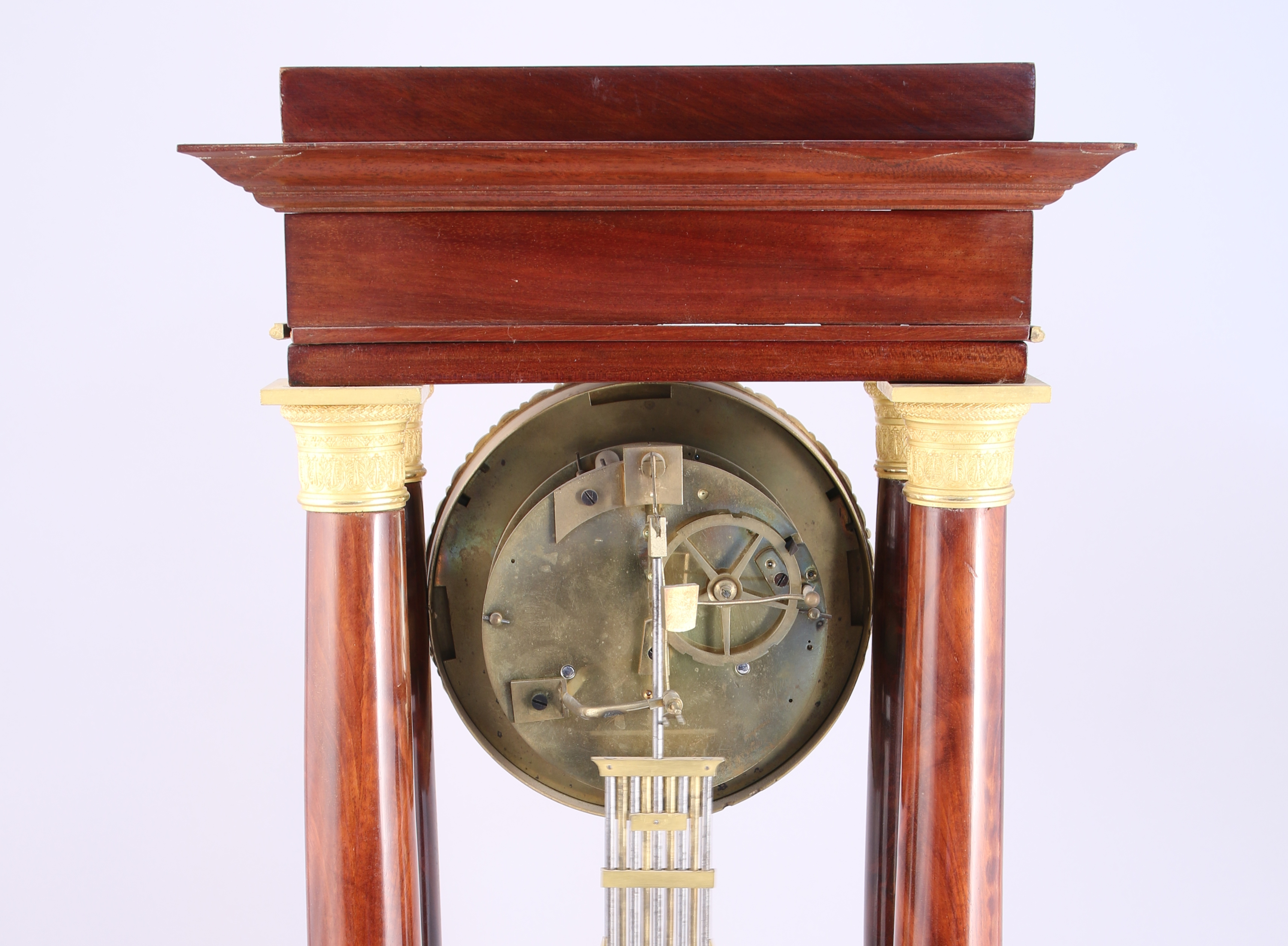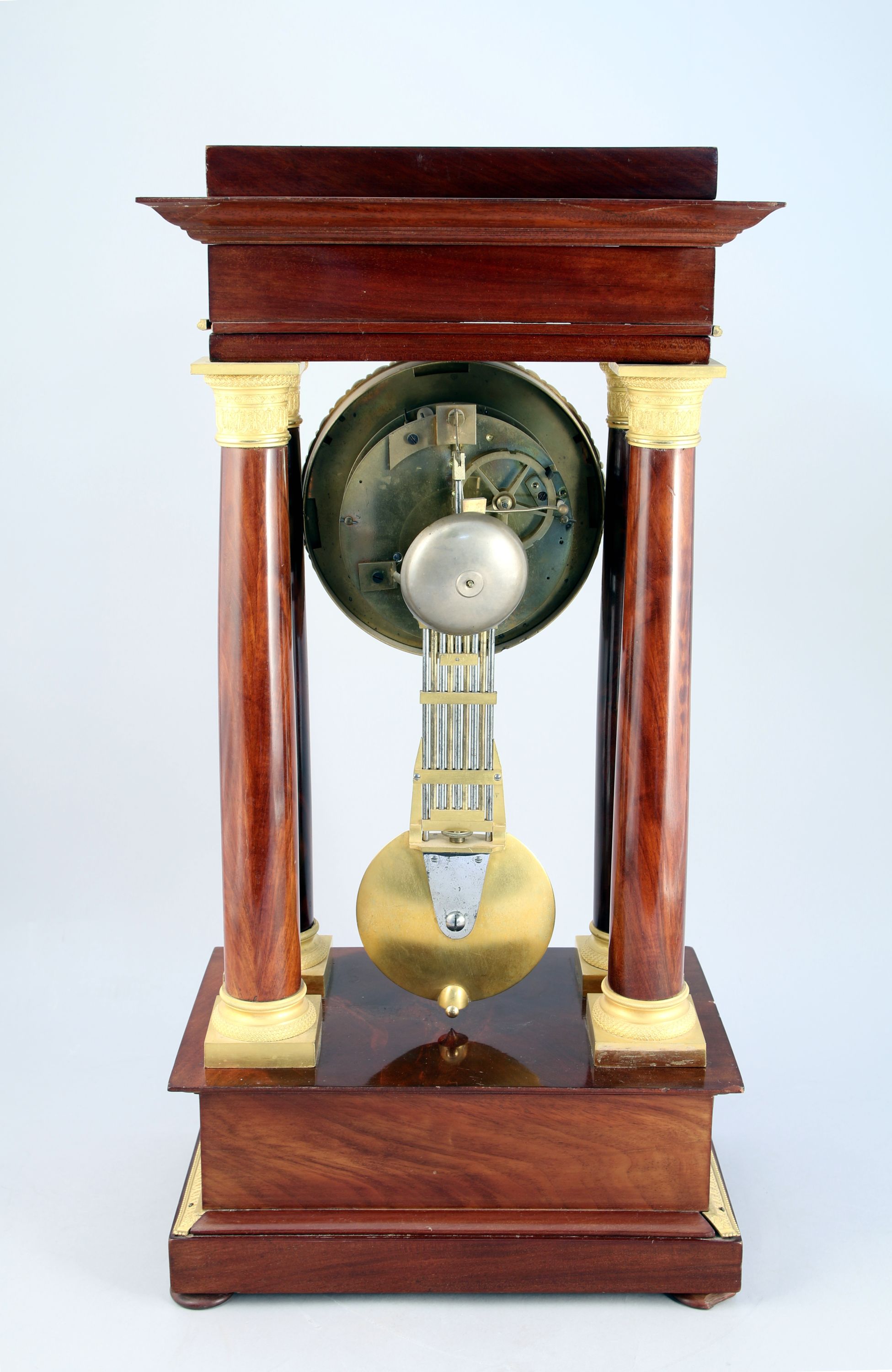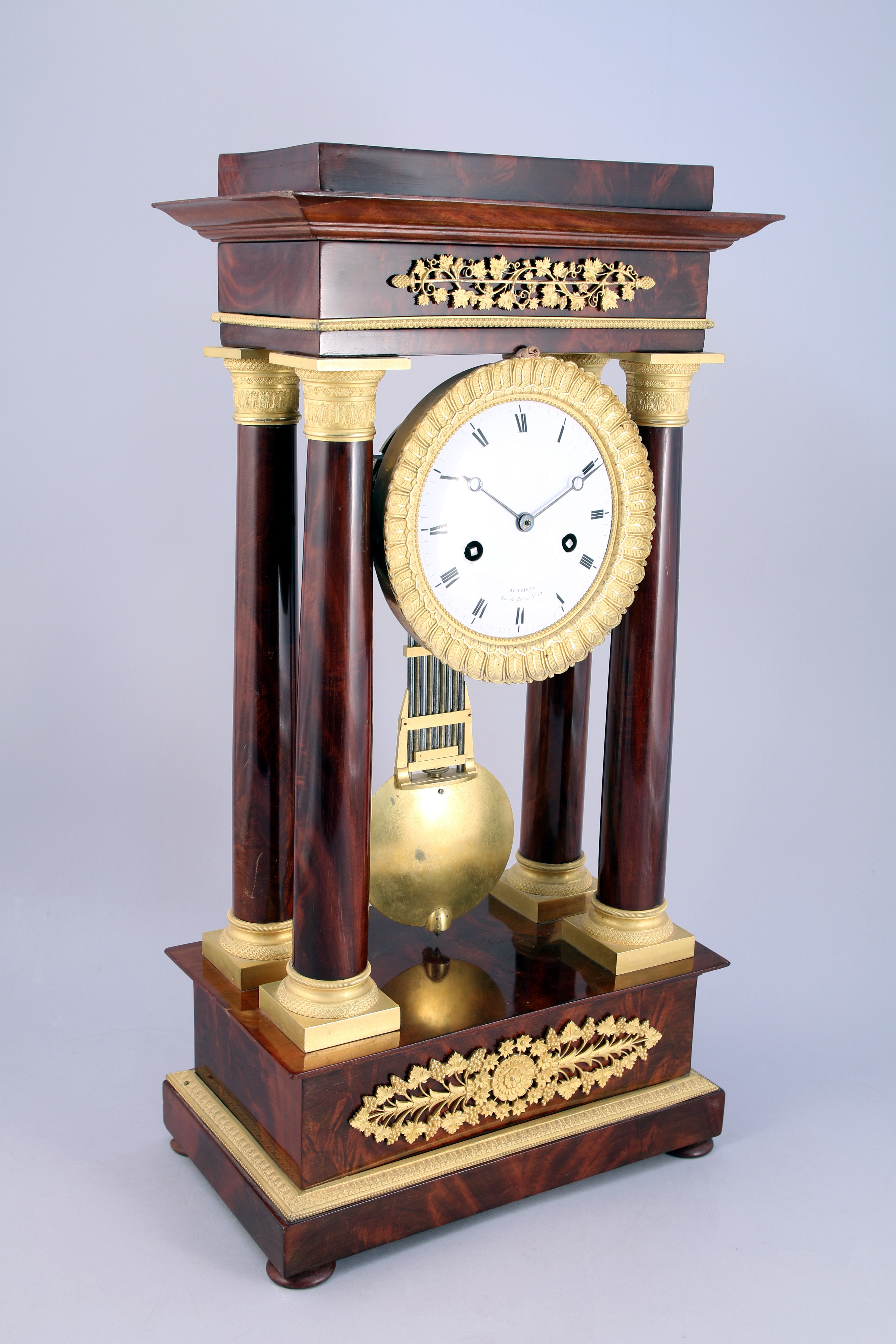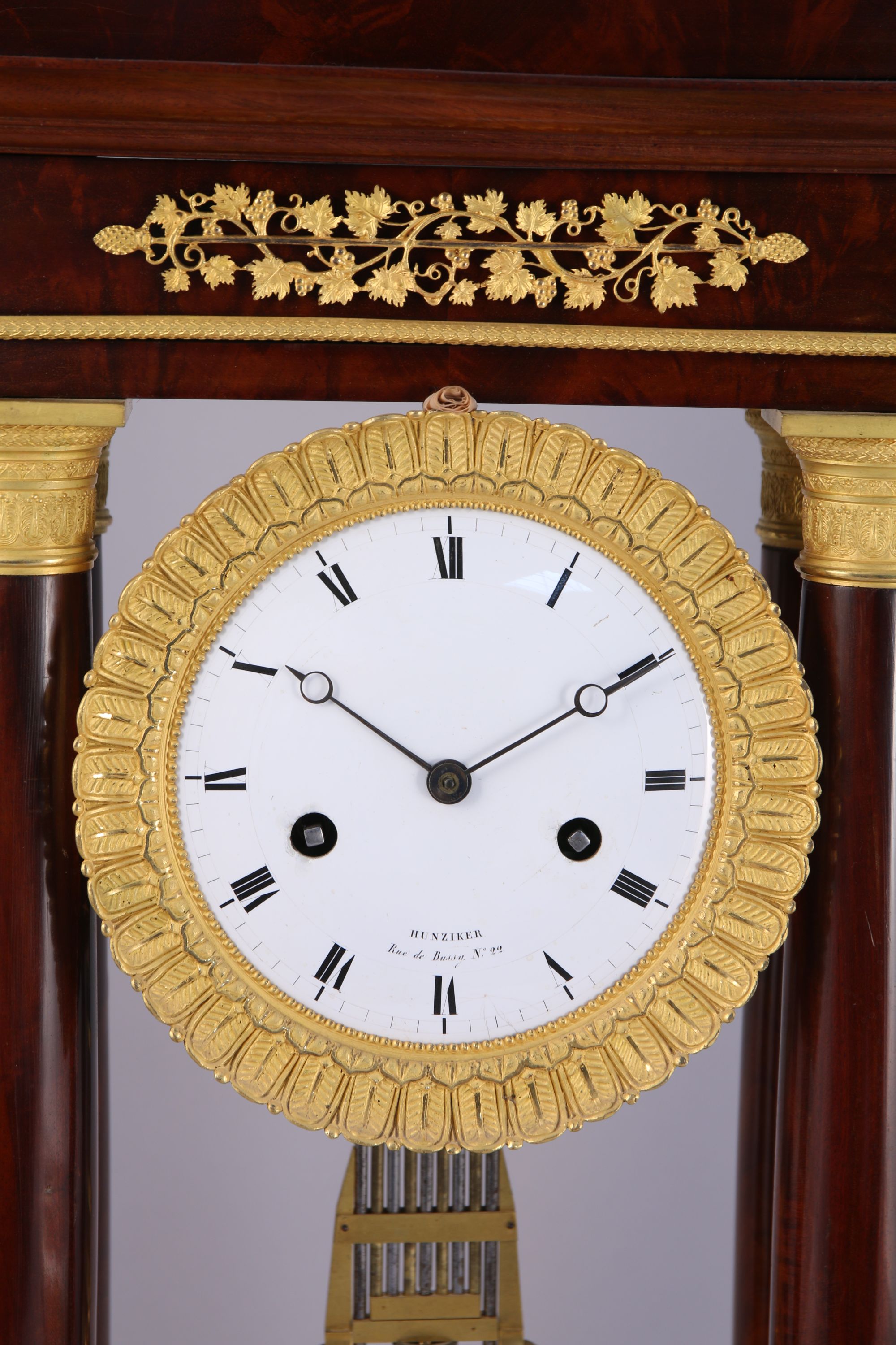 portique en acajou et placage d'acajou. Garniture de bronzes ciselés et dorés figurant des pampres de vigne s'enroulant autour d'un thyrse sur l'entablement et des fleurettes et rosaces sur la base. Les colonnes à chapiteau et base en bronze doré. Balancier compensé. Cadran émaillé blanc indiquant les heures en chiffres romains, signé "Hunziker, rue de Bussy, n°22".