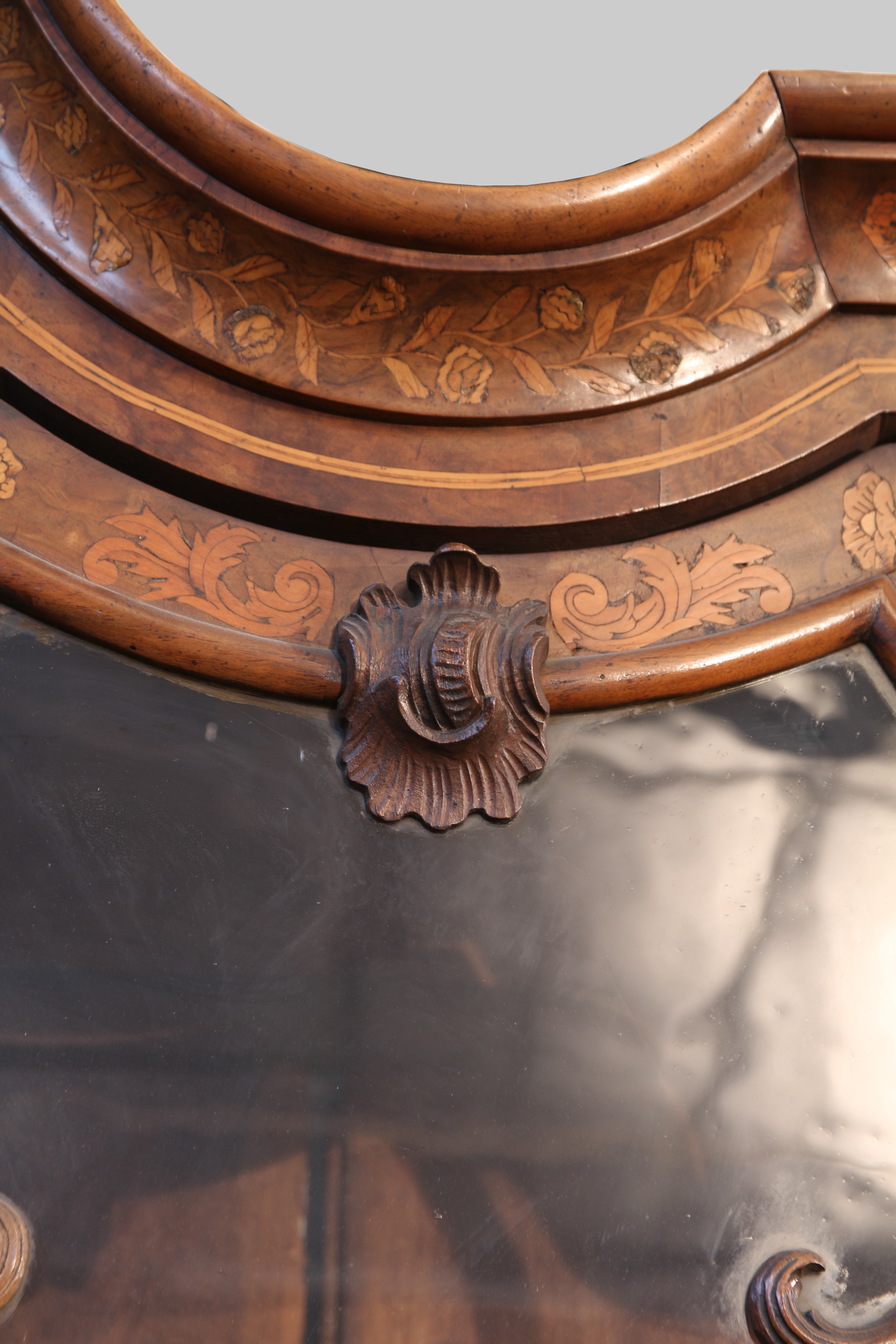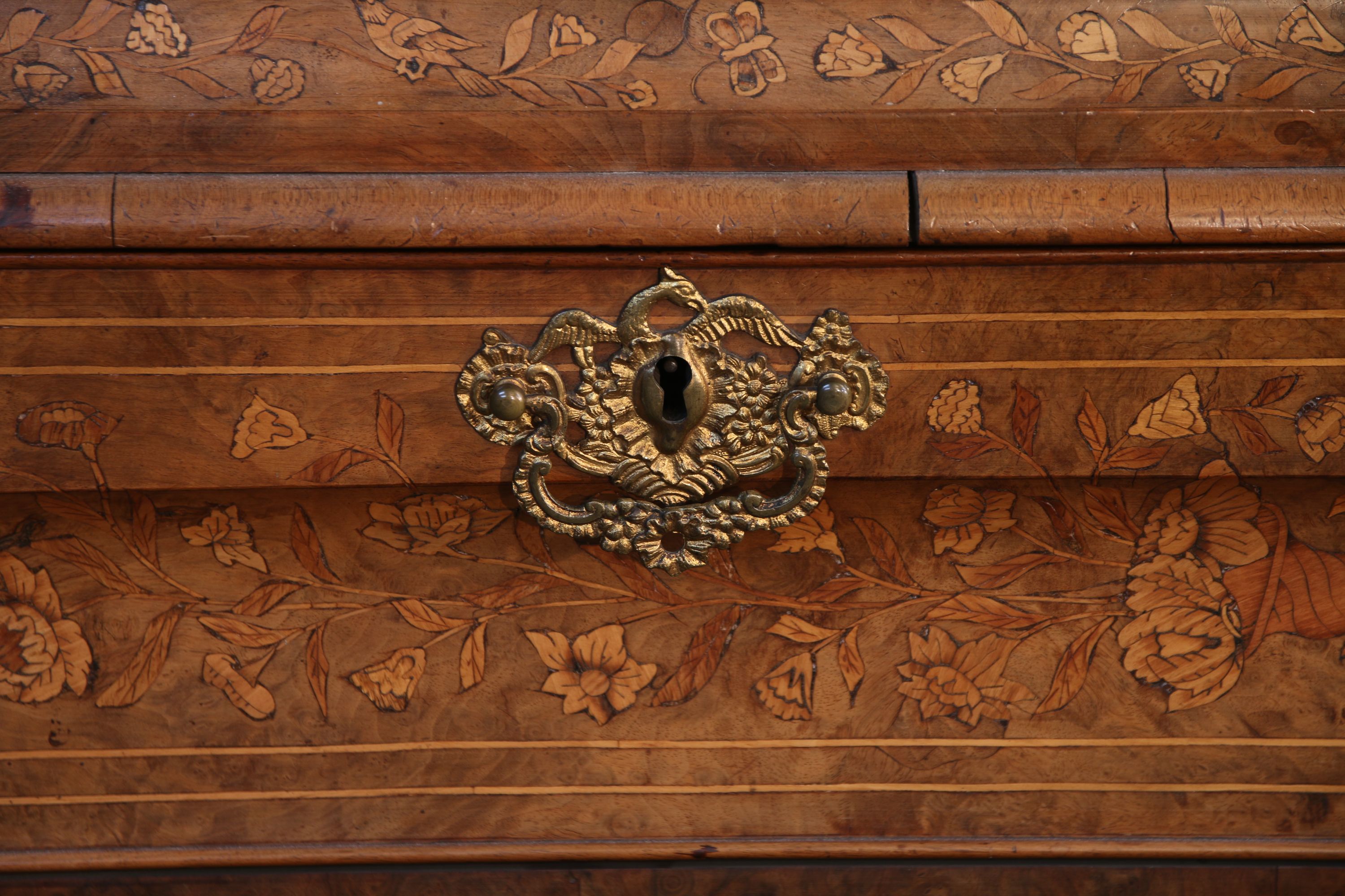 Bâti en chêne, marqueterie en sycomore et buis, figurant des couronnes royales, des rinceaux feuillagés, des papillons, des volatiles, Neptune et une sirène au postérieur dénudé aux cornes d'abondance.