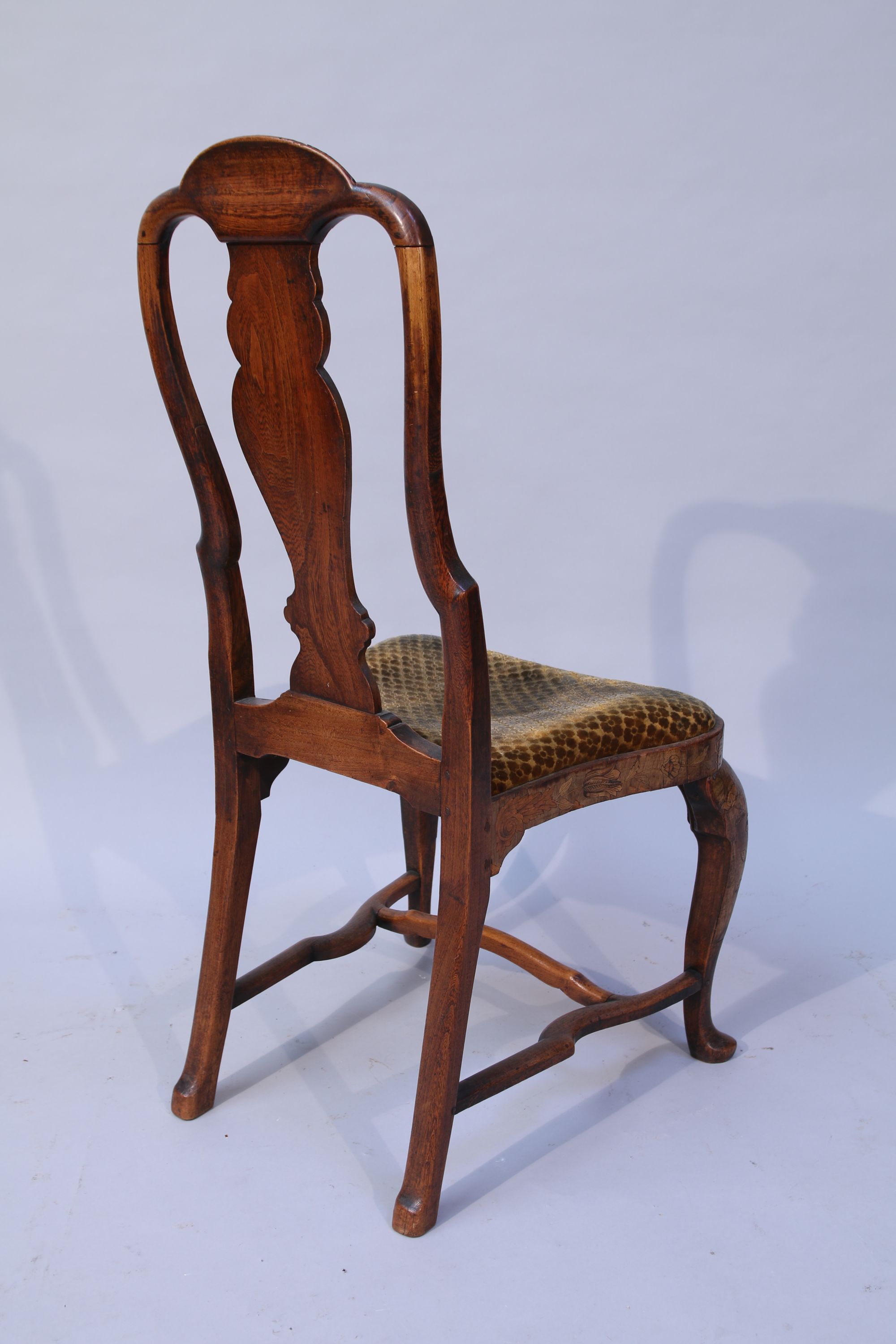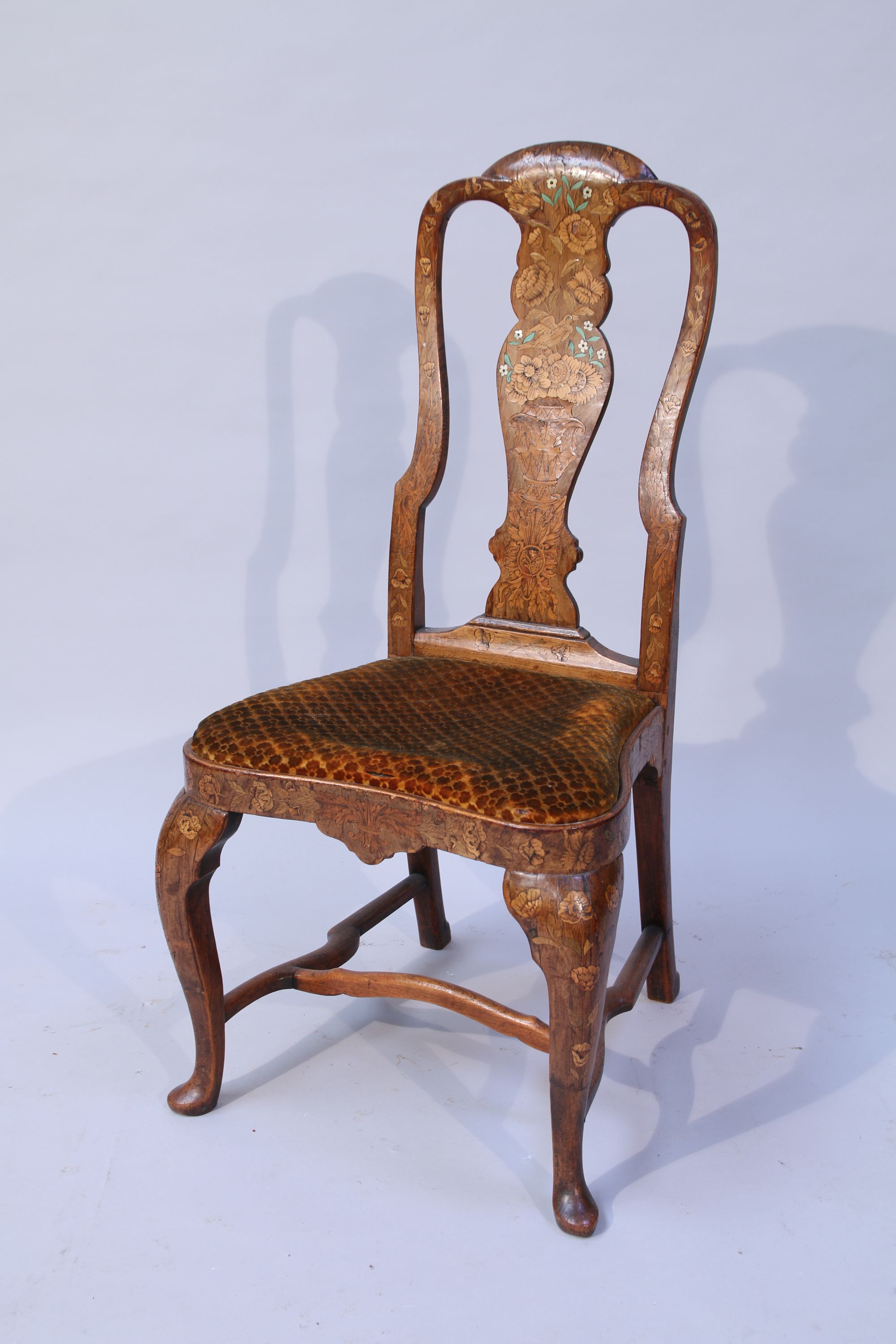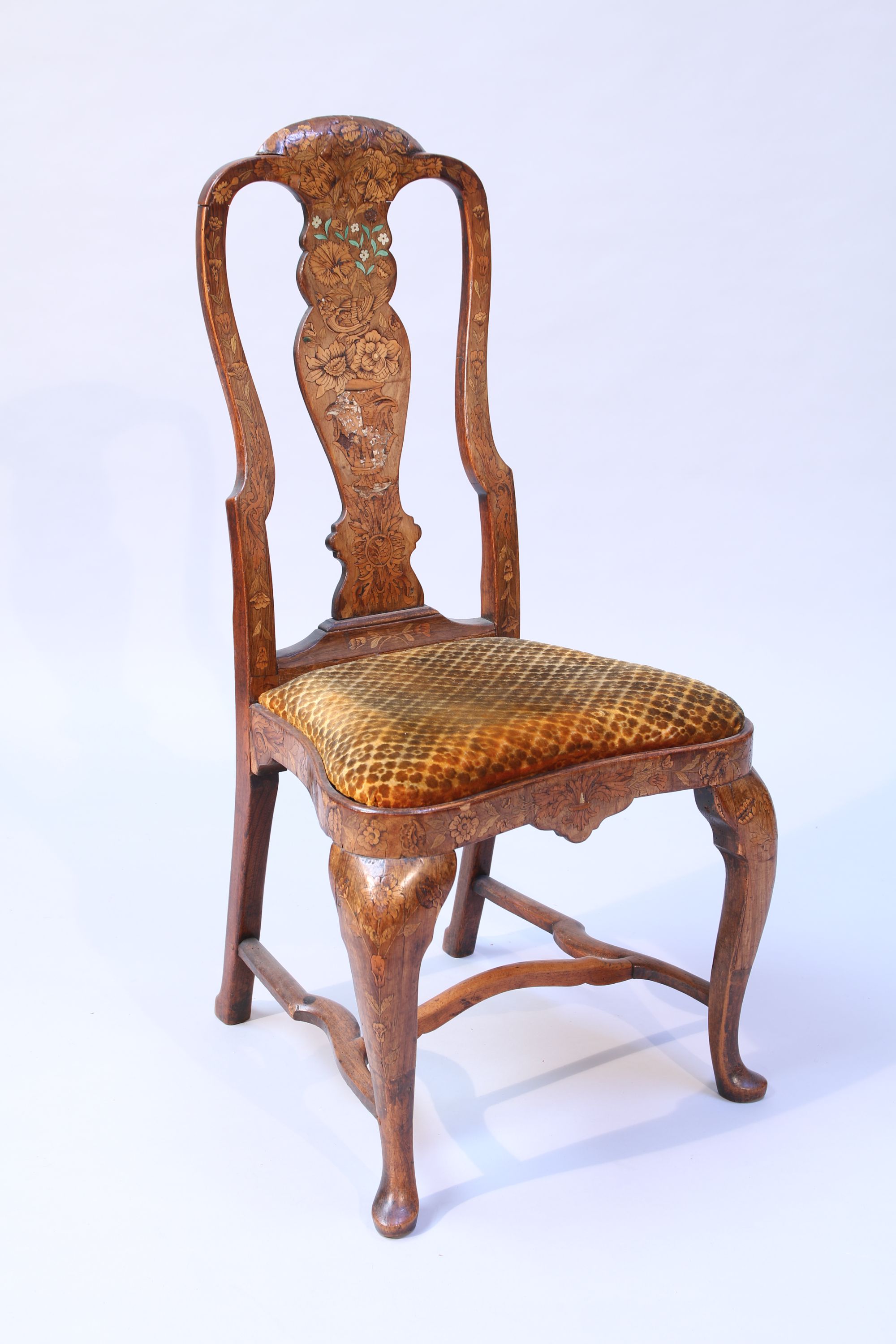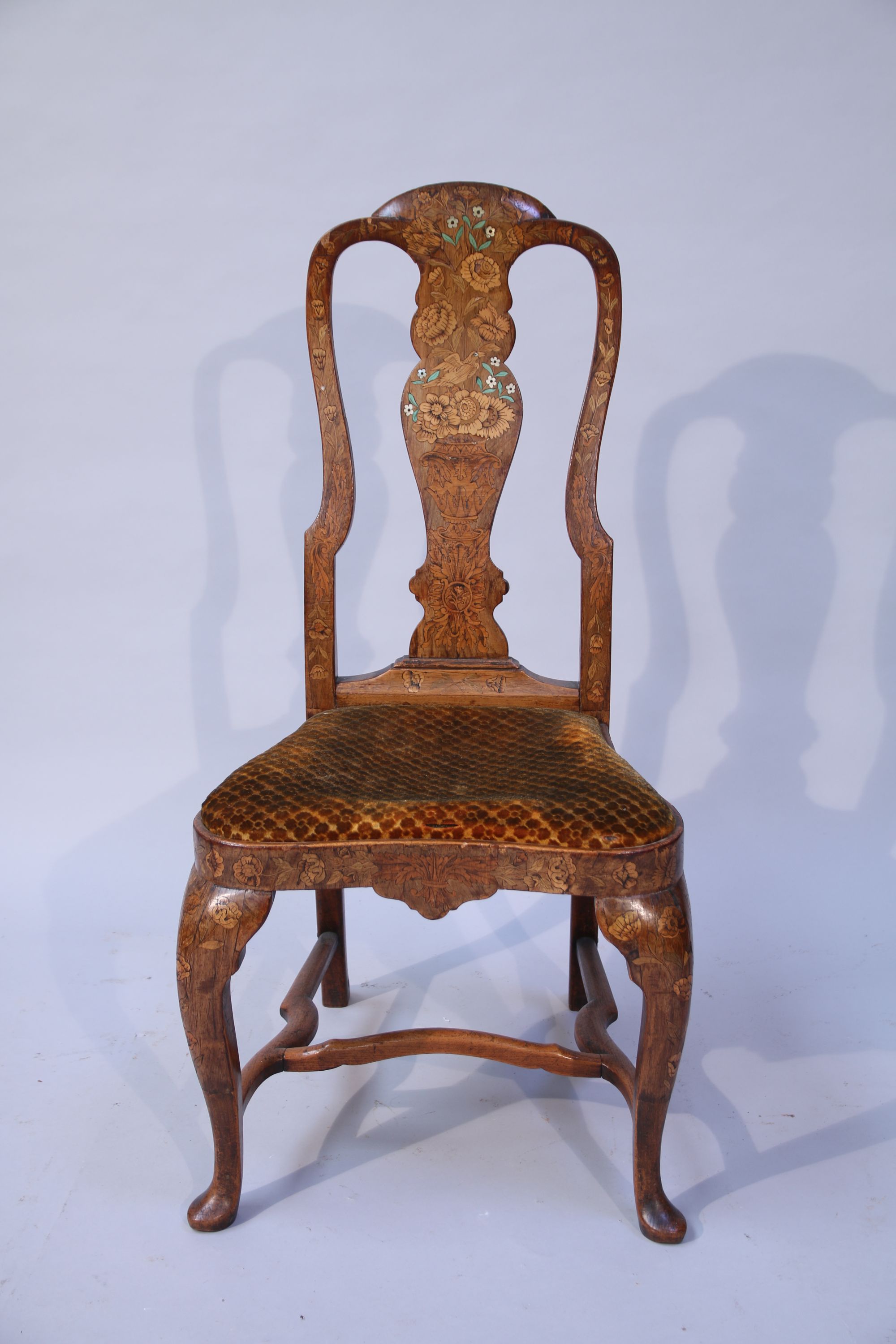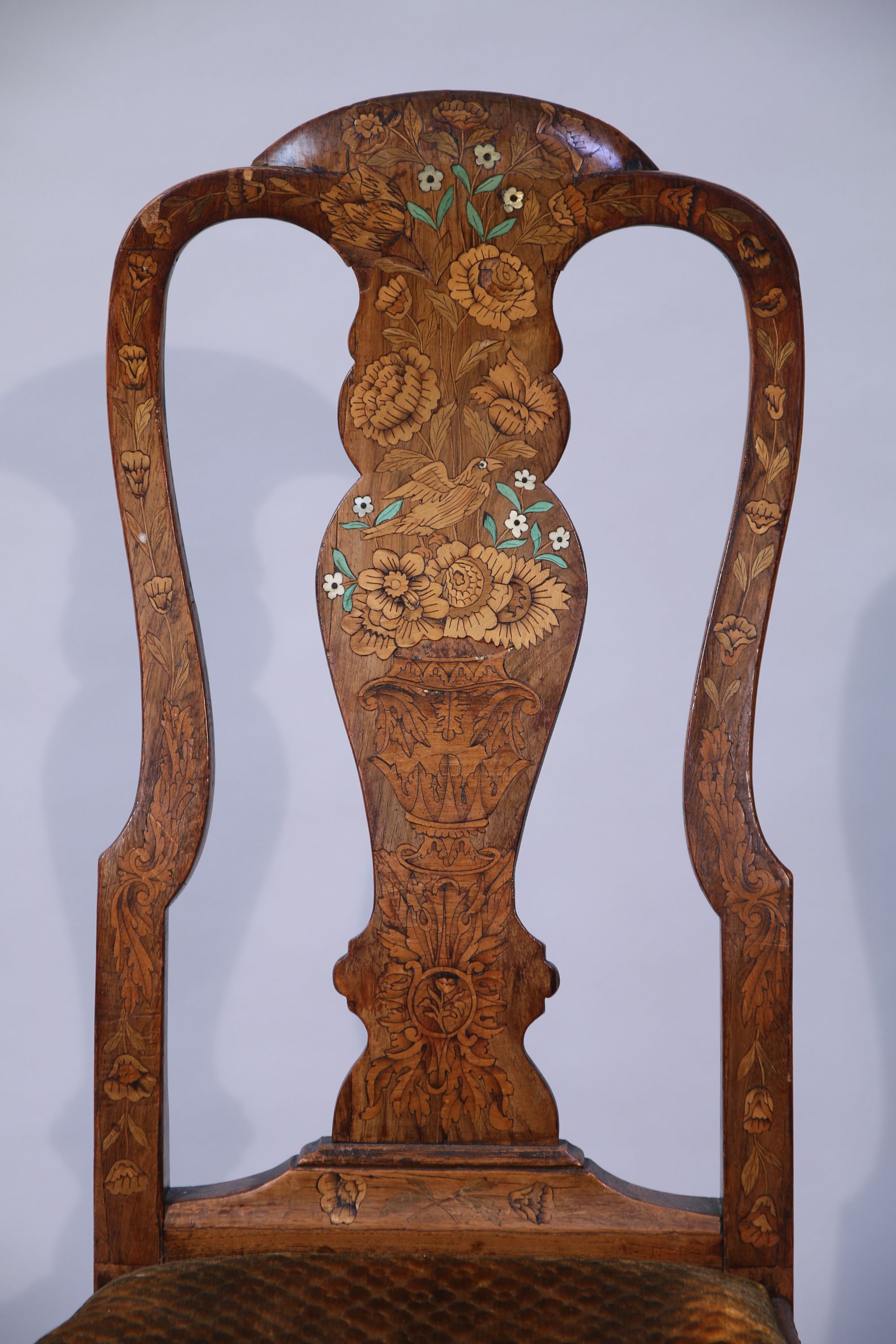 à dossier ajouré légèrement renversé, à décor marqueté d'oiseaux différentiés, de vases fleuris en bois clair, et de frises végétales aux incrustations vertes et blanches. Les pieds avant galbés reliés par une entretoise en "H".