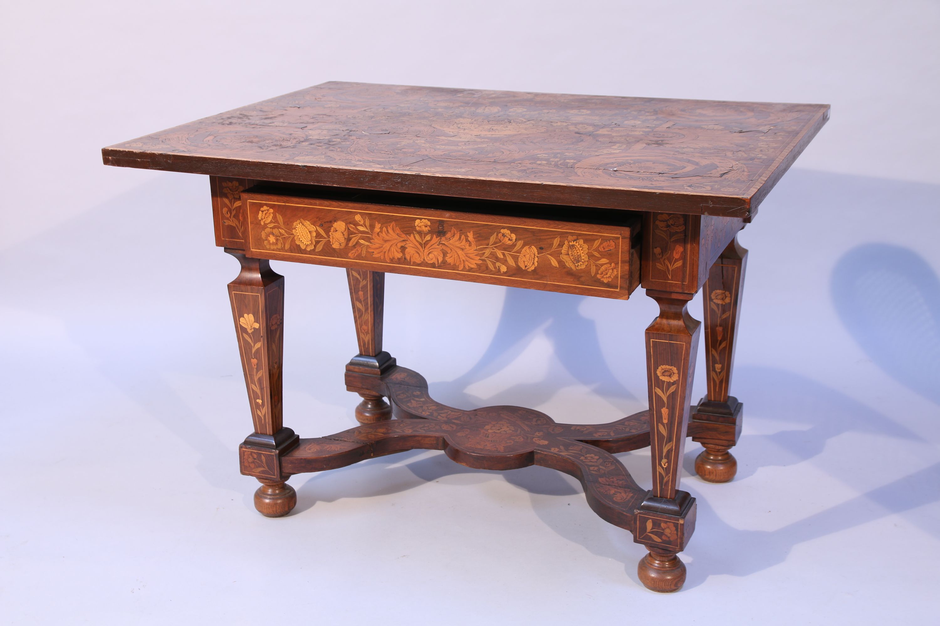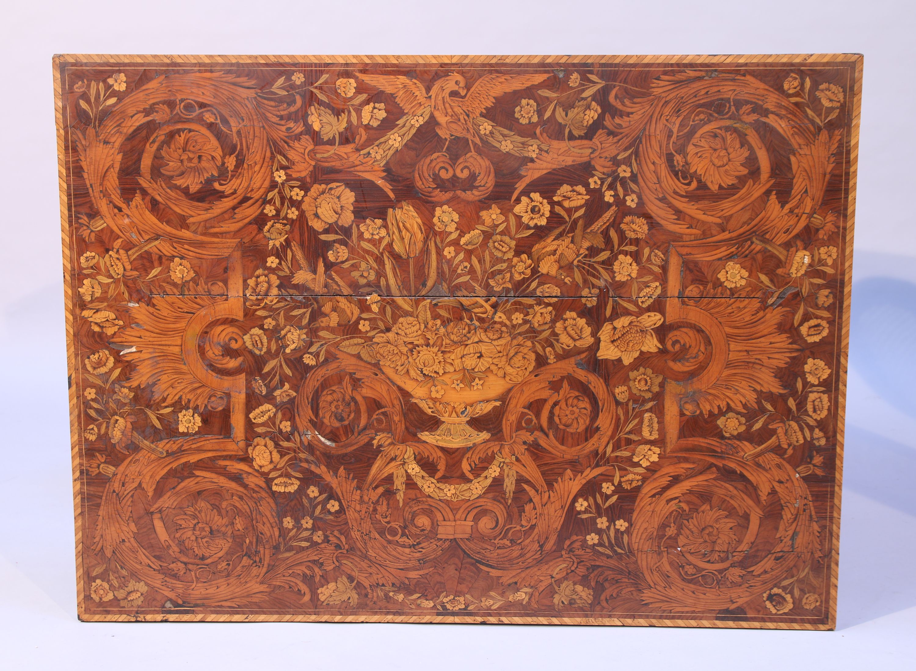 Le riche décor du plateau s'articulant autour d'un vase godronné sur piédouche fleuri d'une tulipe, de rinceaux stylisés et de volatiles, dont un rapace aux ailes déployées sur fond de rosaces naturelles du bois.