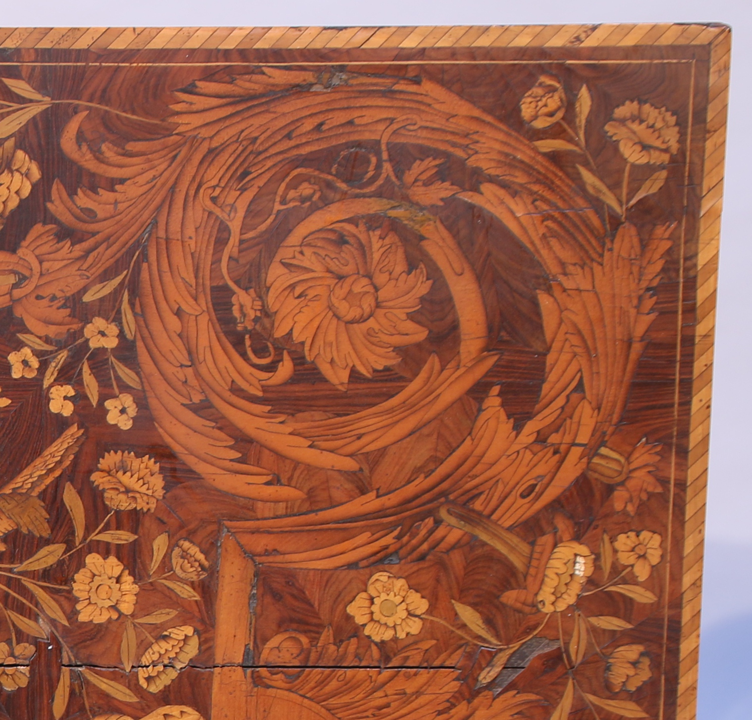 Le meuble entièrement marqueté de bois clair sur fond sombre à la polychromie insolée.