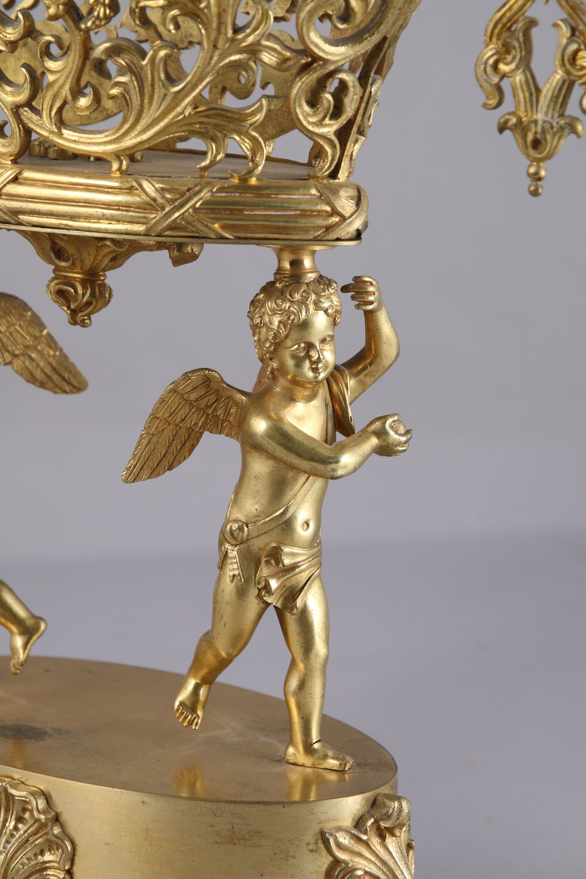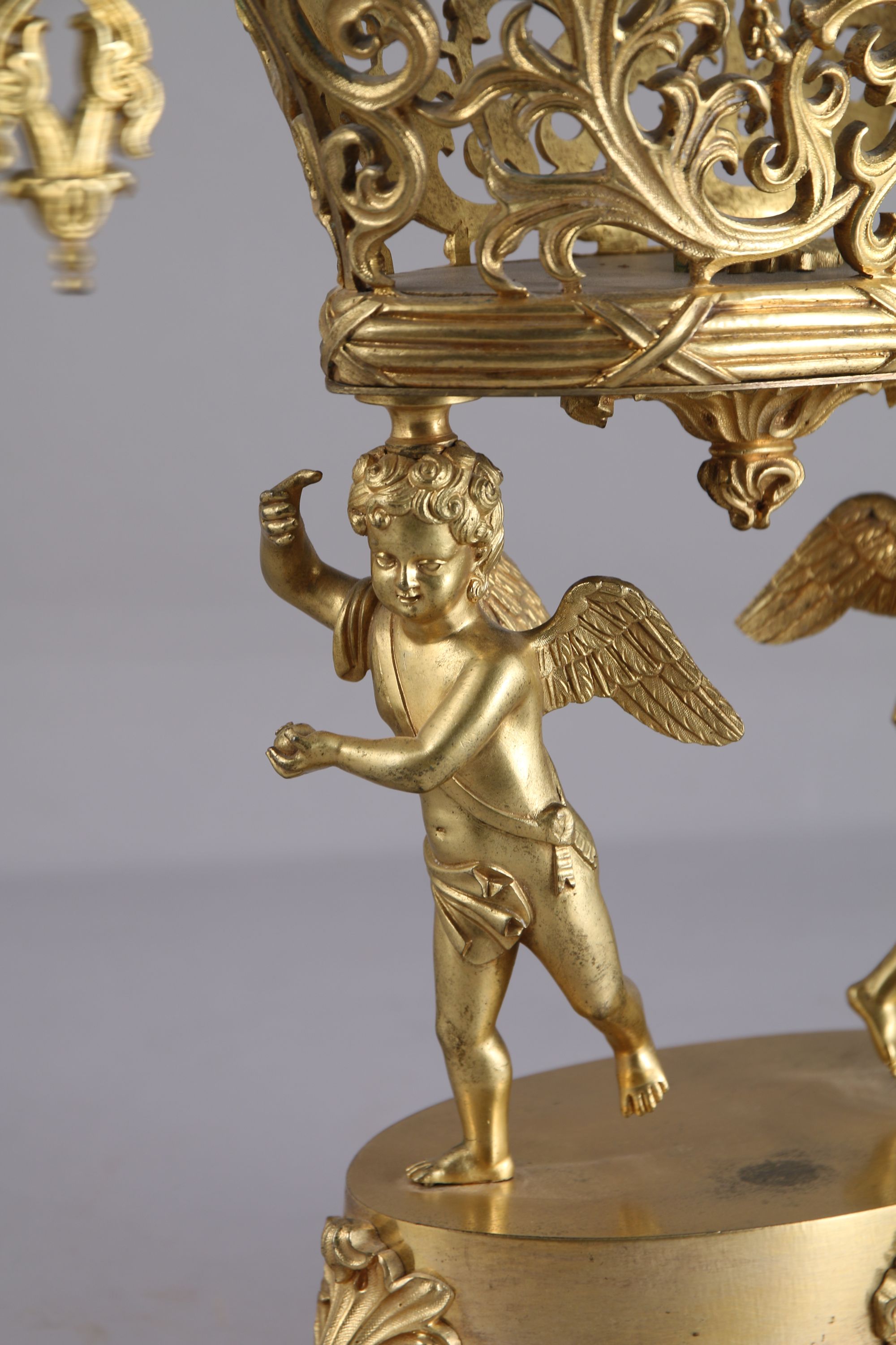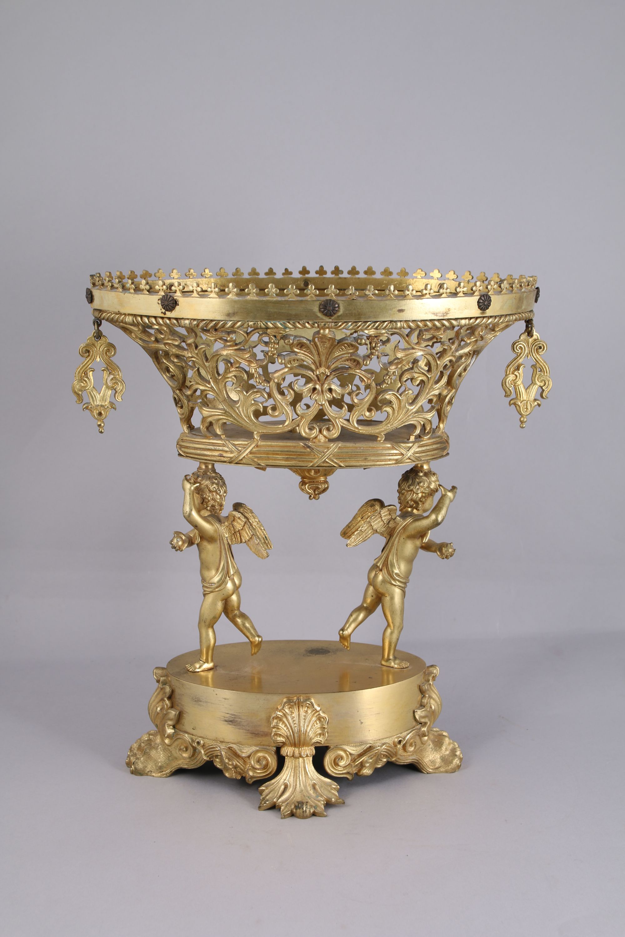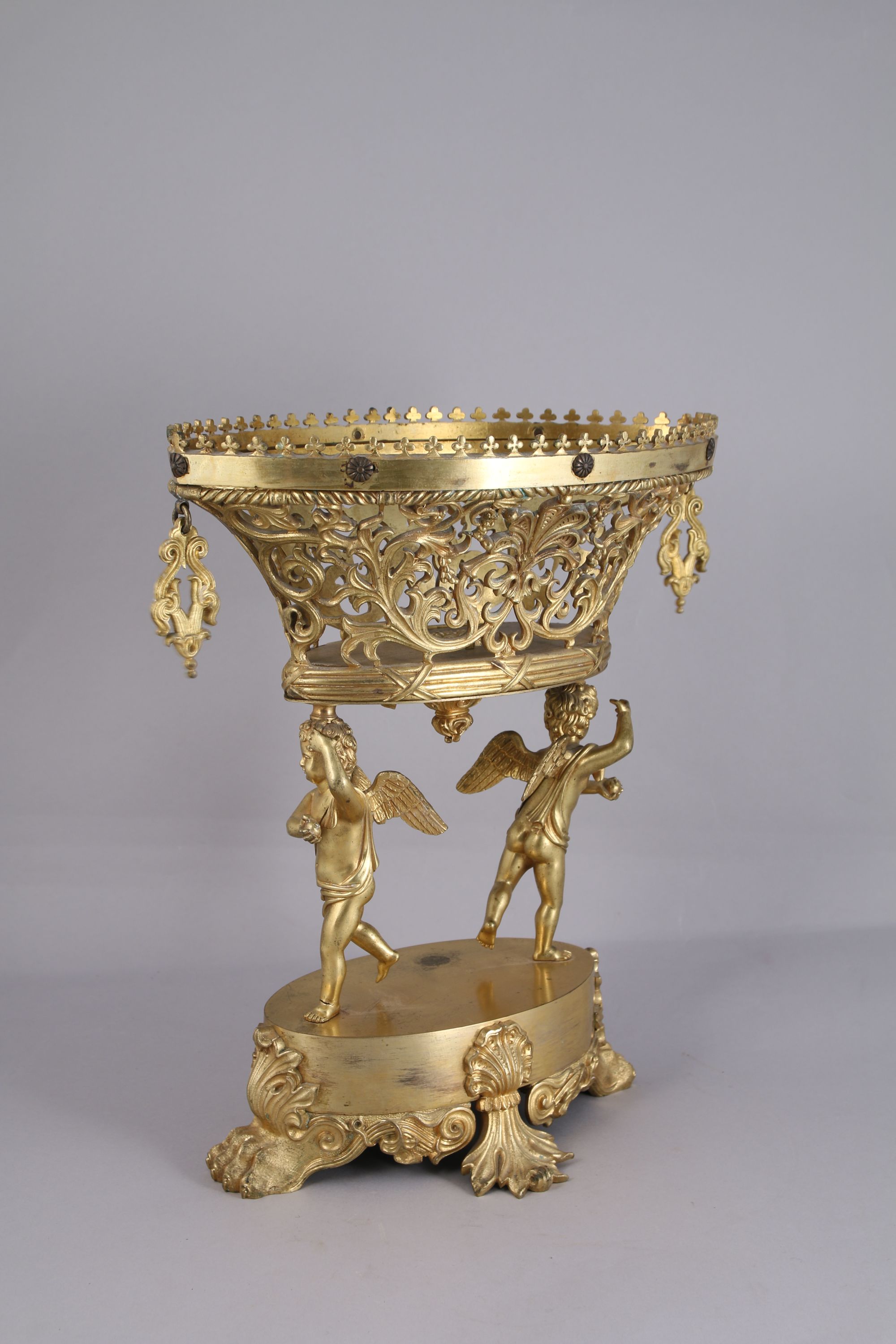 de forme oblongue en bronze ciselé et doré. Le réceptacle ajouré de rinceaux et palmettes est supporté par deux angelots reposant sur une base de forme ovale. Soulignée d'enroulements, elle est munie de quatre pieds, deux griffes et deux feuillagés à large attache en feuilles d'acanthe pour les premiers et en coquille pour les seconds.