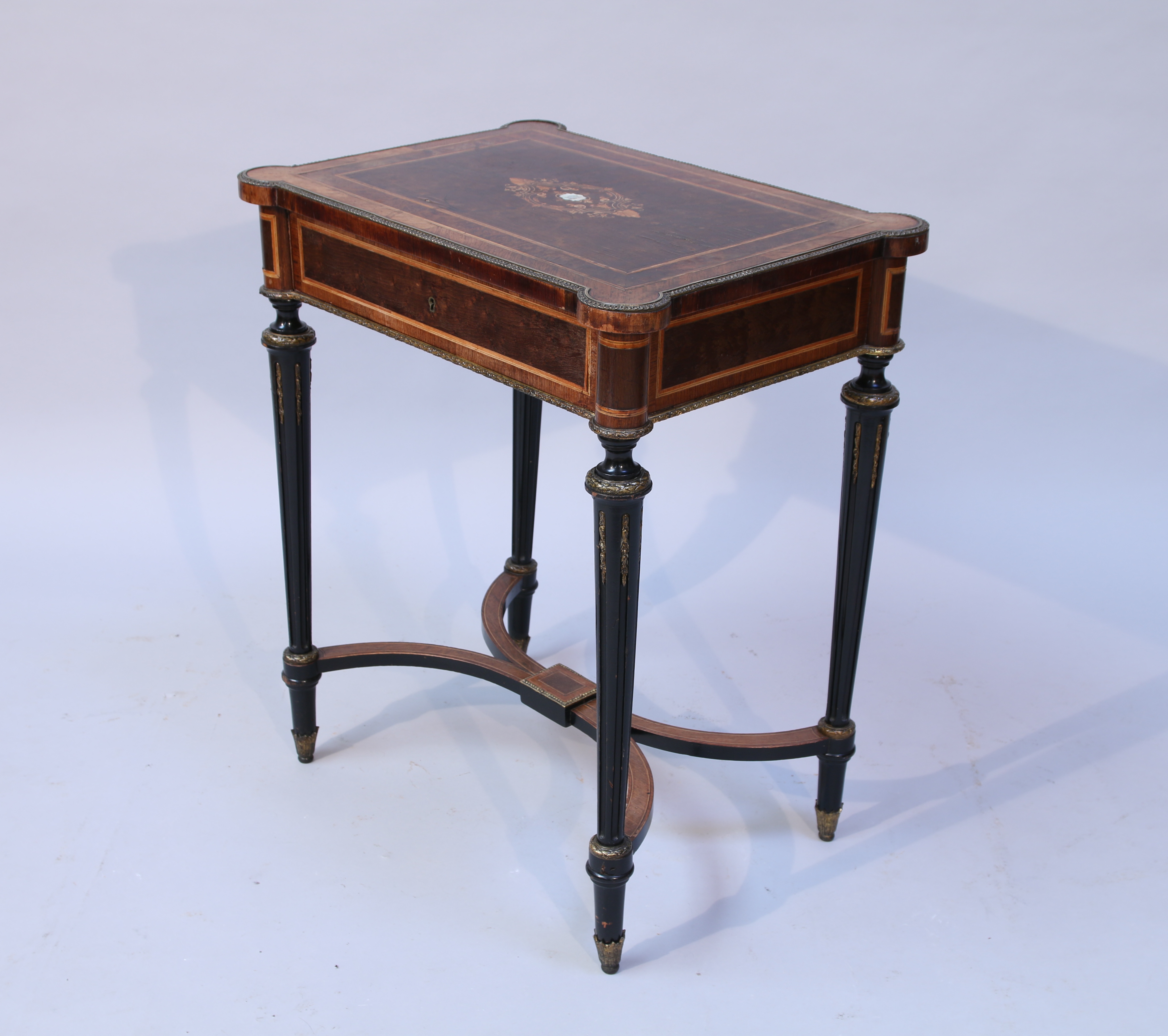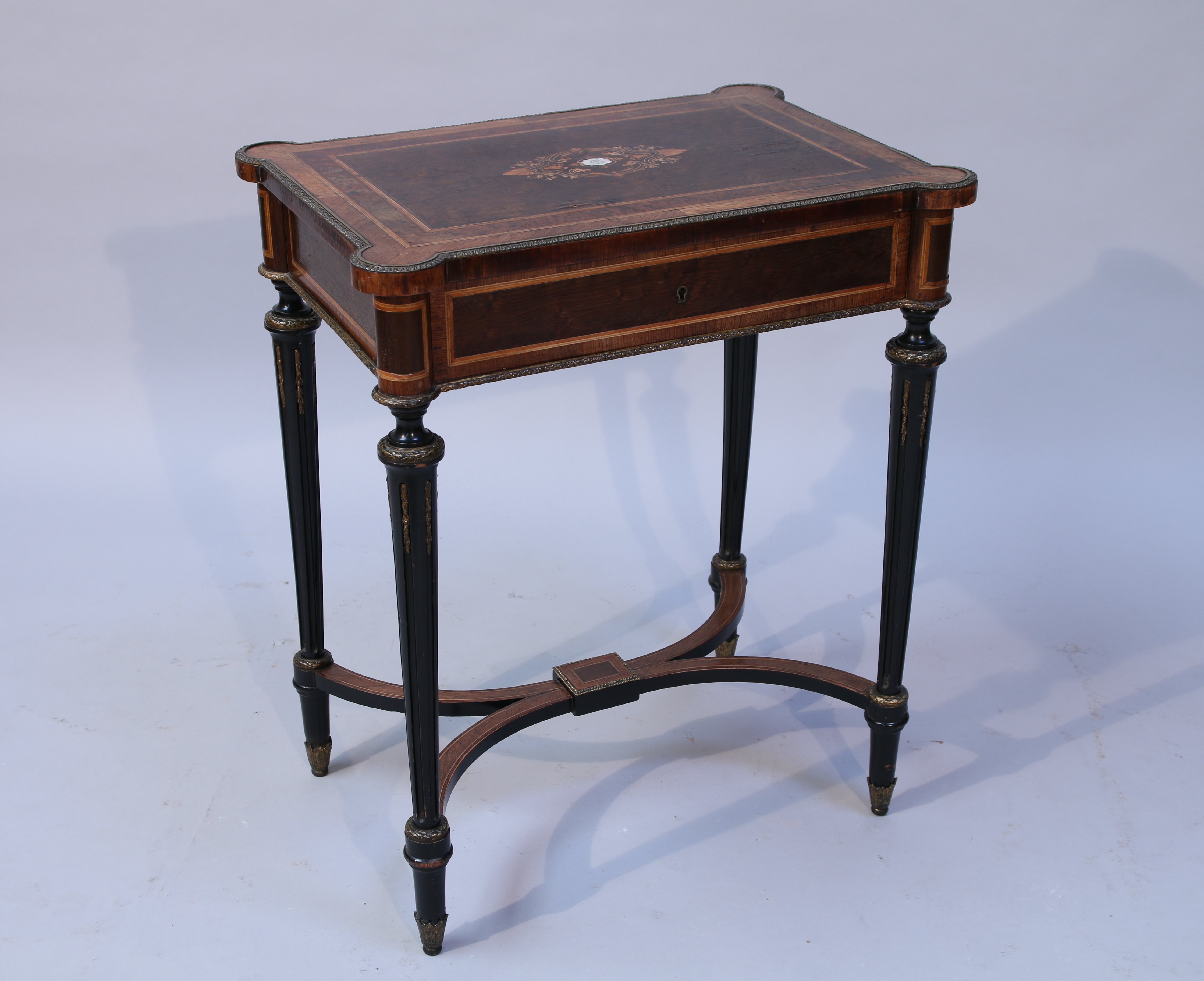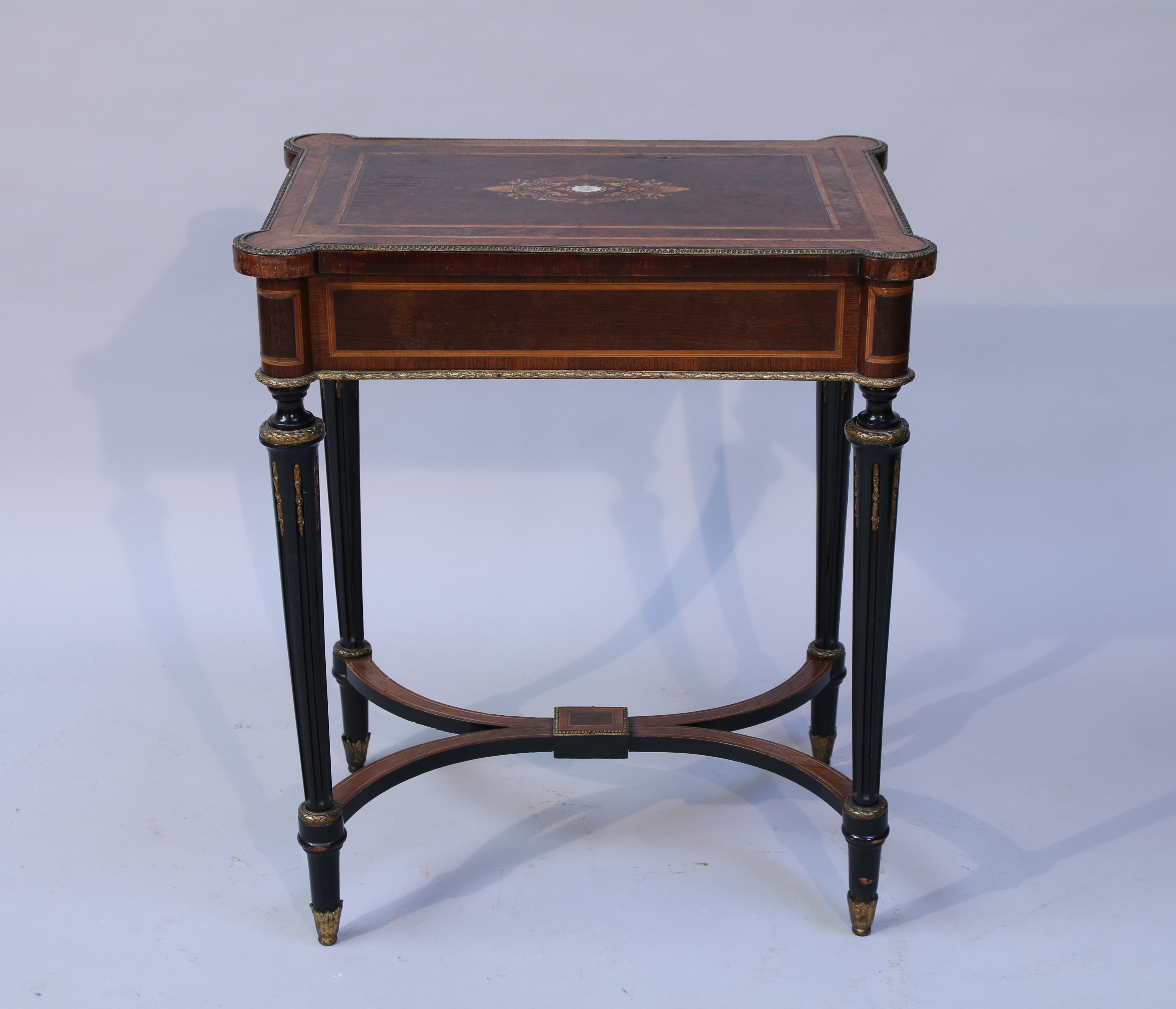 en bois de placage exotique, le plateau de forme rectangulaire finement marqueté en son centre d'un cartouche de nacre, avec les quatre angles en saillie arrondies, se soulève pour rélever un miroir. Elle ouvre en ceinture par un tiroir agrémenté de casiers de rangement. Elle repose que quatre pied fuselés, cannelés et rudentés réunis par une entretoise en x. Ornementation de cuivres et de bronze.