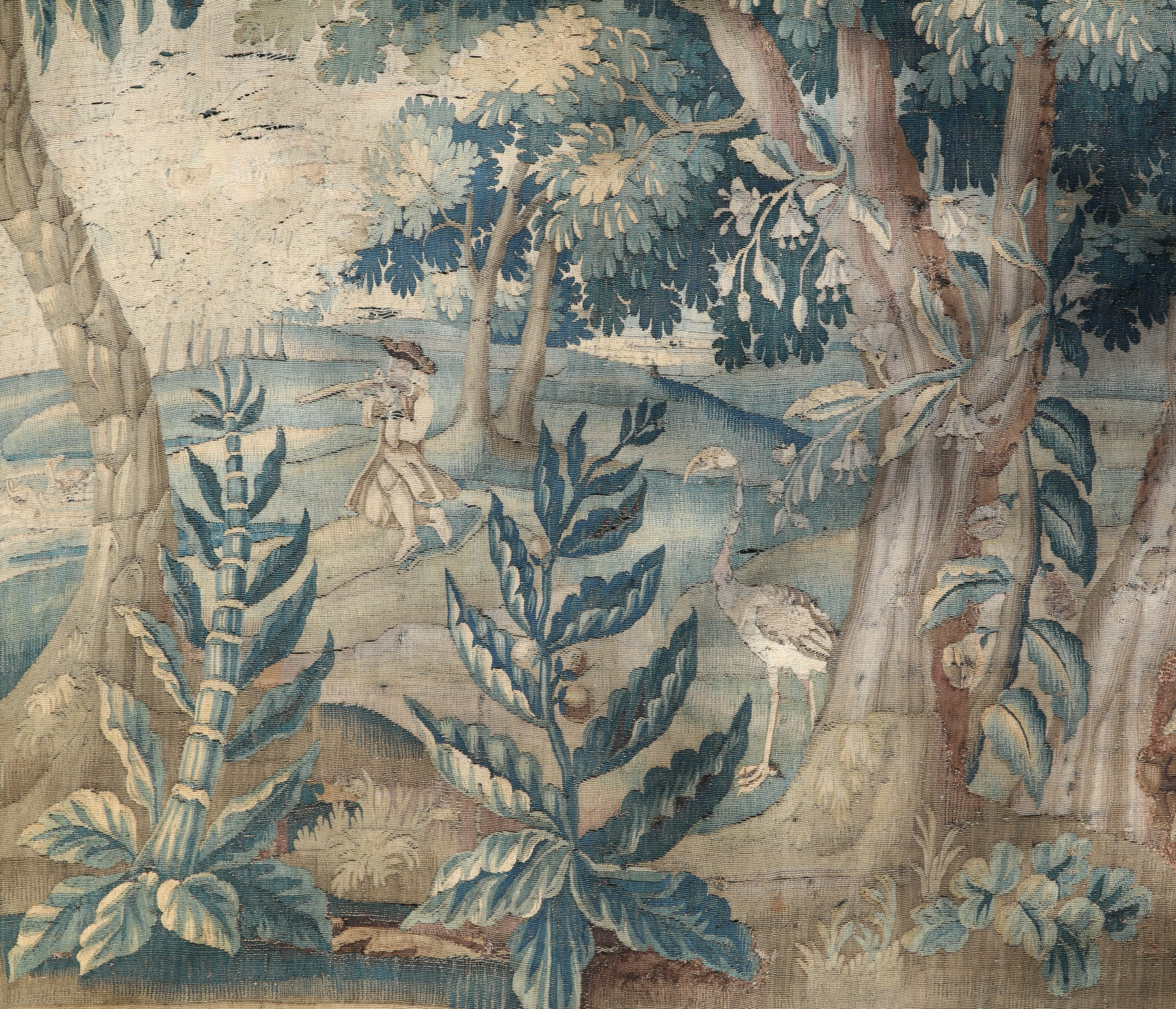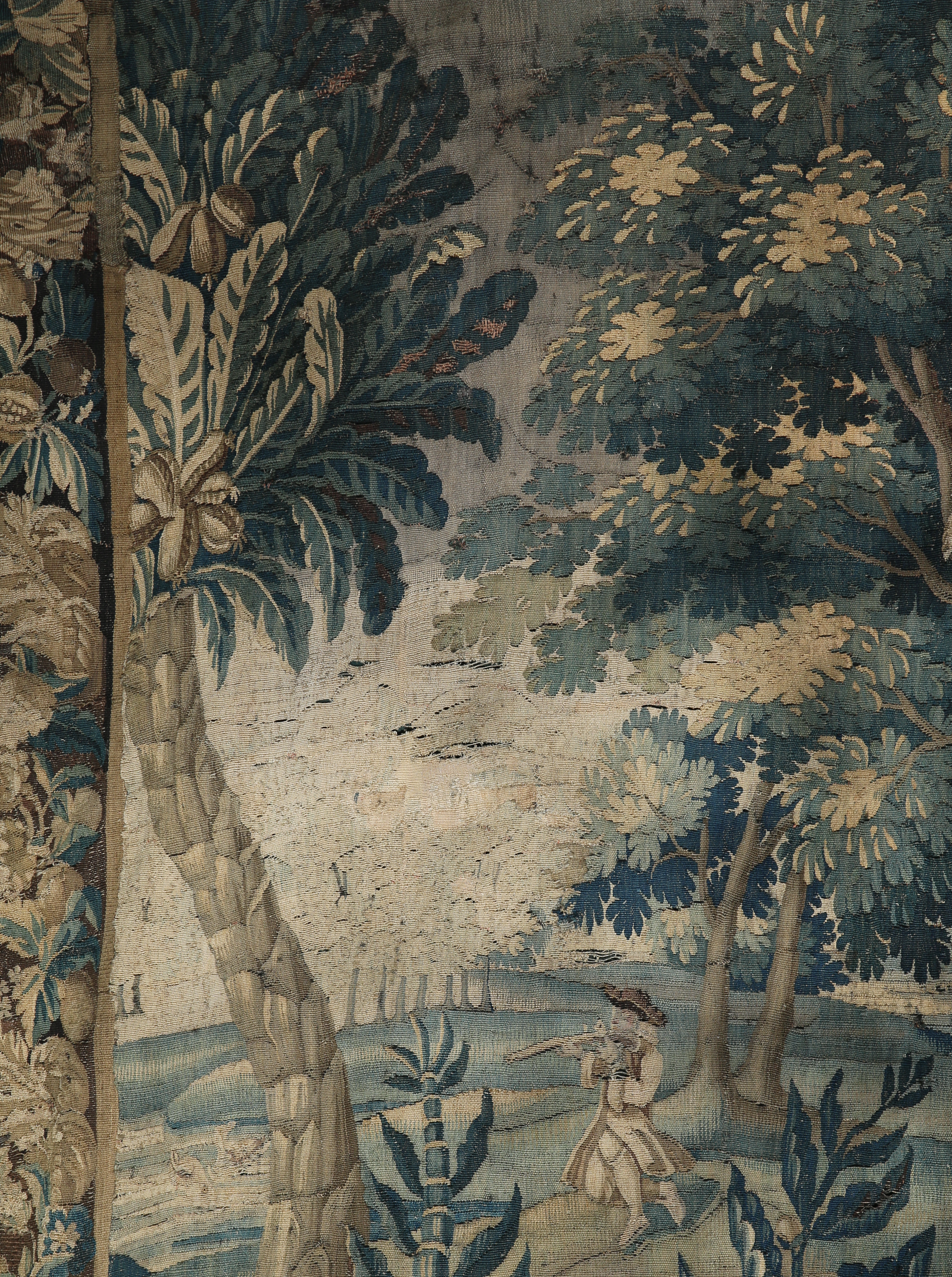 AUBUSSON. VERDURE en laine à décor d'une chasse aux canards, le volatile sur un plan d'eau surpris par un chasseur au fusil. La scène prend place dans un paysage arboré aux cocotiers où se cachent divers animaux tels un perroquet et un échassier. Bordure sur fond noir aux fruits, roses et feuilles d'acanthe, les coins en palmette.