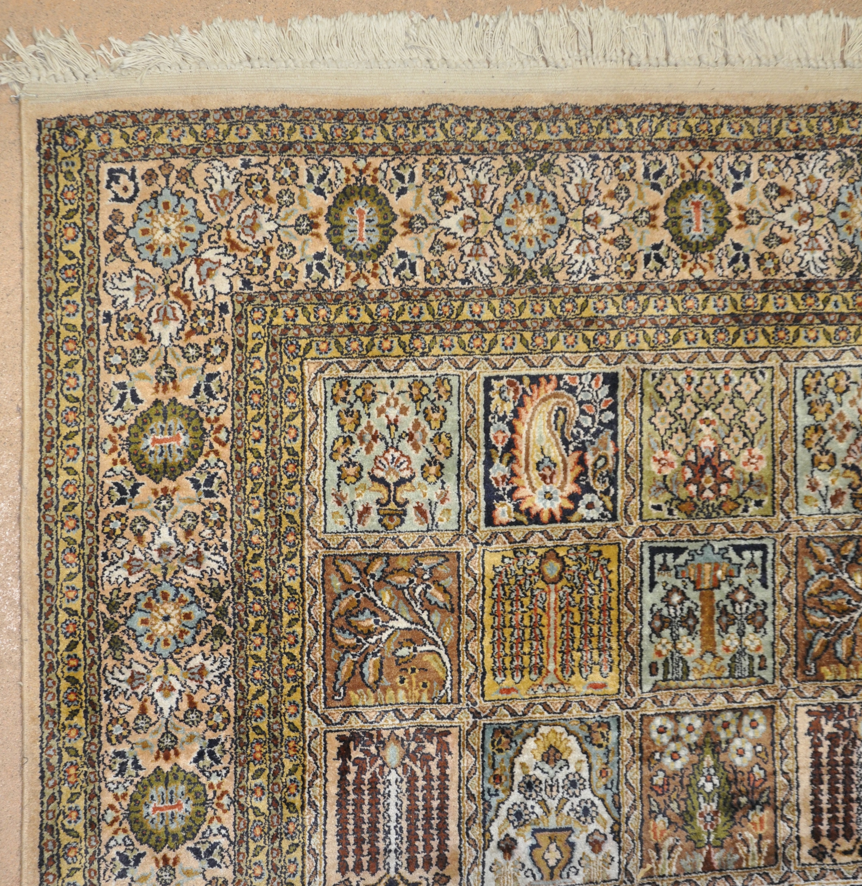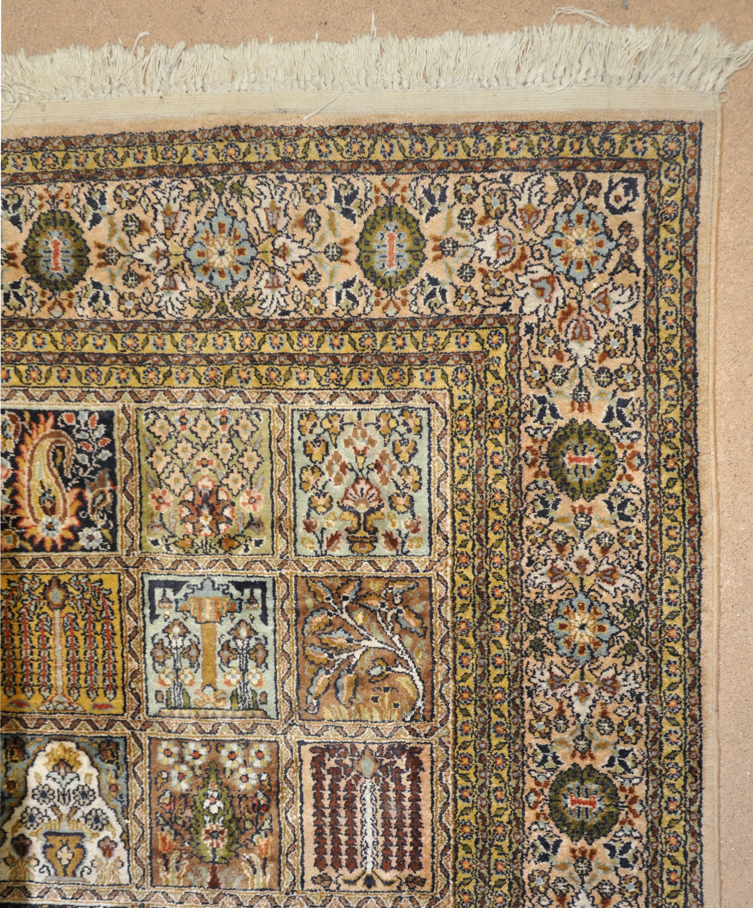 KHASHMIR. TAPIS en soie à fond taupe à décor polychrome de caissons. Bordure à décor floral sur fond rosé entre deux contre-bordures.