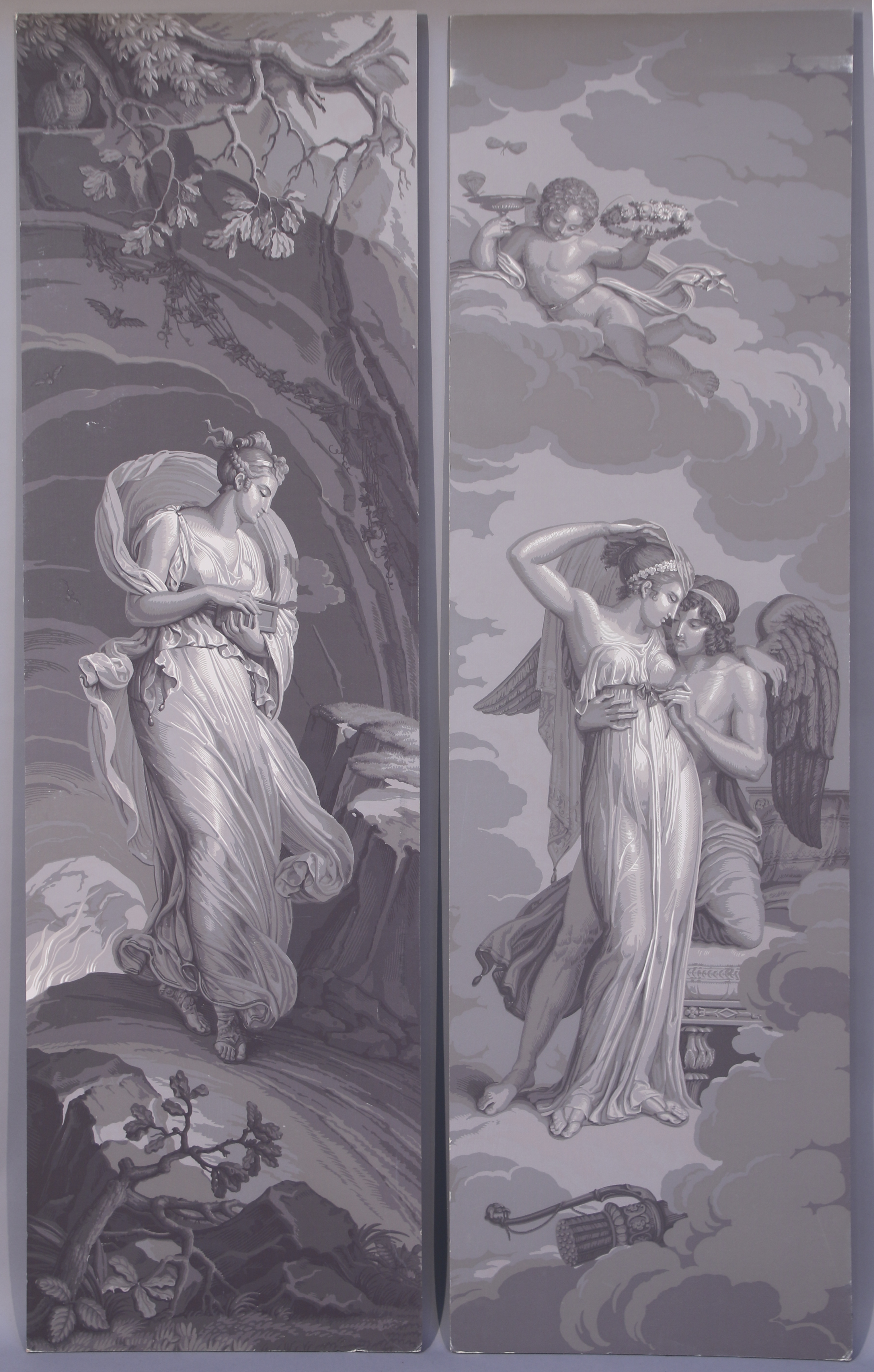 Les douze tableaux au complet, répartis sur vingt-six lés au total, se réfèrent au roman de Jean de La Fontaine, Les Amours de Psyché et Cupidon, lui-même inspiré du conte de L'Âne d'or d'Apulée. Les titres des épisodes sont imprimés au bas de chaque lé. Cinq scènes sur les douze s'inspirent des gravures de Gérard (BN, Est., Dc 55a f° 72) pour l'édition Didot et une de Prud'hon, Psyché enlevée par les Zéphyrs. L'attribution, par Clouzot, de la composition du décor à Blondel et Laffitte, qui ont probablement servi d'intermédiaires entre l'oeuvre de Gérard ou Prud'hon et le papier peint, repose sur deux dessins provenant de la famille Dufour.