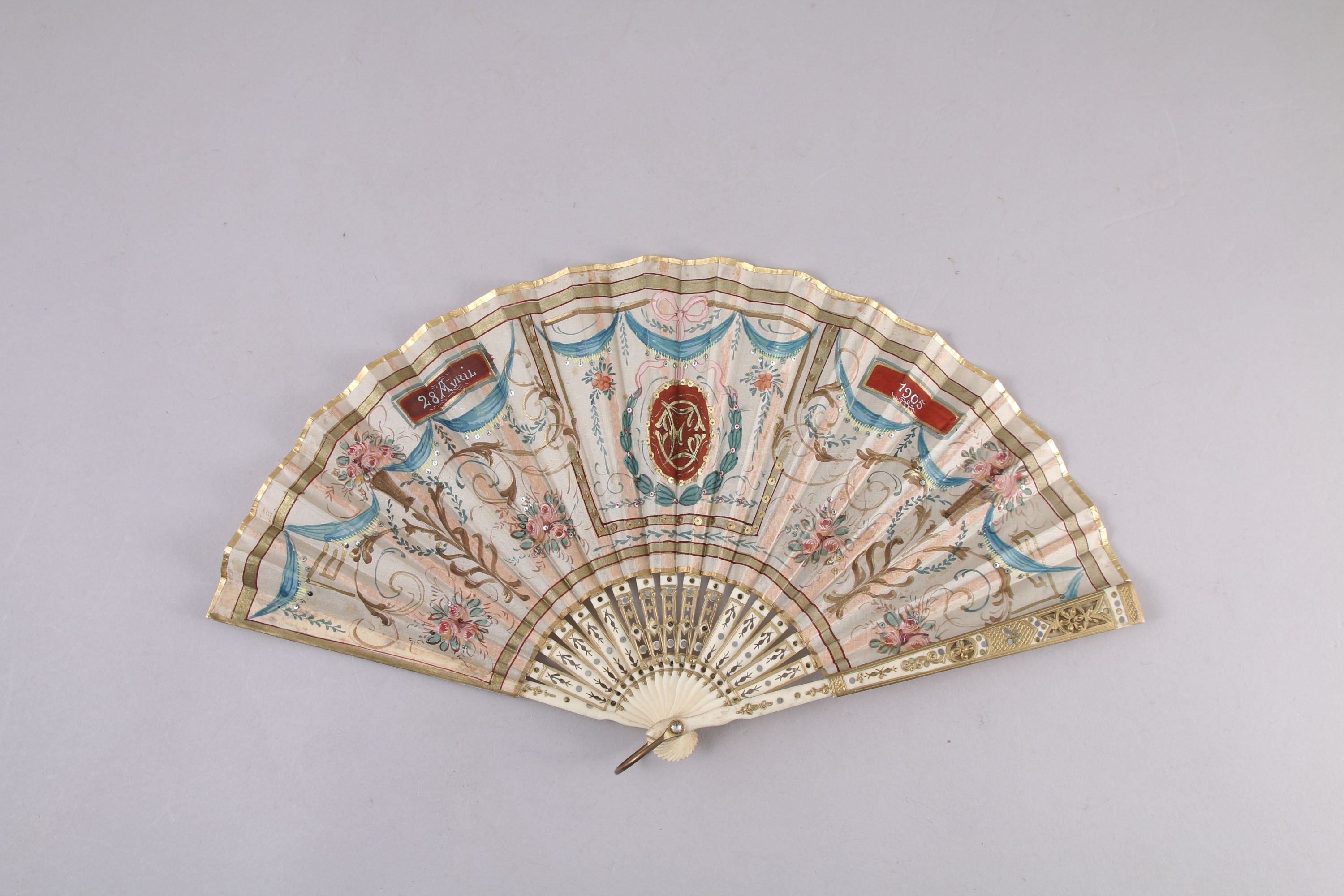 - ÉVENTAIL plié en toile peinte à la gouache figurant des motifs floraux et décoratifs, et ornée de sequins cousus. Inscription "28 Avril - 1905". Monture ajourée, gravée et rehaussée d'or. 16 brins. Haut. 18,5, Larg. 35 cm.