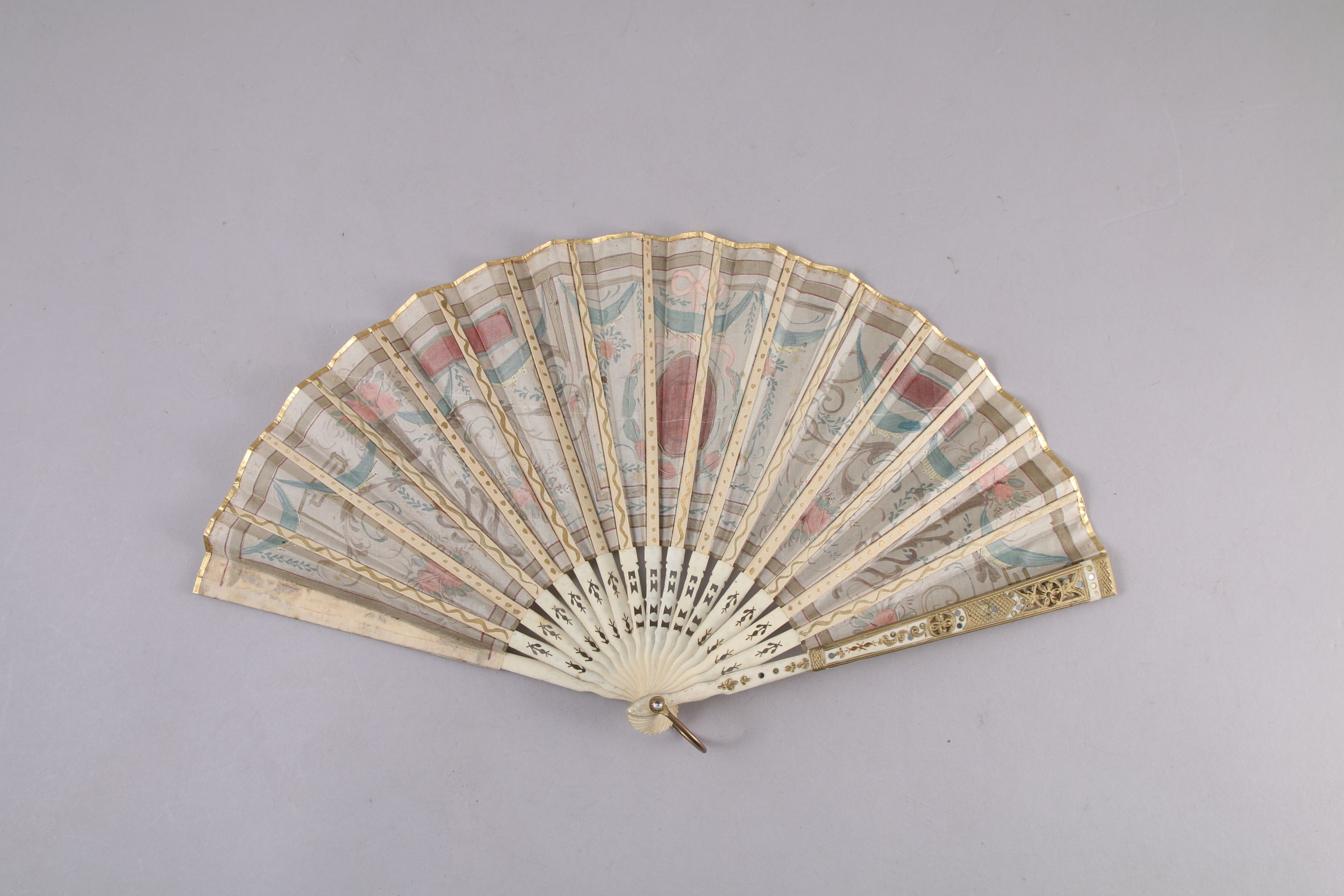 - ÉVENTAIL plié en toile peinte à la gouache figurant une scène galante à trois personnages et ornée de sequins cousus en arabesques. Monture ajourée, gravée et rehaussée d'or et d'argent. 14 brins. Vers 1780. Haut. 27, Larg. 49 cm.