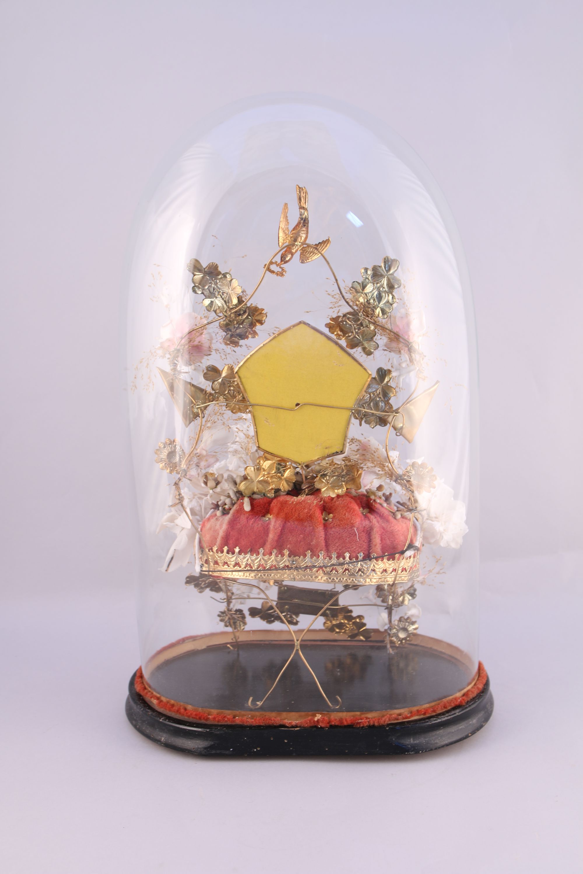 constitué d'un coussin de velours rouge à armature de métal doré. Riche garniture de fines plaques de métal doré embouti à décor de trèfles, de fleurs et d'une colombe. Elle est agrémentée de fleurs en papier et porcelaine, de branches d'oranger et de quatre miroirs. Sous globe à socle de bois noirci.