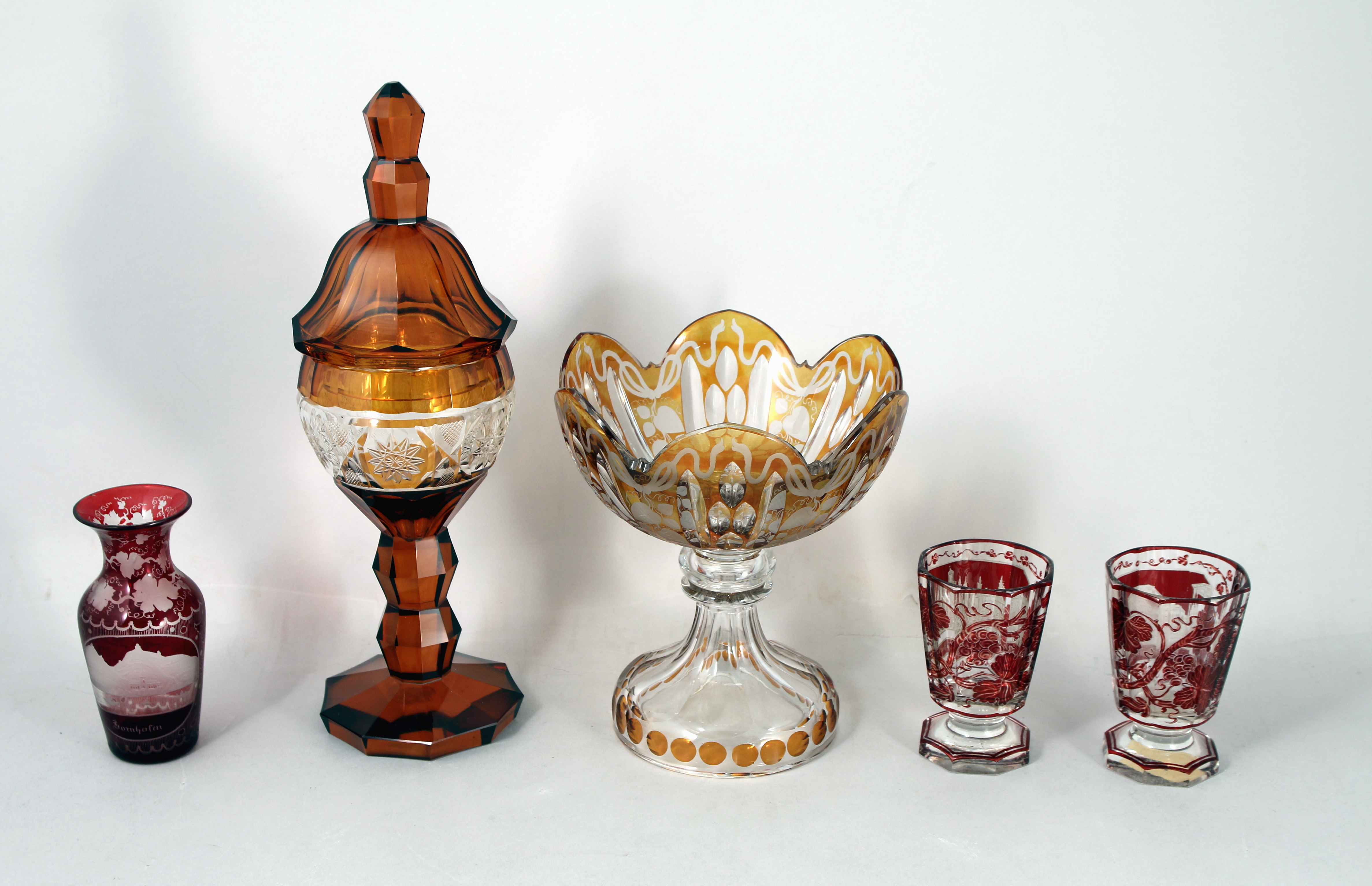 - DRAGEOIR en cristal de Bohème doublé de couleur ambre et taillé à pans. Réceptacle de forme ovoïde à frise d'étoiles. XXe. Haut. 30, 5 cm.