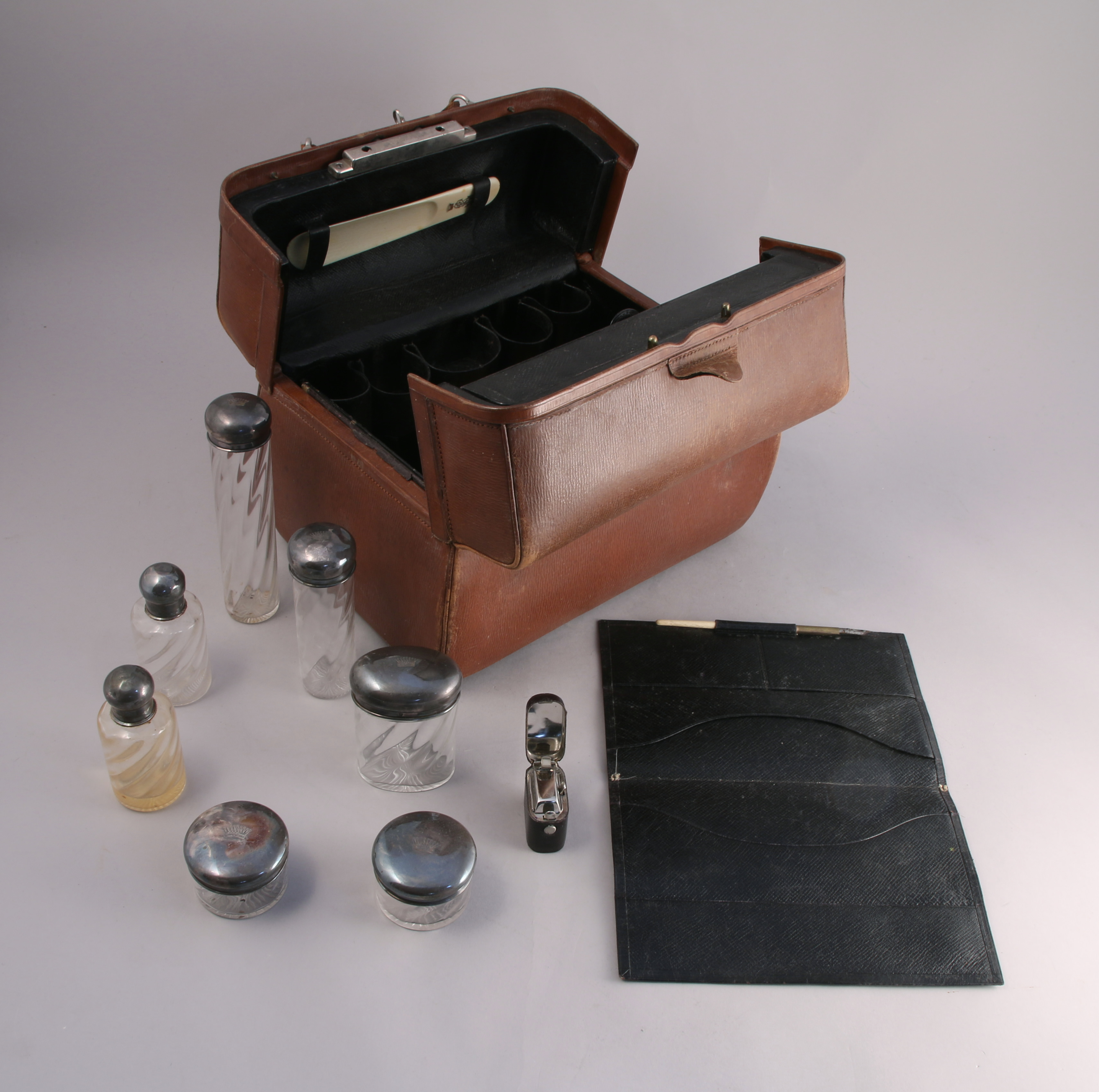 - d'un NÉCESSAIRE de TOILETTE comprenant un ensemble de sept boîtes ou flacons de formes diverses en verre torsadé à bouchon d'argent gravé d'une couronne comtale; trois brosses monogrammées "LH"; un peigne; un miroir (brisé); un fer à friser; une boîte à lumière; un ensemble de neuf petits ustensiles et un chausse-pied monogrammé "LH";