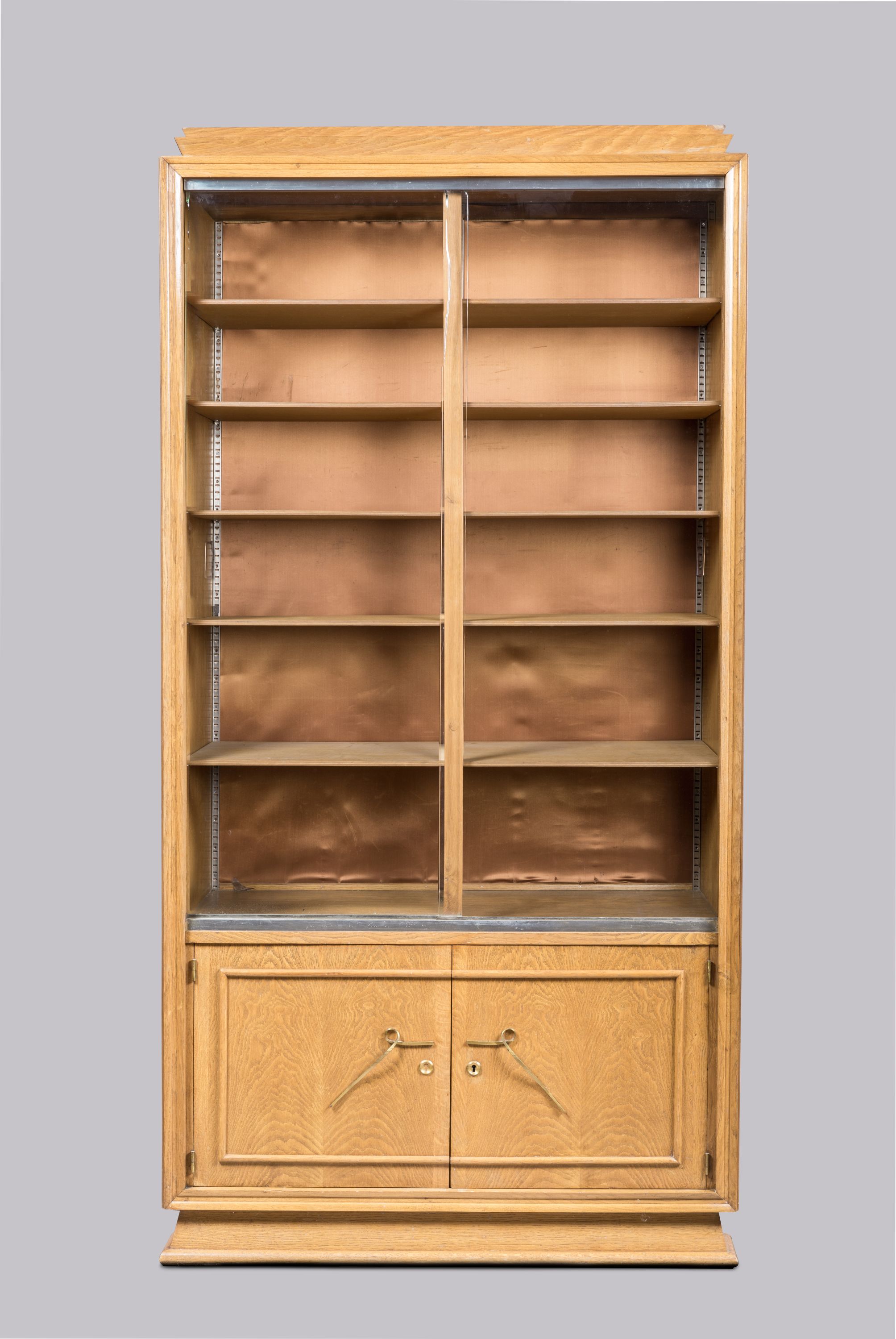 en bois naturel mouluré. Elle ouvre en partie haute par deux portes vitrées coulissantes (accidents) et en partie basse par deux vantaux munis de poignées de tirage et entrées de serrure en bronze doré.