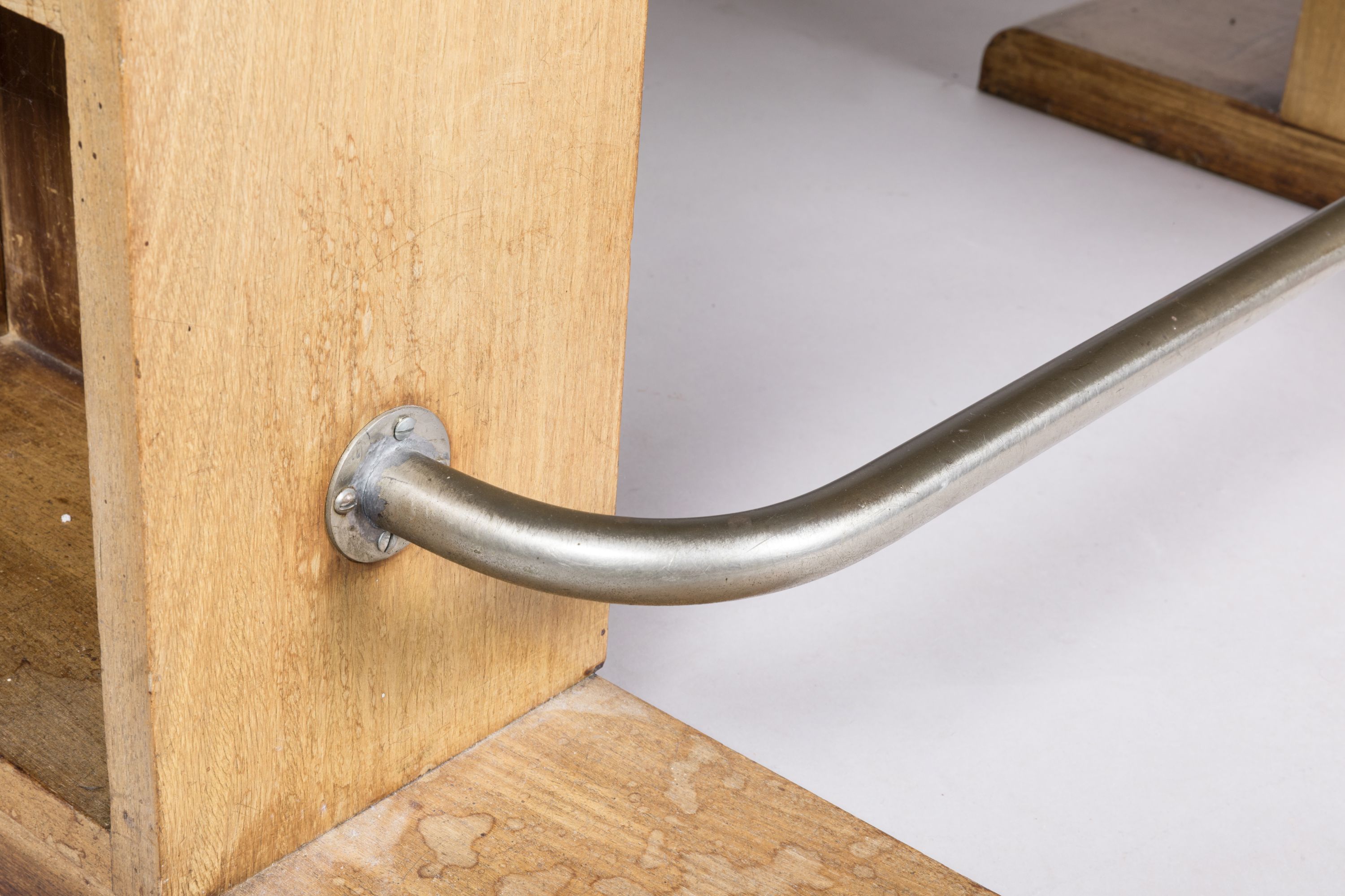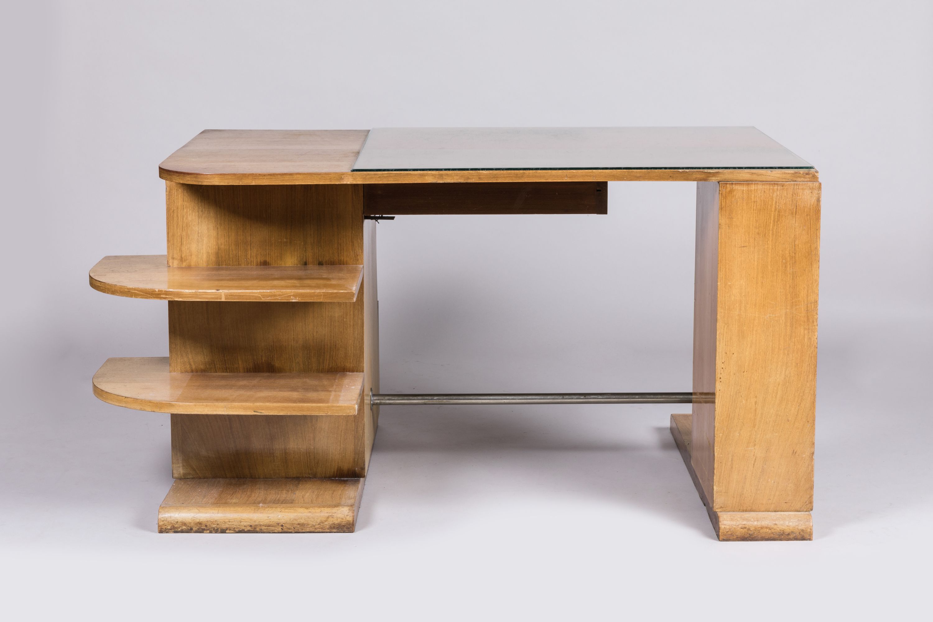 en placage de bois clair. Du côté droit, il est muni d'un caisson présentant trois tiroirs à poignées de verre enrichis de deux étagères. Du côté gauche, un montant accueille deux niches. Il ouvre par un tiroir en ceinture. Le plateau en partie foncé d'une toile enduite. Repose-pieds constitué d'une barre tubulaire. Pieds patins.