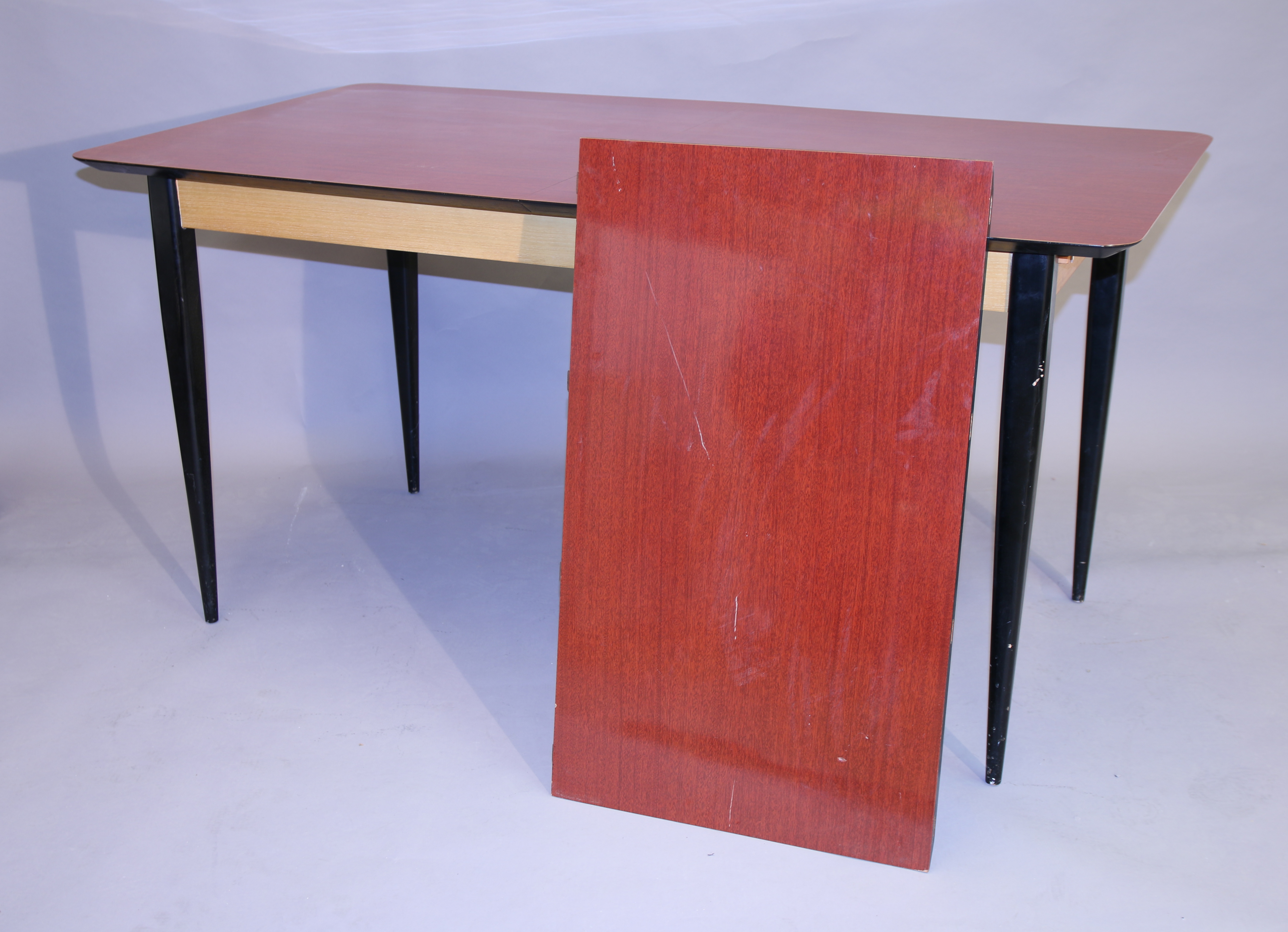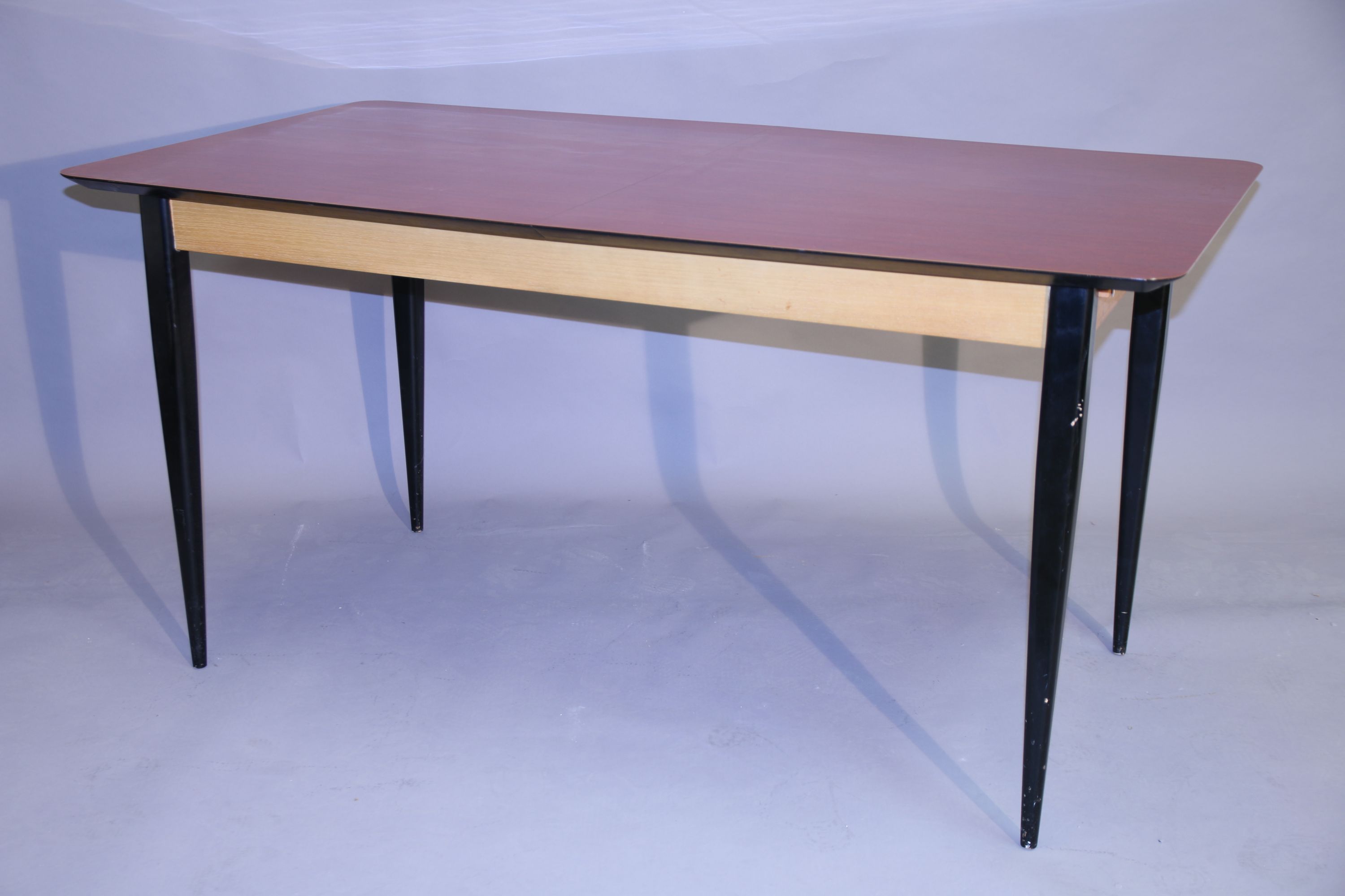 au plateau en bois vernis rouge et noir, pieds fuselés en métal noir.