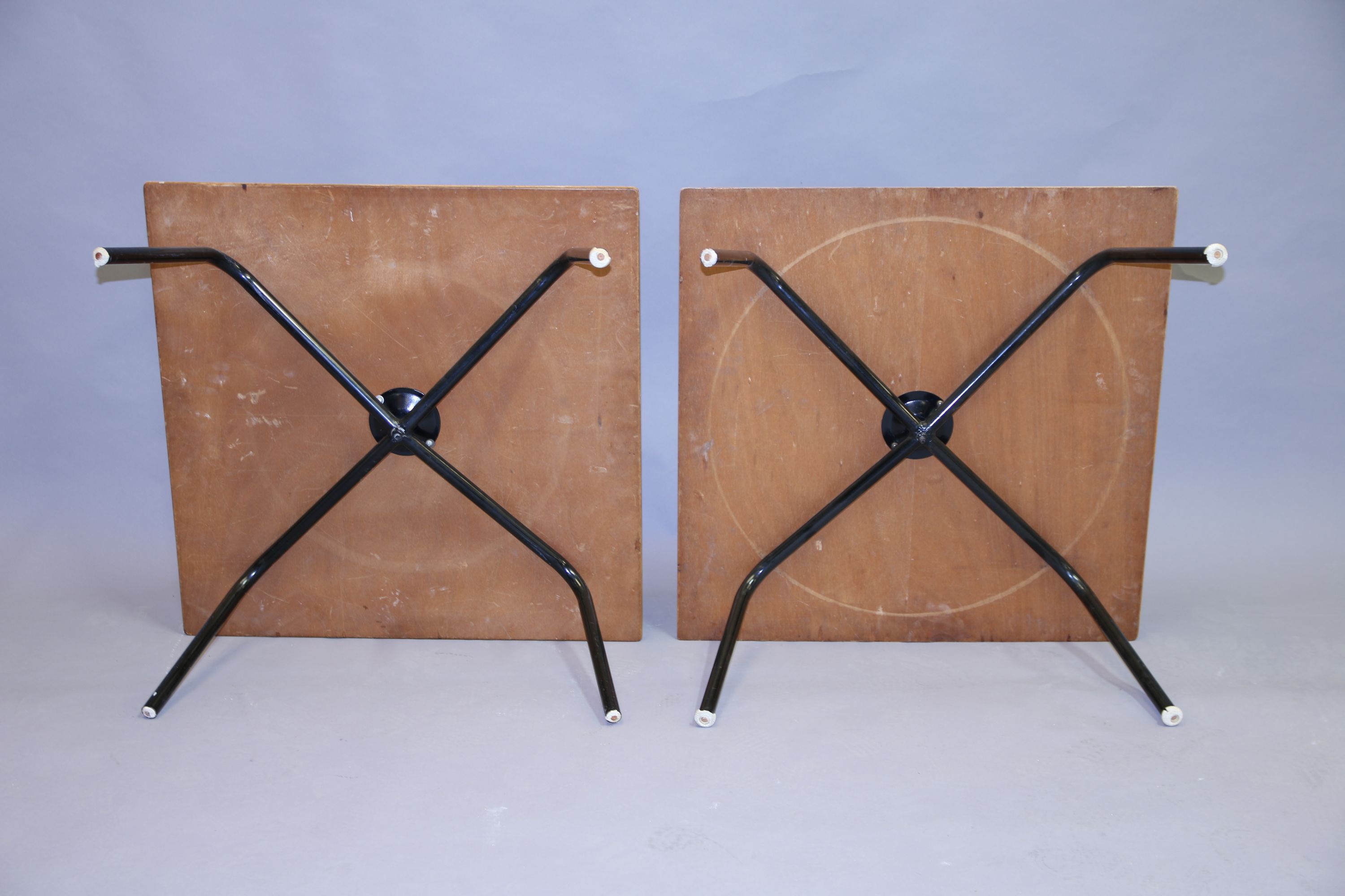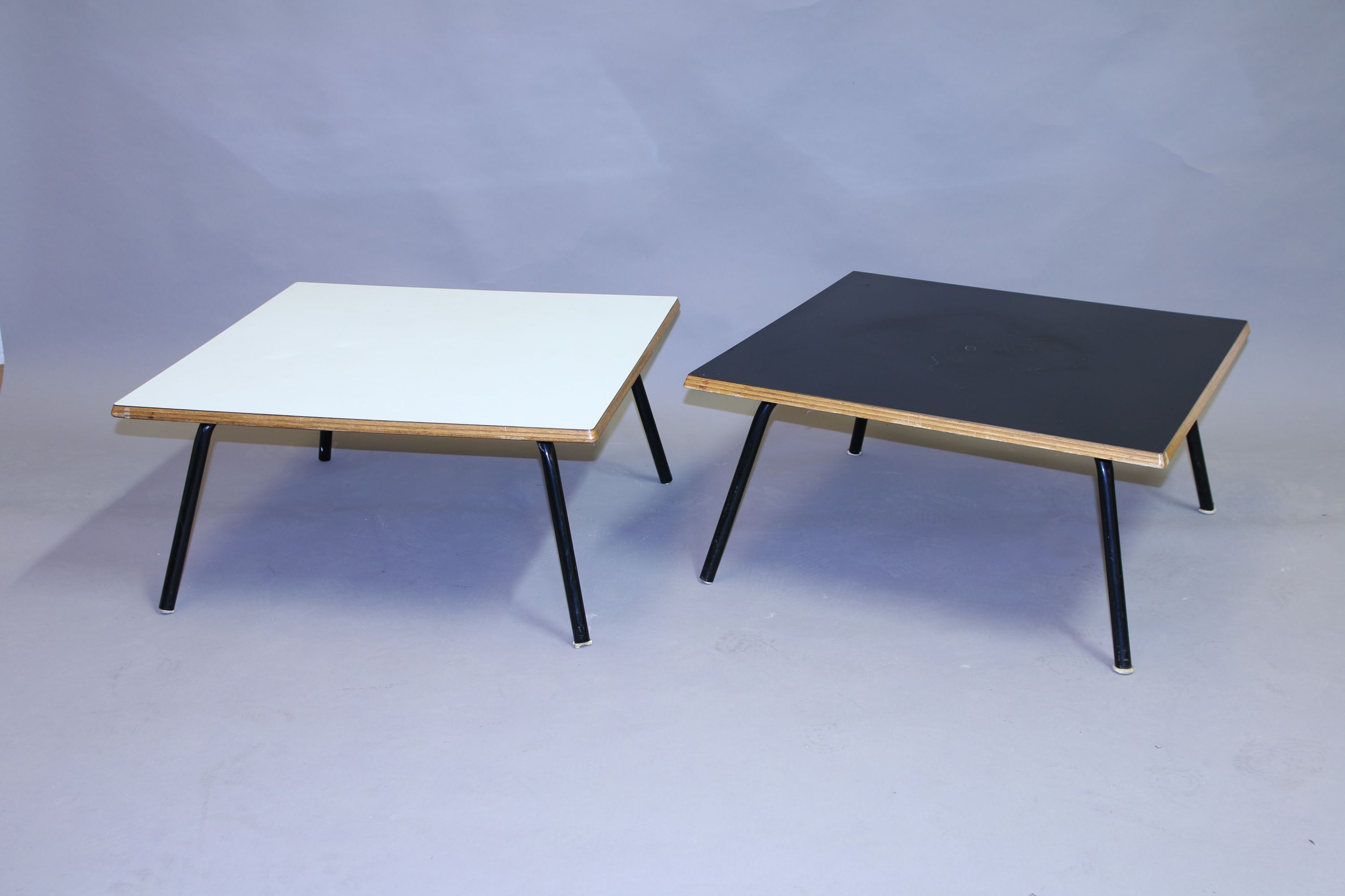 JOINT : PAIRE de TABLES aux plateaux quadrangulaires en formica blanc et noir, piètement métallique croisé. Travail des années 1960. Haut. 33,5, Plateau: 69 x 69 cm. (en l'état)