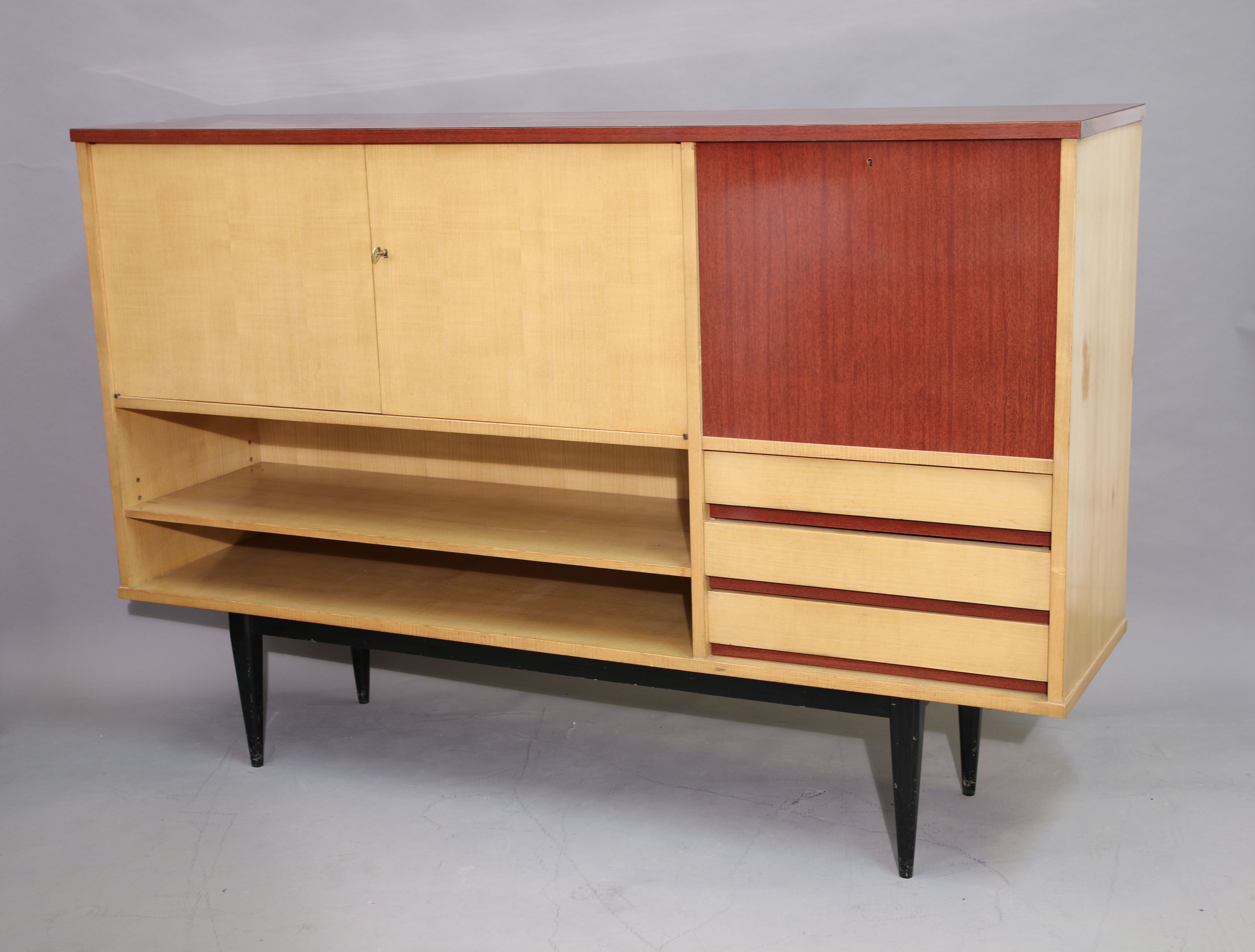 en placage de bois clair et sapelli, ouvrant à deux portes et présentant deux étagères dans sa partie gauche, un abattant et trois tiroirs dans sa partie droite. Pieds fuselés en métal noir. Jolies clés en laiton.