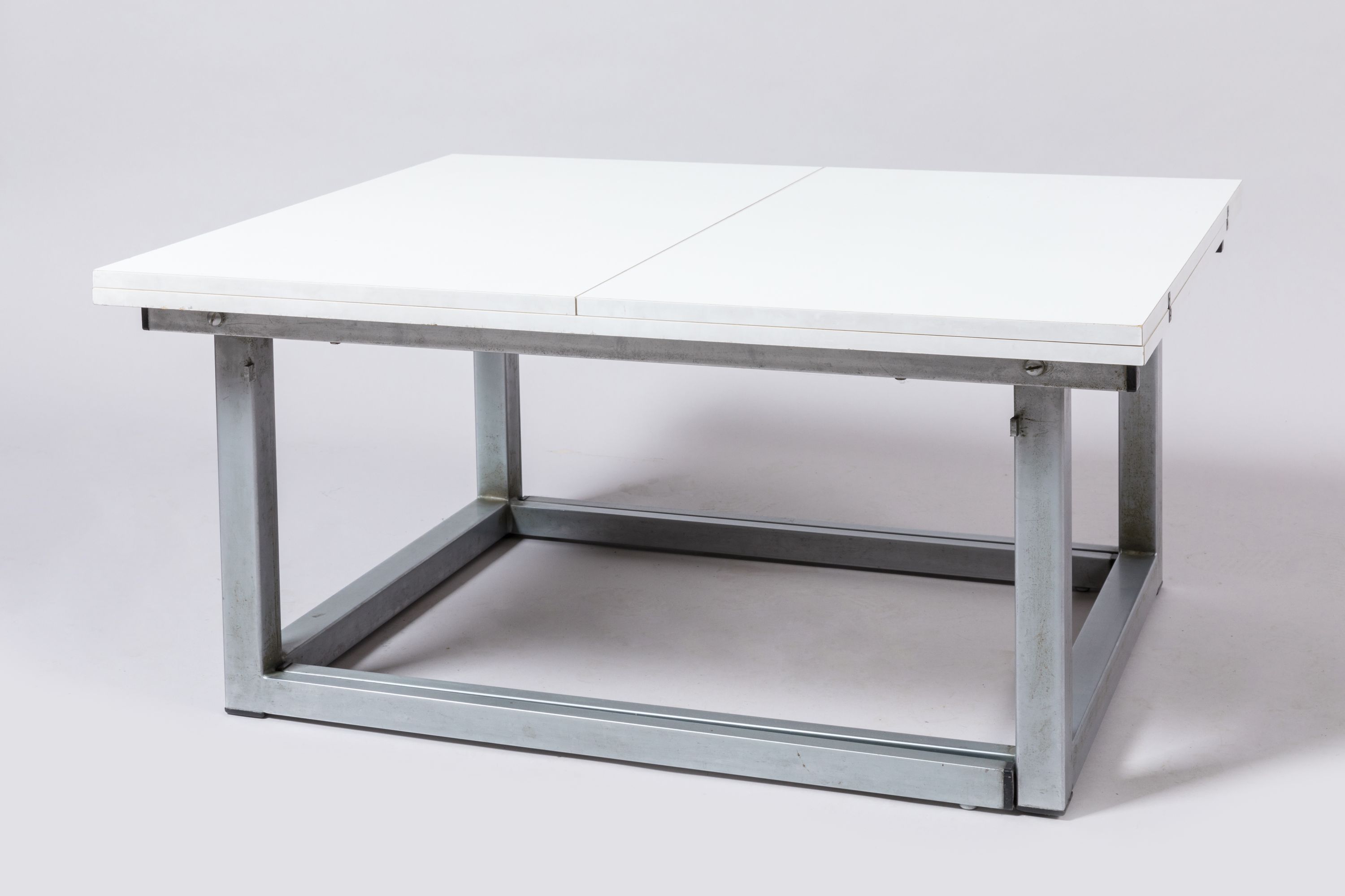 -TABLE DROMADAIRE dépliable, le plateau rectangulaire mélanine blanc, le piètement métallique.
