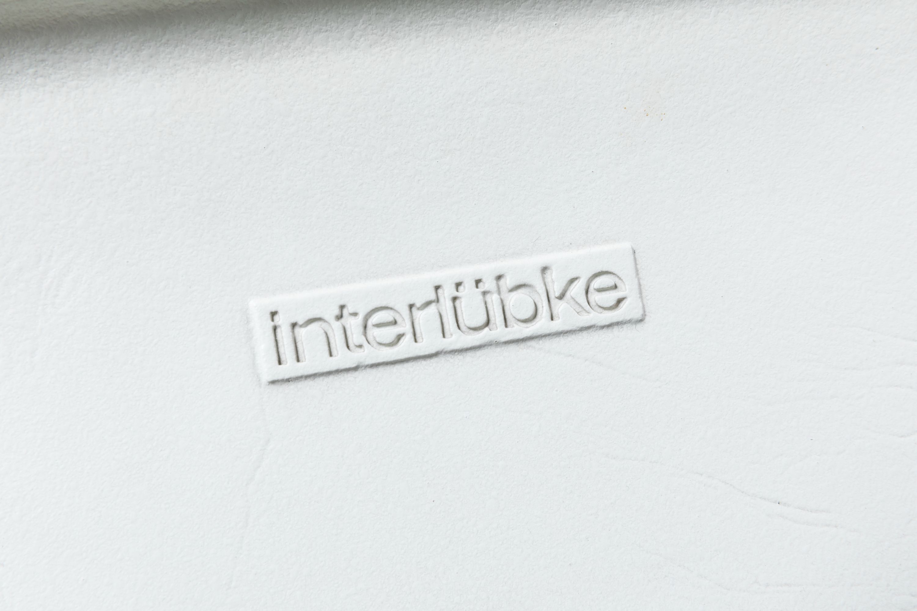 - INTERLUBCKE. Sept CHAISES pliables, piétement métallique, assise et dossier en plastique moulé blanc. Signées. Haut. 76, Larg. 48, Long. 44 cm.
