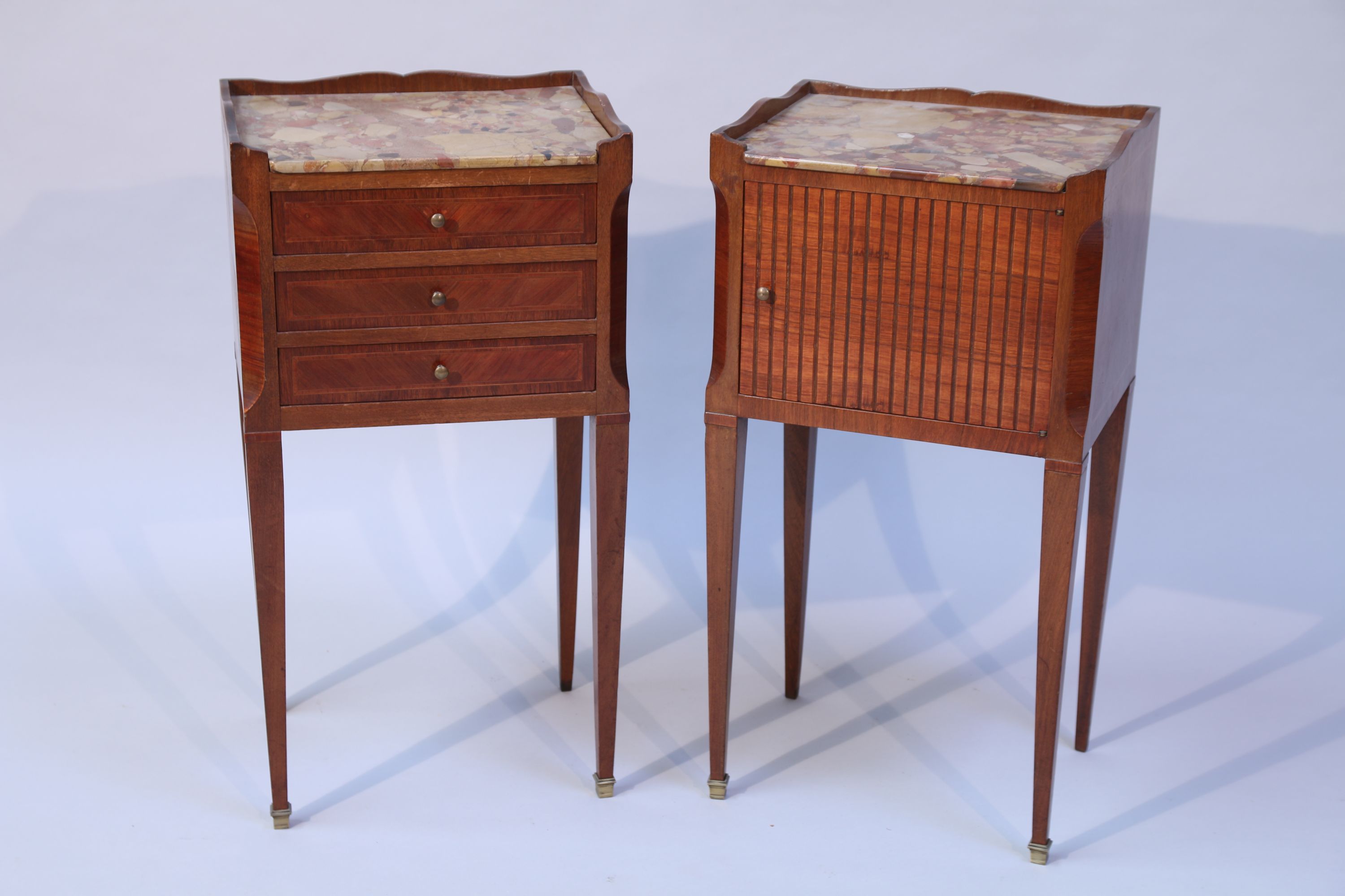 en placage d'acajou, marqueterie à décor de frisage. Le premier ouvrant par trois tirois, le second par une porte à l'imitation d'un rideau coulissant. Piétements en gaine.