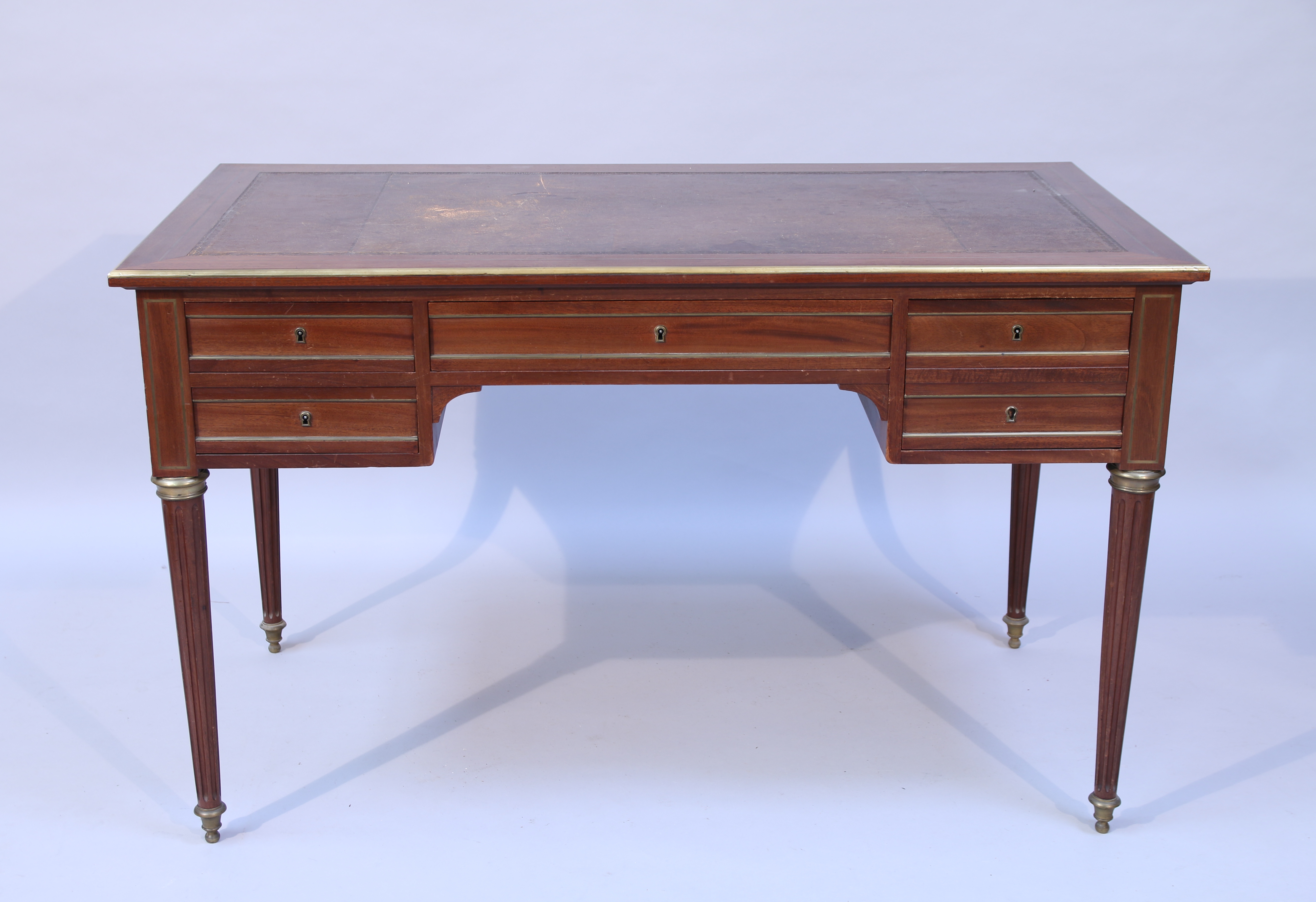 en acajou, ouvrant par quatre tiroirs sur deux rangs. Le plateau ceint d'une lingotière, garni d'un cuir estampé. Piétement fuselé et cannelé, orné de bagues et de sabots en bronze.