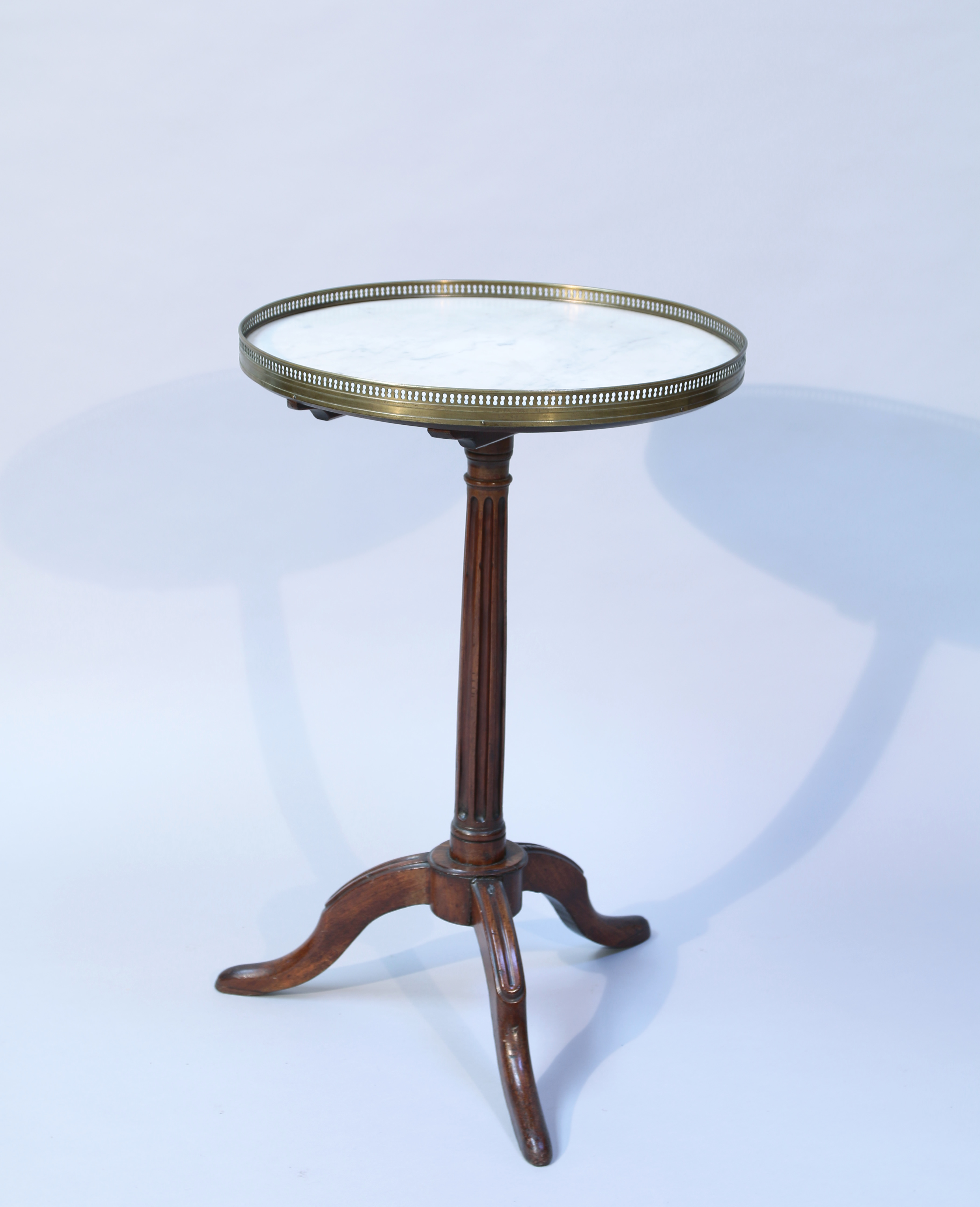 en acajou à fut cannelé sur une base tripode. Plateau en marbre de Carrare et galerie de laiton.