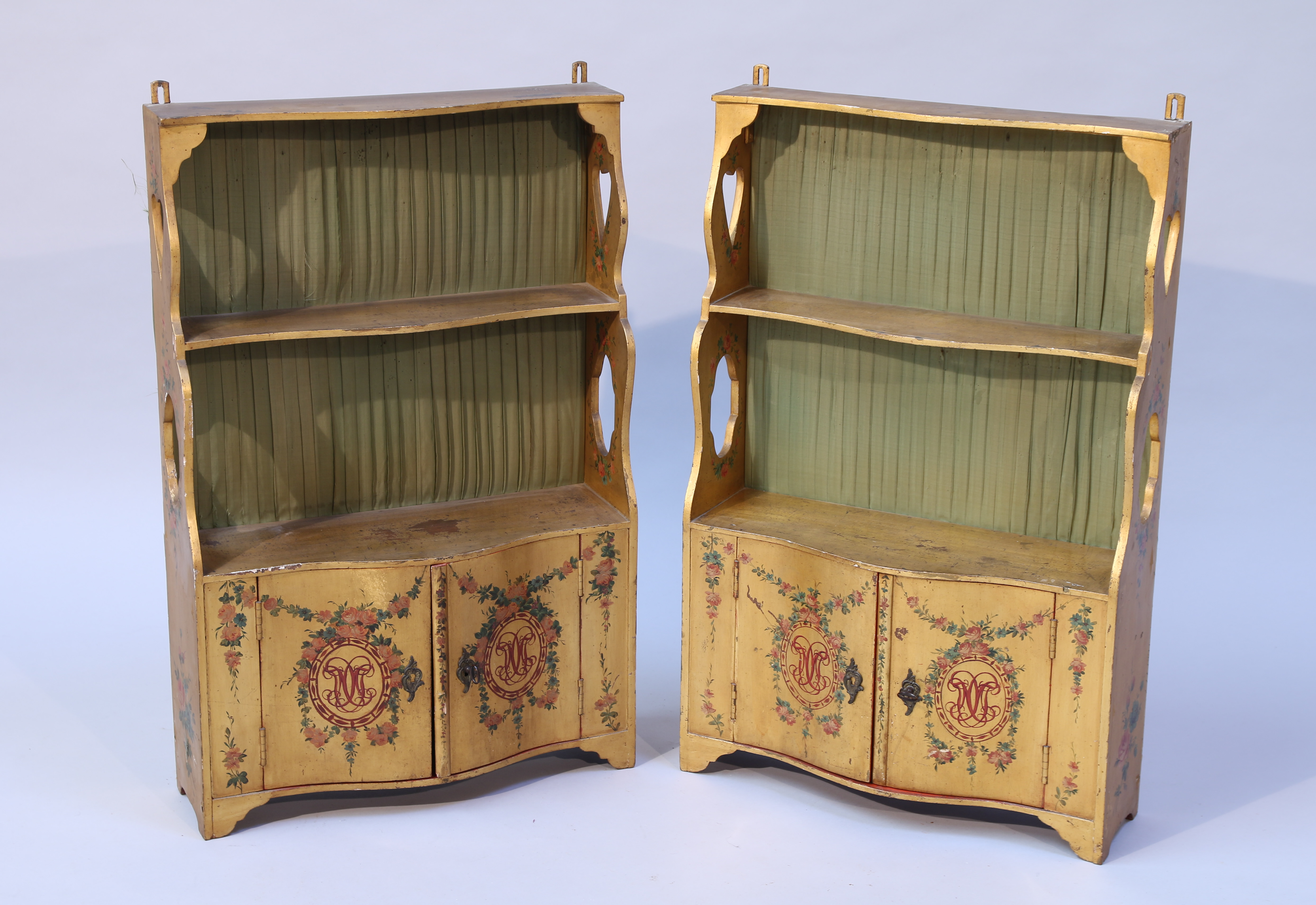 en bois façon vernis Martin doré à décor de roses et d'initiales "AM" enlacées, présentant quatre étagères dont deux closes par deux portes galbées. Deux encoches permettent d'accrocher ces bibus muraux.