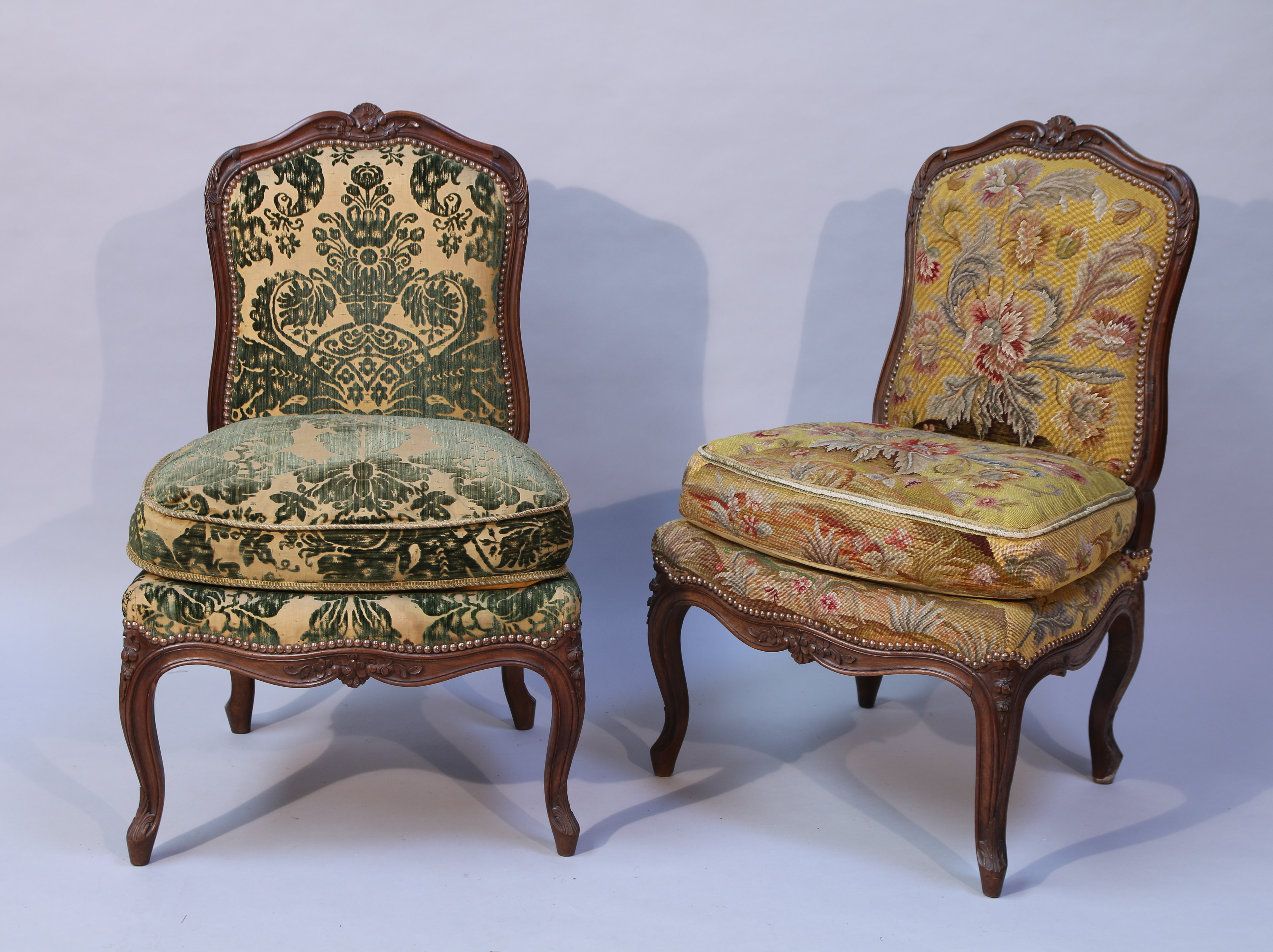 Les chaises basses à dossier plat en bois mouluré et sculpté de fleurs, épaulements feuillagés, reposant sur quatre pieds cambrés sculptés à l'avant et à l'arrière. Trois chaises recouvertes de velours vert et garnies de coussins, une chaise recouverte d'un tissu au point.